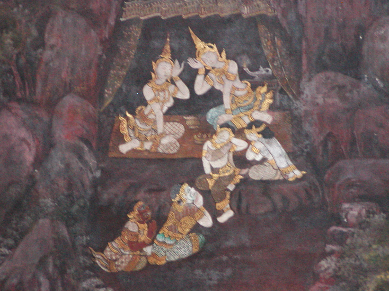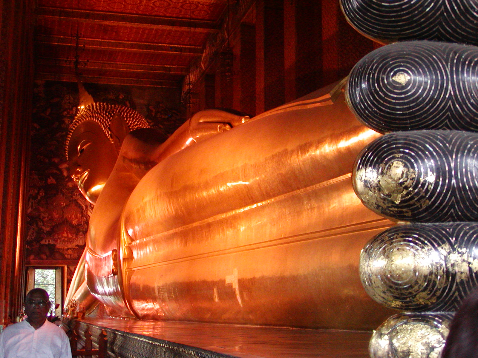 Back to Bangkok for a few days. Silvia, Uli and I did a little wat (temple) visiting today. We first went to Wat Pra Keo. As we were on our way there, we were stopped by a few taxi drivers and a “government worker” who informed us that, alas, the temples were closed due to a holiday. Well, most holidays in Thailand are religious ones, so I doubted that right away! This was even more apparent when they offered to take us to another temple for a small price! The scamming is too much! If you can only visit one temple in Thailand, Wat Pra Keo is the one. It is a beautiful complex showing a number of traditional Thai styles. I love the frescoes on the walls of the inner court that depict scenes from the Ramakien. The detailed work on the chedis and temples are not to be missed! It’s too bad that it rained a good part of the day, but that did not dampen our resolve! As the time was flying, we bypassed a lot of the old palace to get to Wat Po, which is nearby. It was interesting to see the Buddhist Lent ceremonies at the temples. People with flowers and incense walk around the main temple building three times. Also many people just hanging out– temples are very social places in Thailand. Wat Po with its 150-foot long reclining Buddha was a treat, especially the mother-of-pearl work on the feet.
