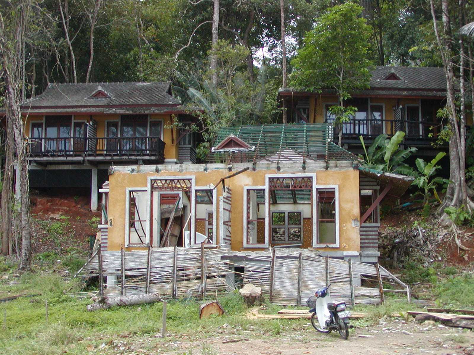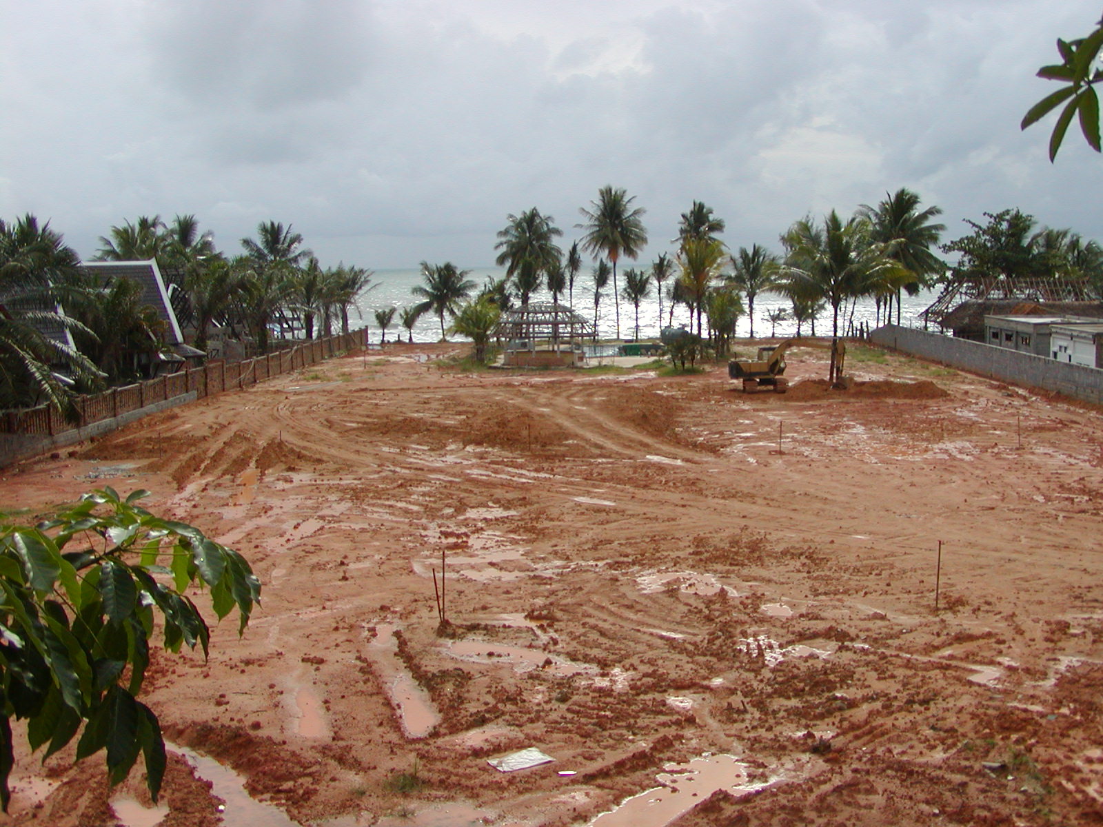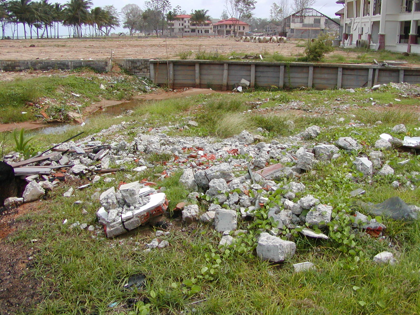 I am sitting here alone on the veranda of the Khao Lak Bay Front Hotel watching the sun slowly descending into the Andaman Sea. I feel like I am in a colonial period novel— all teakwood, dusk, overhead fans….. As you look out over the beautiful view, a closer inspection tells of darker days past. What was once, I’m sure, a beautiful pool area and gardens about half the size of a football field is now totally submerged in mud and water. You can just discern the outline of the pool itself and imagine how it might have looked last December 26th morning before the tsunami obliterated it and about 10,000 lives up and down these beaches.
