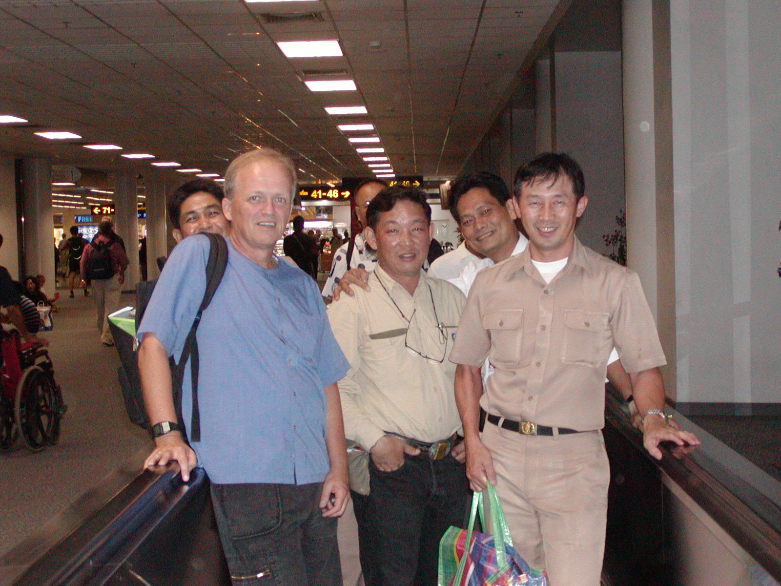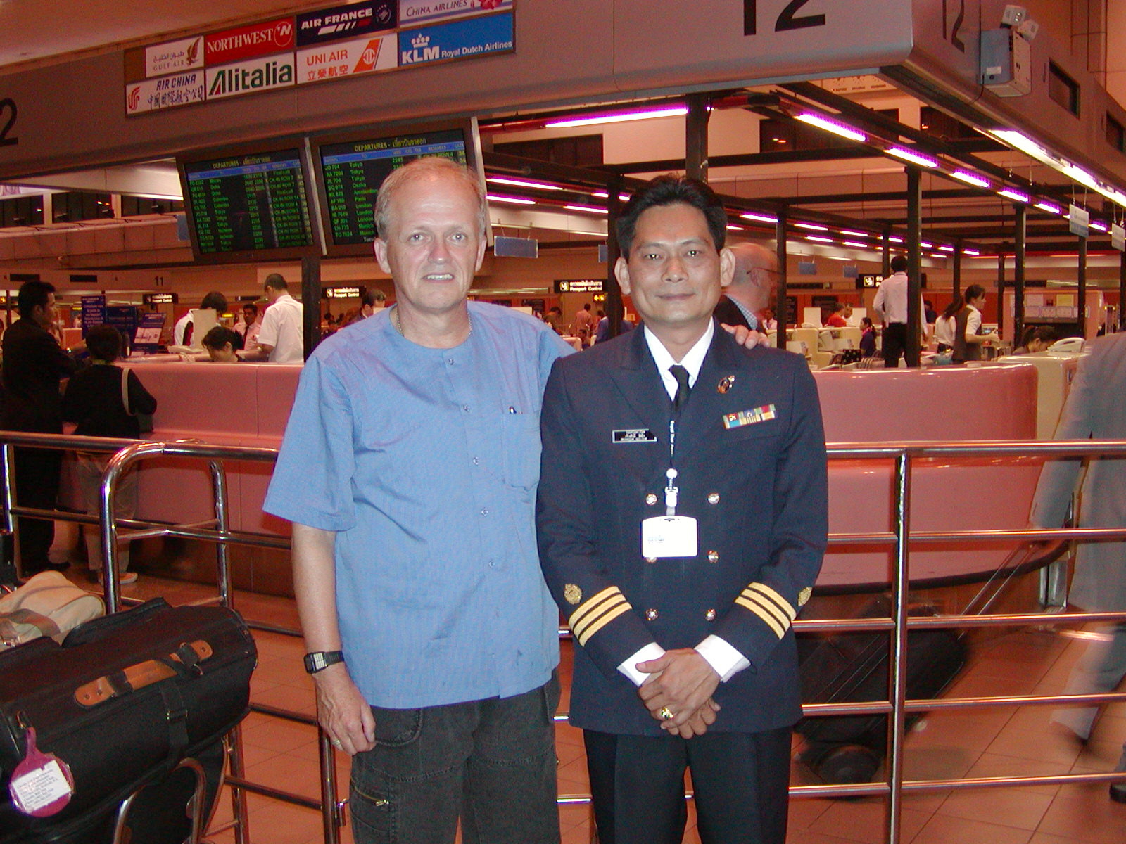 Today, I am running around doing all the last-minute things you always do when there is “one more day” needed! Spending the afternoon with a friend wandering around the city and then back here for dinner with two former students. They both arrived in the hotel lobby with uniforms on! I was most impressed. We saluted and went to dinner at a restaurant down the lane. Well, let’s say, I had dinner, they had appetizers and beer! I had so much stuff that they had to follow in one of their cars to the airport. We were met by Reungsak at the curb as he was expecting us. He started to laugh when he saw the three bags! He asked me why I had so much stuff and I responded that he should ignore the ancient artifacts I stole that are in the bags! He just gave a suppressed, yet still over-the-top sigh. Even as a kid we used to joke around like that. As it ended up, one bag was overweight, so I had to take a few things out to lighten it up. That was fine as I had thought of that possibility and brought some nylon bags with zippers. After that, my passport and luggage disappeared for check in and passport stamping. We spent the time in the airport lounge as Saard and a few others joined us. More beer and then it was time to get to the gate. Thanks to Reungsak, they all walked me all the way to the gate. We sat around and talked till the flight was called and then it was time to board the plane.