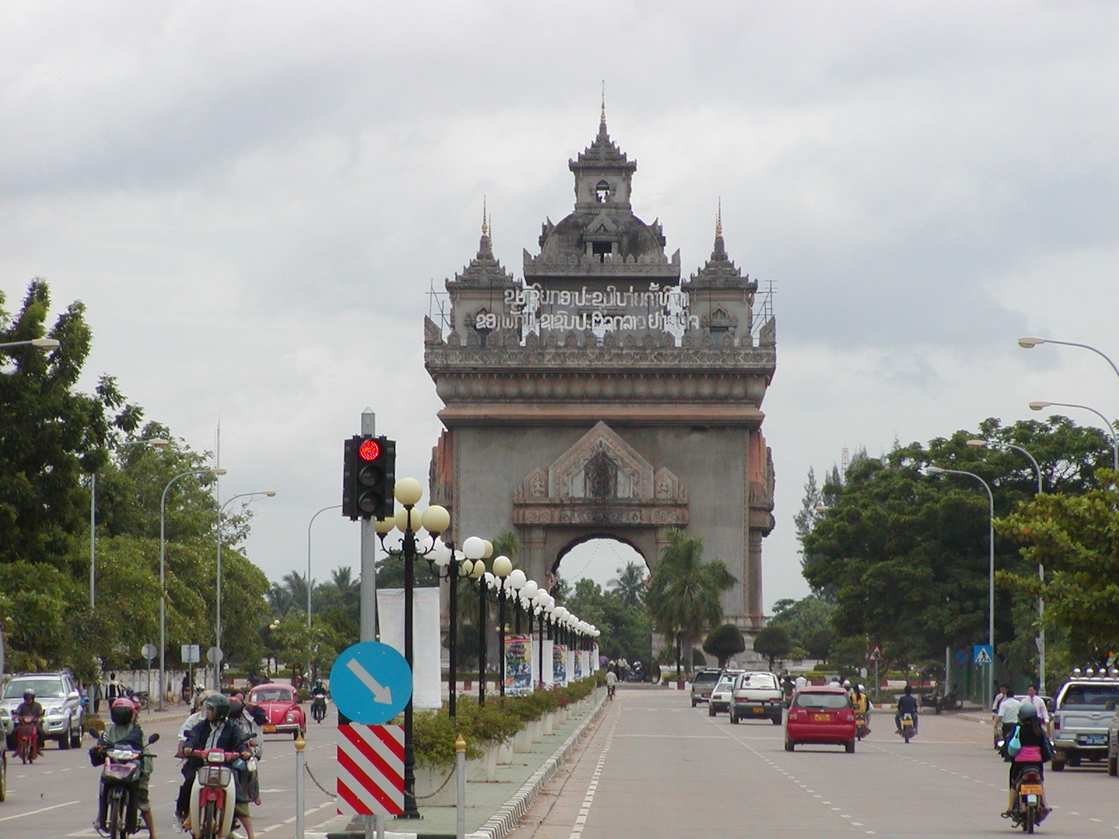 The weather here is just as hot and humid as in Bangkok. I thought it would be at least a little cooler! It has threatened to rain, but no major downpours yet. You just have to slow down and drink a LOT of water. I love walking everywhere… sometimes all day to the most remote places in the city. It really is a wonderful city. Walked to the Patuxai, the victory monument that looks like the Arc de Triomphe…. This arc was never completed and is really beginning to get delapidated looking. I think I recall that it was built with cement purchased from the US for a runway at the airport. Well, the top two floors are now taken over by the ubiquious T-shirt vendors and silver sellers.