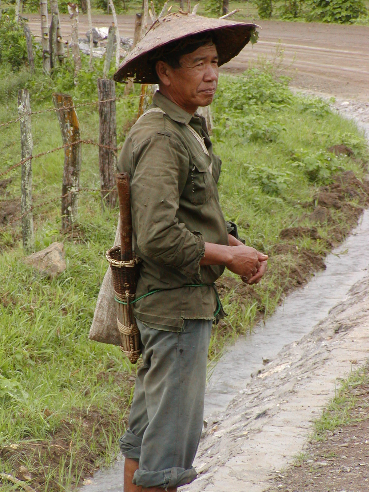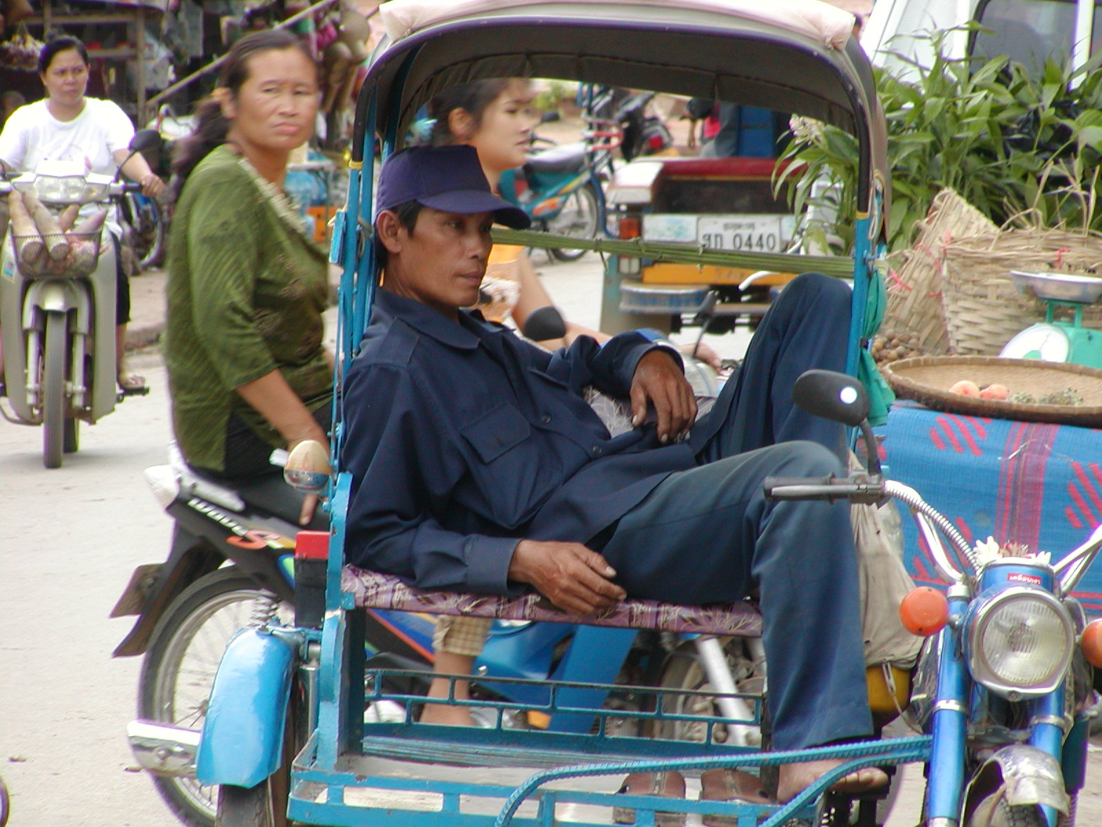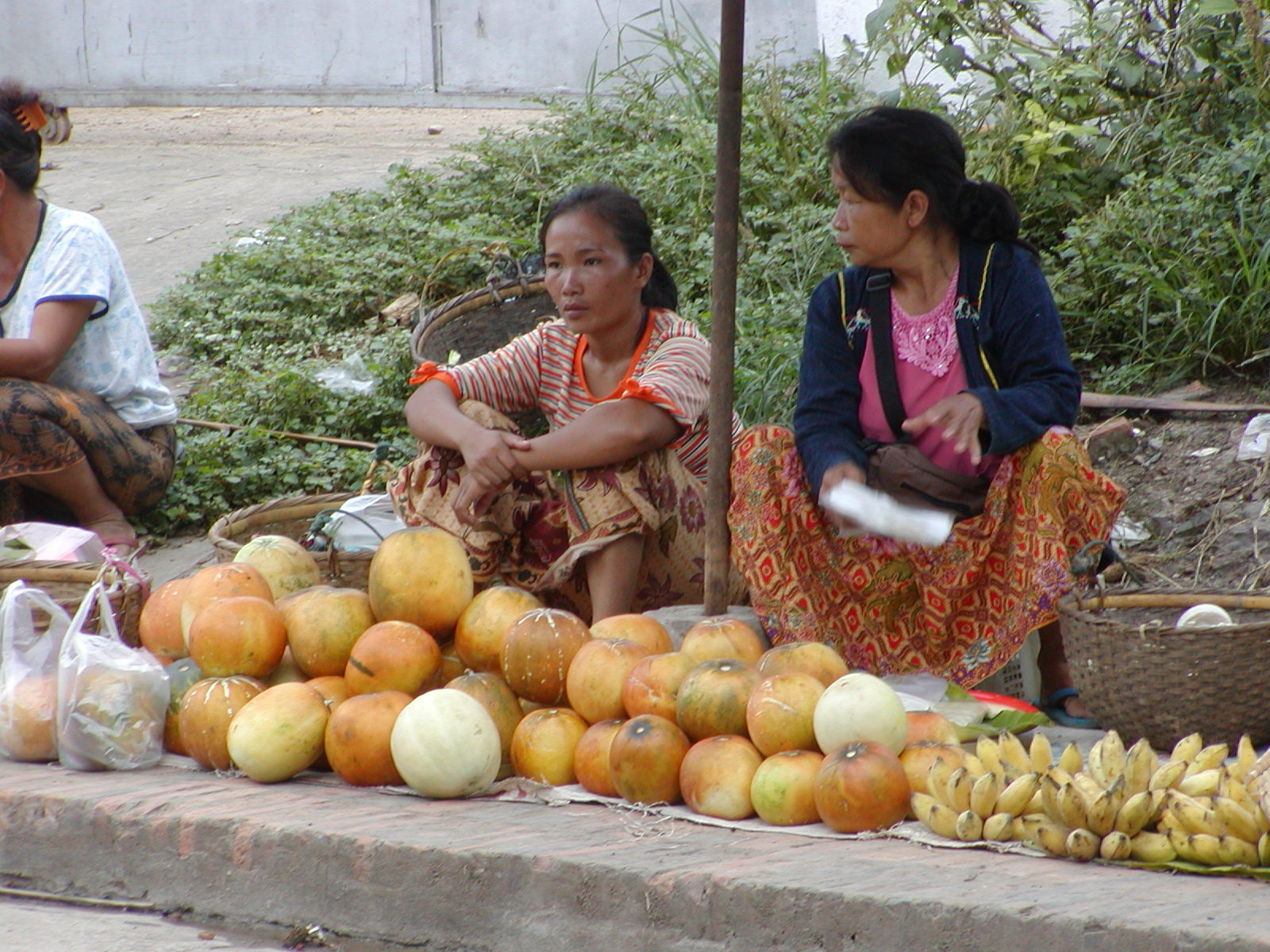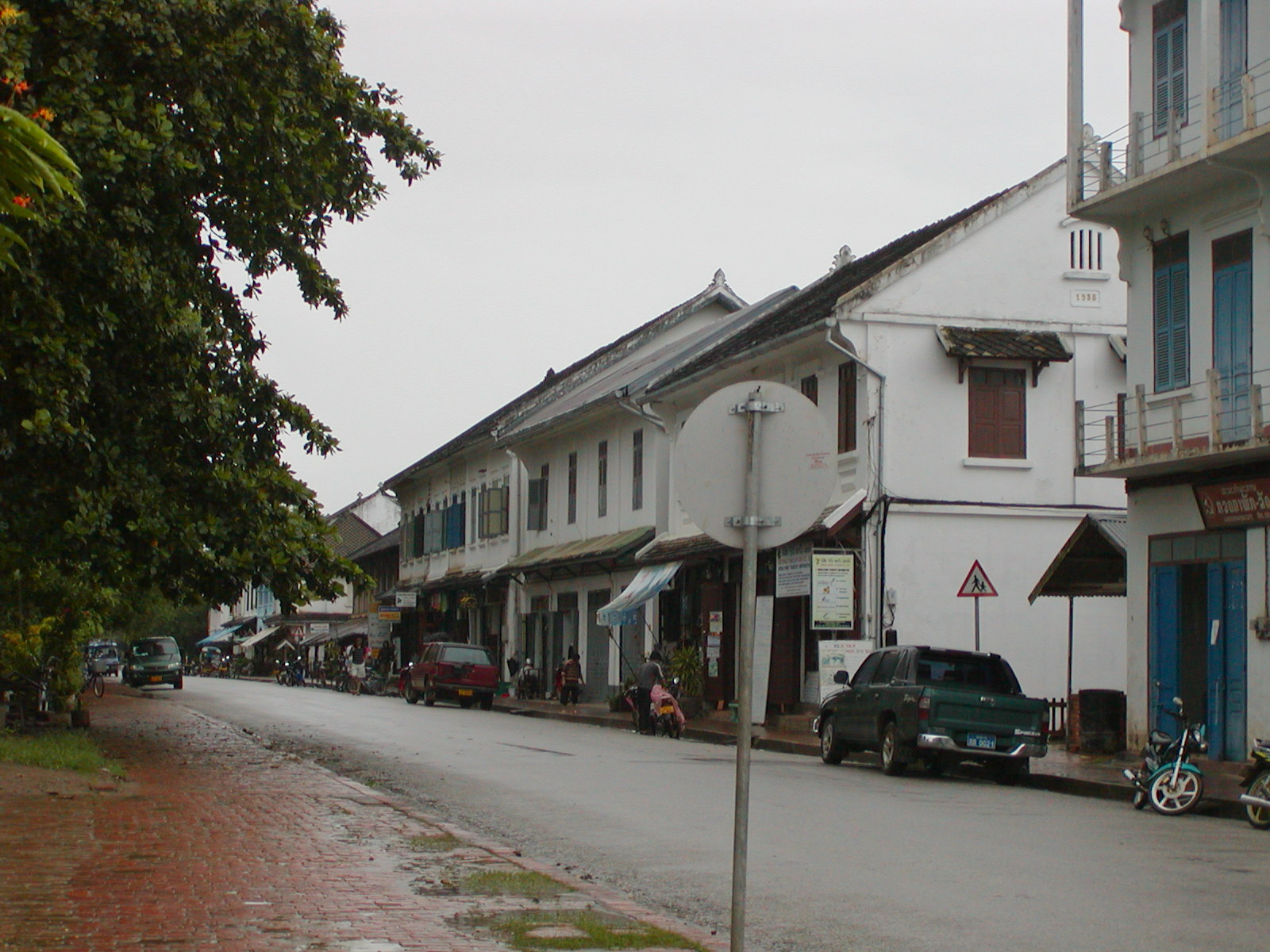 Walking through the drizzly streets of Luang Prabang tonight. The smell of ripe saparote (pineapple) rinds– decaying. The tip and tap of the rain on my umbrella; the rustle of the heavy plastic tarps; the hollow sound of the metal poles falling on concrete– the 9:30 sounds of the night market beginning to close. Old Hmong ladies cackle in complaint that the rain is getting their “bandaw” (embroidery) wet. Some of the ladies wait by candle light for the last of the tourists to leave— their quiet, desperate, pleading stares hoping you’ll be just one more sale before they pack to go home. One last T-shirt, scarf, wall hanging or trinket, sir? Their desperation is mirrored in the soulful sound of Billie Holidae coming from some unknown place as I leave the market area and make my way up Sisavangvong Road still full of foreigners– lingering— one last slice of pizza, cup of coffee, email home, a word to a friend in a cafe. Passing Nazim’s Restaurant sounds are unmistakenly Lao– a song playing, laughter of some children, the sputtering of a tuk-tuk (three-wheeled taxi). As I continue to make my way to the Calao, my eyes adjust to alternating harsh glows of bare florescent lights; the soft, colorful cheery paper lamps of the restaurants along the quai on Ounkham Road. Here and there a stately, almost colonial, look of the lamp posts.