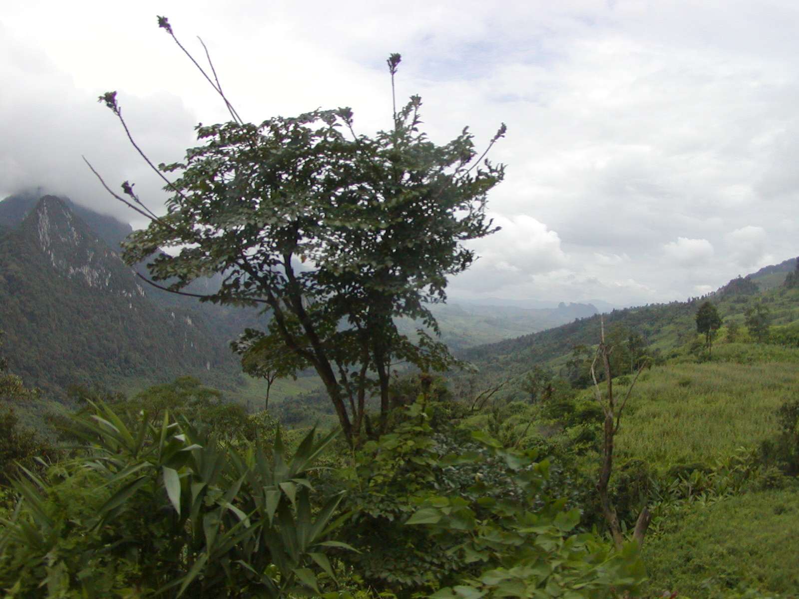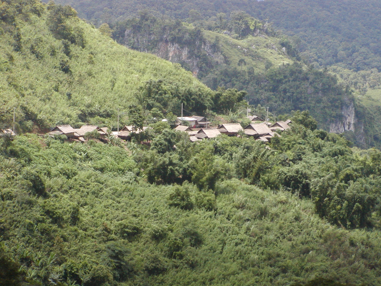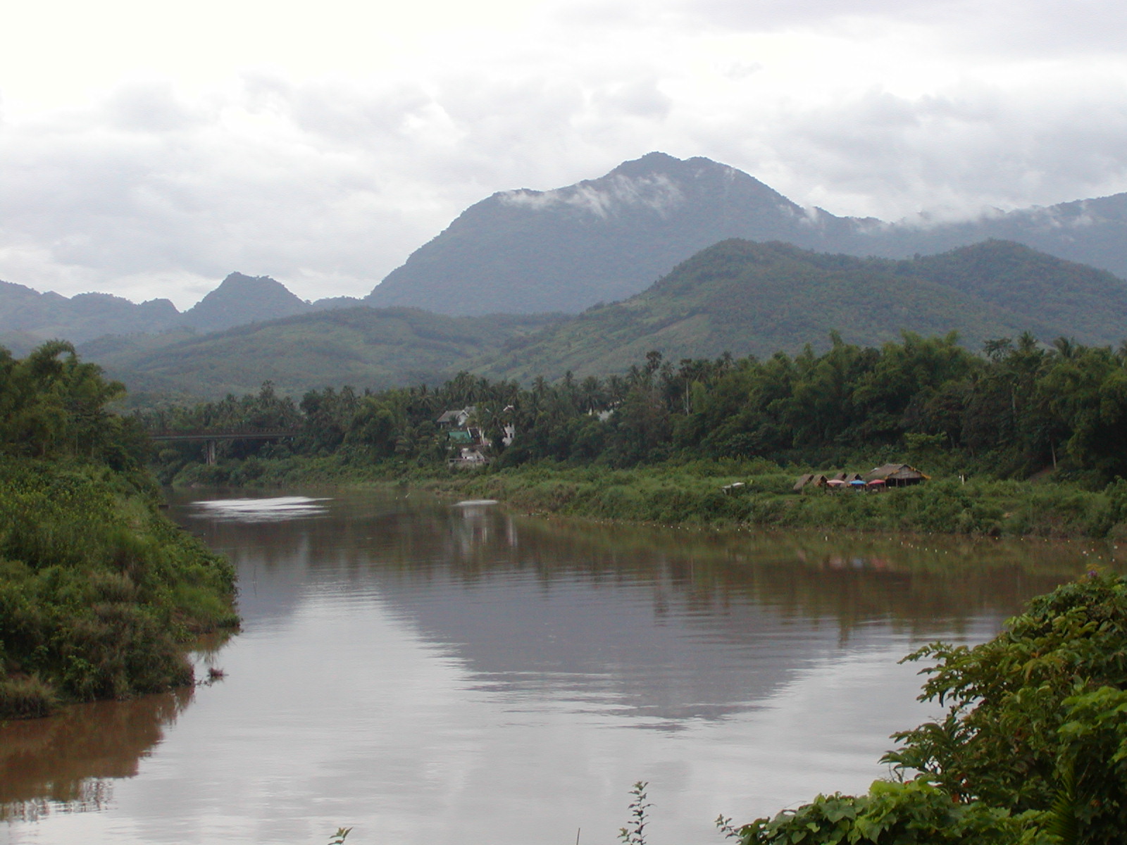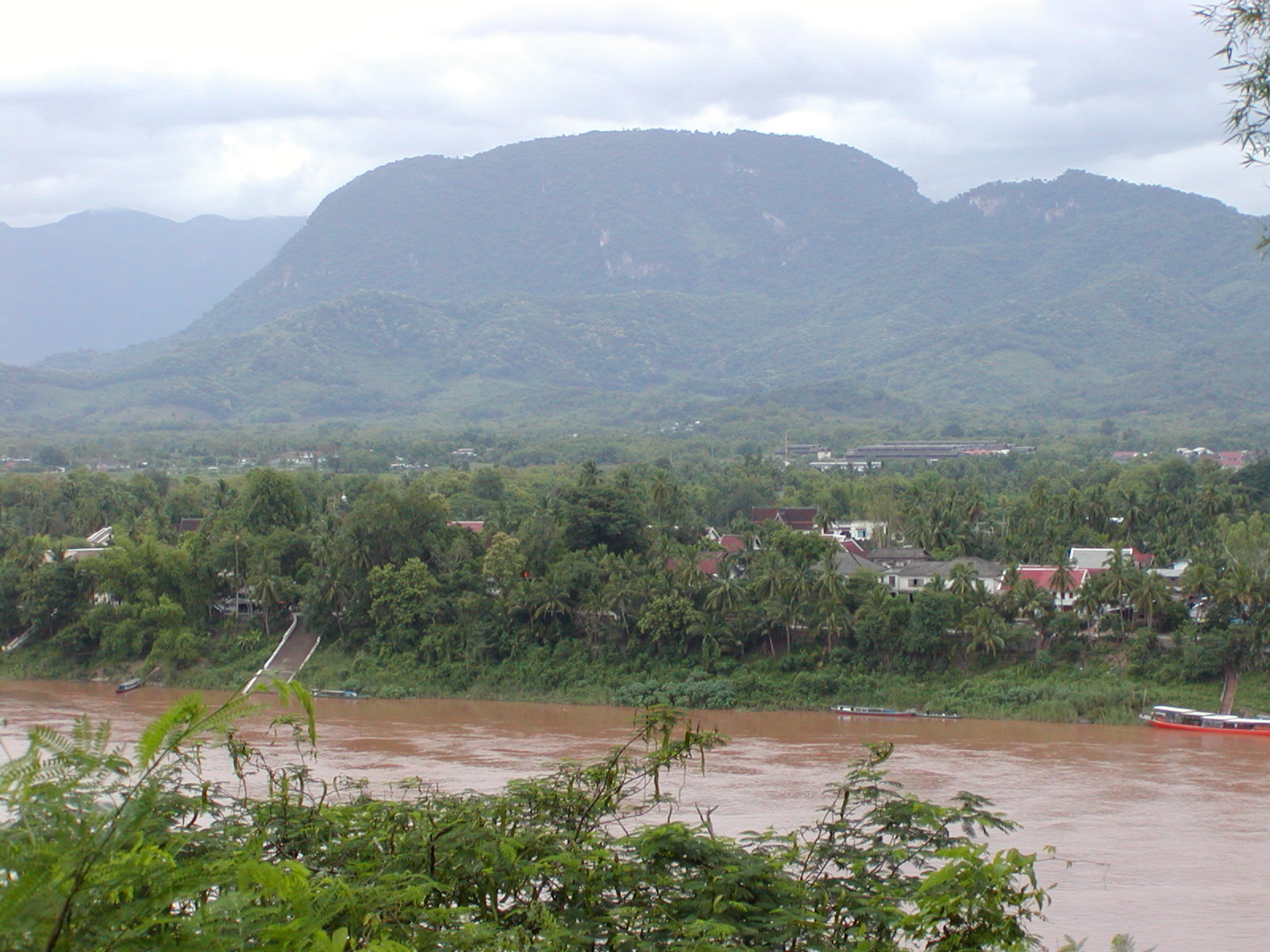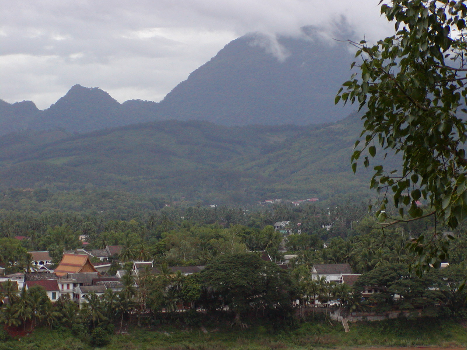 The trip up here from Vientiane was incredible. We quickly passed through the Mekong River plains to the foothills of the mountains. We went through Vang Viang, an astoundingly beautiful place with large limestone outcroppings and verdant gorges. Unfortunately, I was on the right side of the bus, so I didn’t get many pictures. With the exception of a 30 minute stop for lunch, we spent 5+ hours weaving our way through the mountains. Route 13 is a fairly good sealed road, but the absence of guard rails and traveling a hair’s breath away from certain doom is both thrilling and heart-stopping scary! We passed through villages of lowland Lao, Hmong, stands of bamboo bending toward the road as if waving to us, teakwood, slash-and-burn farms, mountain corn and terraced fields of rice. The terrain all decked out in its tropical rain forest splendor. We arrived just in time as the brakes were so over-used going through the mountains that they were squeaking wildly by the time we entered Luang Prabang.
