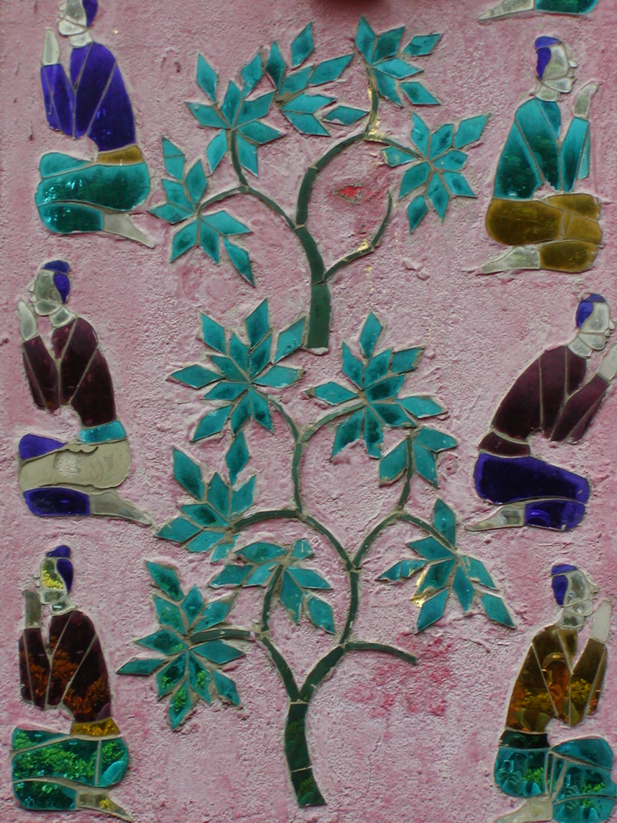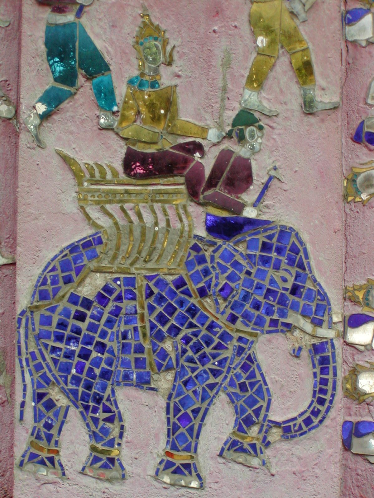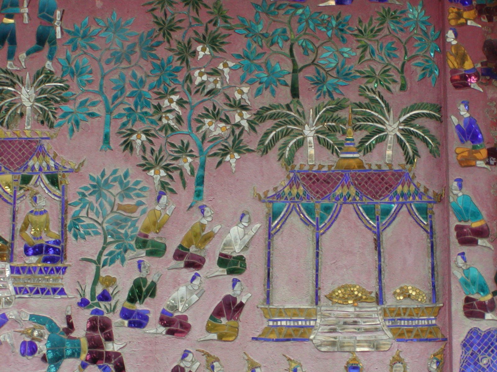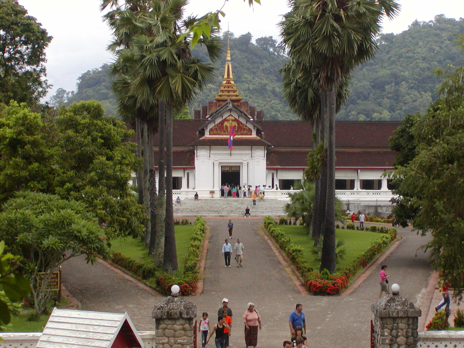 There are two wonderful temples that give awe-inspiring views of the city. I took a boat across the river to Wat Chom Phet. It was quite a climb up the steep stairway in the high humidity. Along the way I somehow acquired a bunch of little tour guides from the village that is at the base of the stairs. I give them 5000 kip (about 50 cents) for a floral arrangement to leave in front of the Buddha in the old, abandoned temple. I know fully well that they will think nothing of taking these flowers and offering them to the next tourist who happens by. I spend about 25 minutes taking in the magnificant view of the city. I then make my descent to the boat, with my guides on tow asking for money the entire way. I meet an wizen old man toting a basket full of overripened jack-fruit. I offer him a ride over to the city in the boat. Along the way he wants to know if I am French. He fought in the French colonial army when he was young, but that is all he will say on the matter. People like him were sent to “reeducation camps” in the mid-70’s. I also climbed Phousey, the large hill that dominates the middle of the city. From the temple up top, Wat Chomsi, you can see in every direction. There is a wonderful museum at the foot of the hill that once served as the royal palace. Laos has its own Romanoff story…. The king, the queen and the crown prince were arrested after the 1975 revolution. They haven’t been heard from since. People say that they all perished from neglect in a remote part of the country. The rooms of the palace are left the way they were the day fo the revolution. I am surprised at how spartanly furnished the rooms are considering. The throne room is spectacular. The walls covered with scenes of everyday life in Laos, all done in Japanese colored glass. Some of this glass can also be seen on the walls of one of the outter buildings at the main temple in the city.