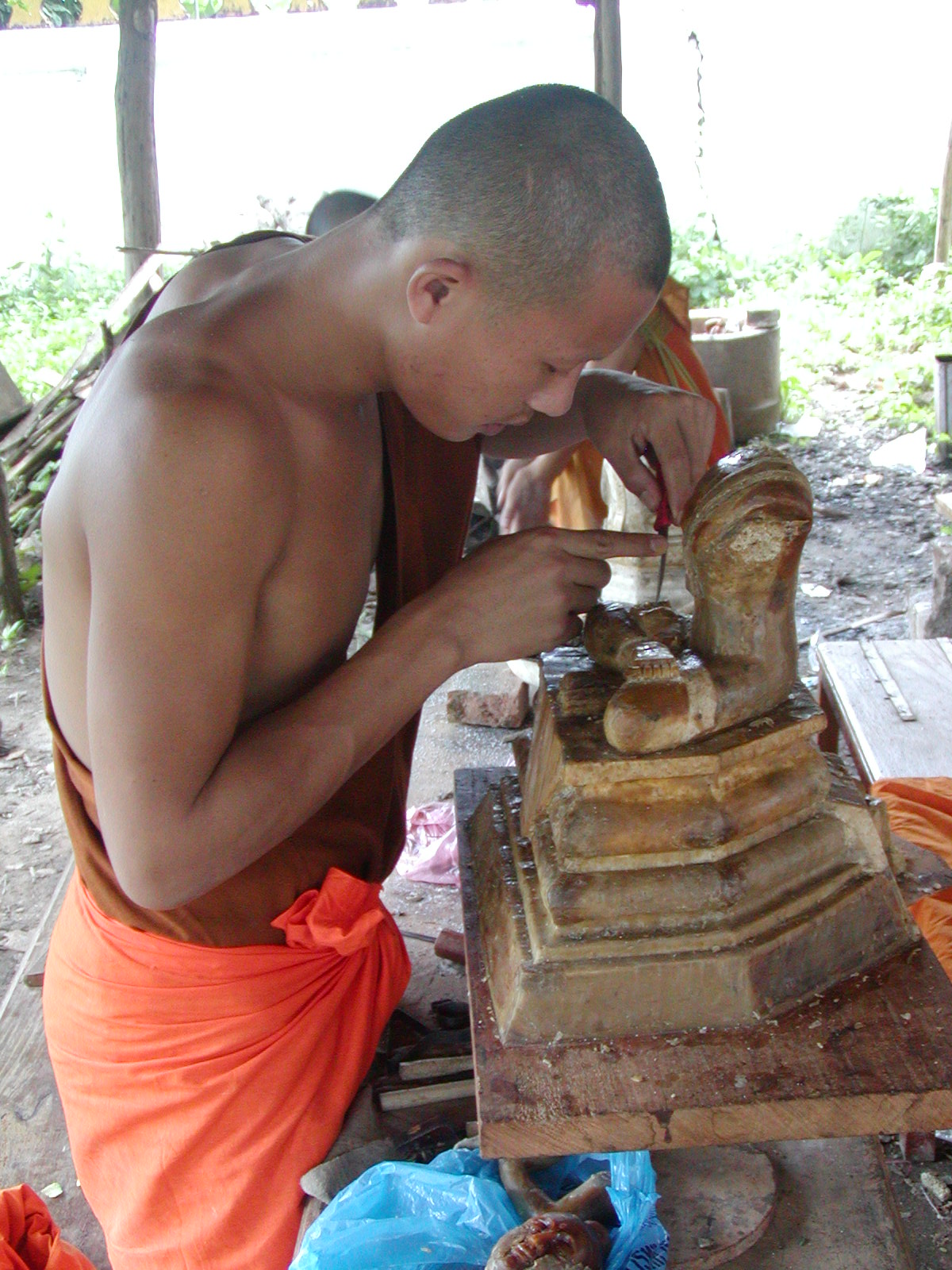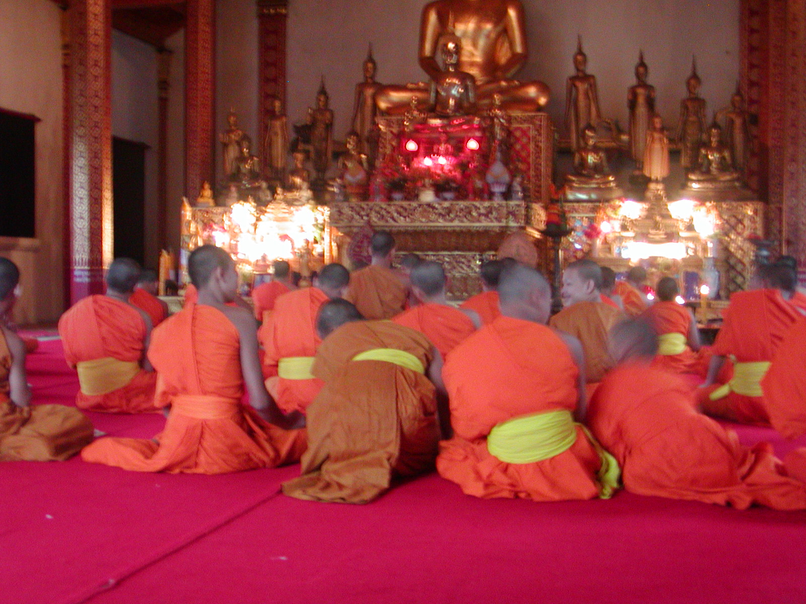 The city is full of temples and also filled with boys serving as novice monks so that they can get some sort of continuing education. I have spent a lot of time at the temples talking to the monks and getting an interesting perspective on their way of life. Most of the novices are doing it to make merit for their parents as well. Many, it seems, would rather be studying in a regular school. I can’t tell you how many aspire to go to college to learn English and get a degree. Last night I went to hear the monks doing their 6 PM praying. I quietly passed into the temple as they were chanting. I was so concerned about being discrete and respectful about videotaping as unnoticed as possible not wanting to disturb them…. Well, there were 5 novices in the back throwing spit balls at each other most of the time! Reminded me of my experiences at Infant Jesus School!