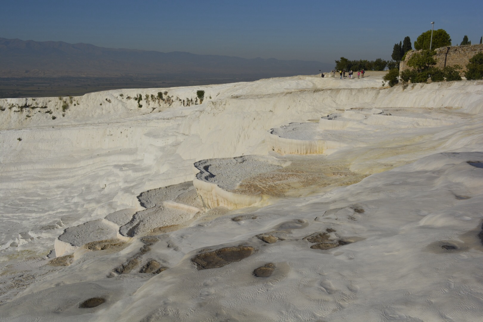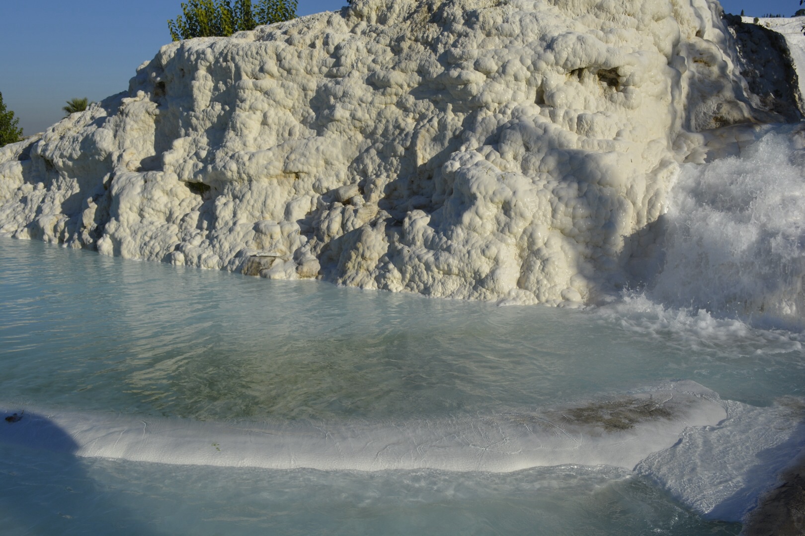 We left the village of Pamulkkale in the morning and made the short hop to the ancient hot springs nearby and the adjacent site of Hieropolis. The hot springs were tiered levels that have deposited white layers of travertine, a white residue that looks like ice which is formed from the calcium and carbon dioxide. There are little areas along the tiers were you can bathe or just sit there with your feet in the water.
