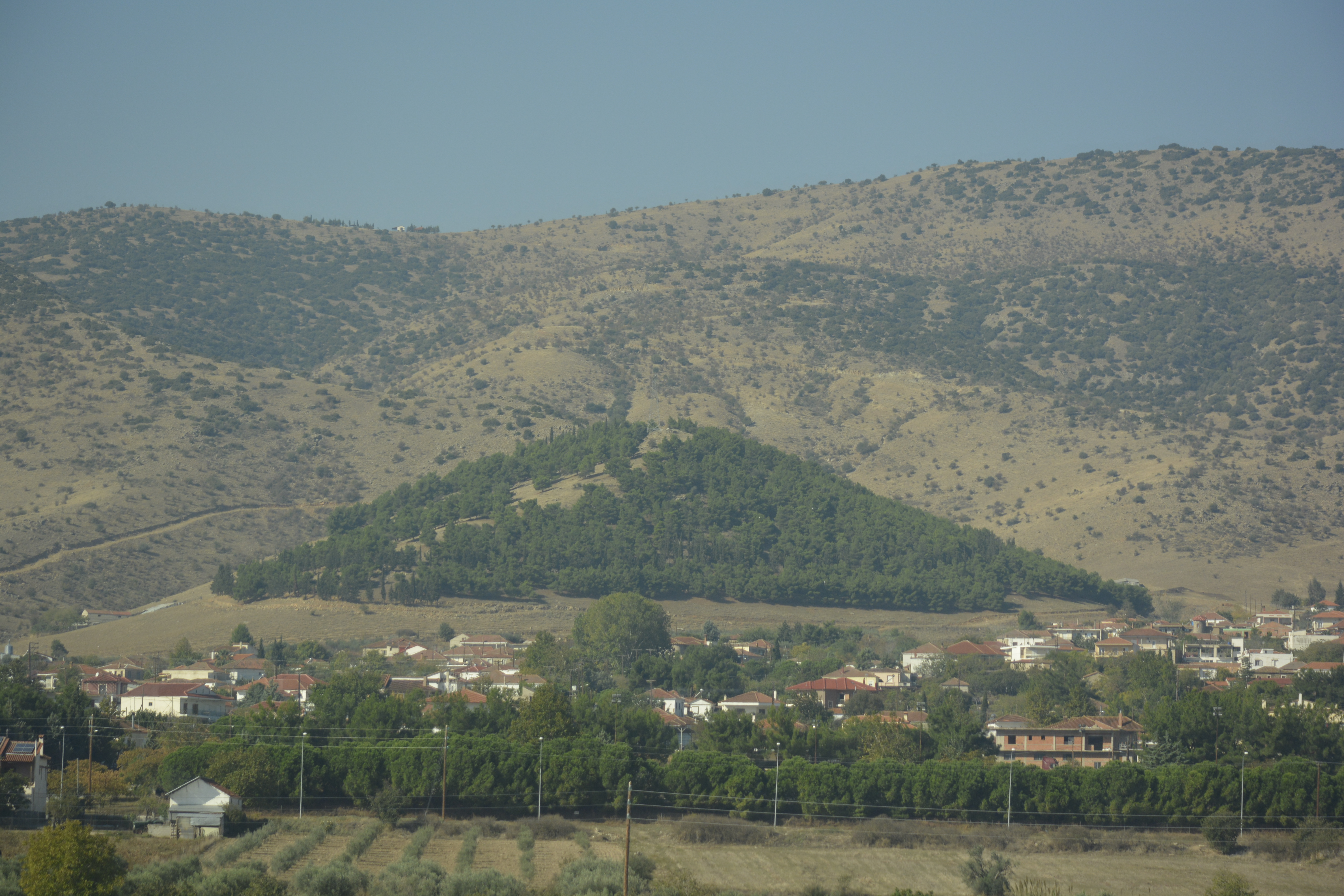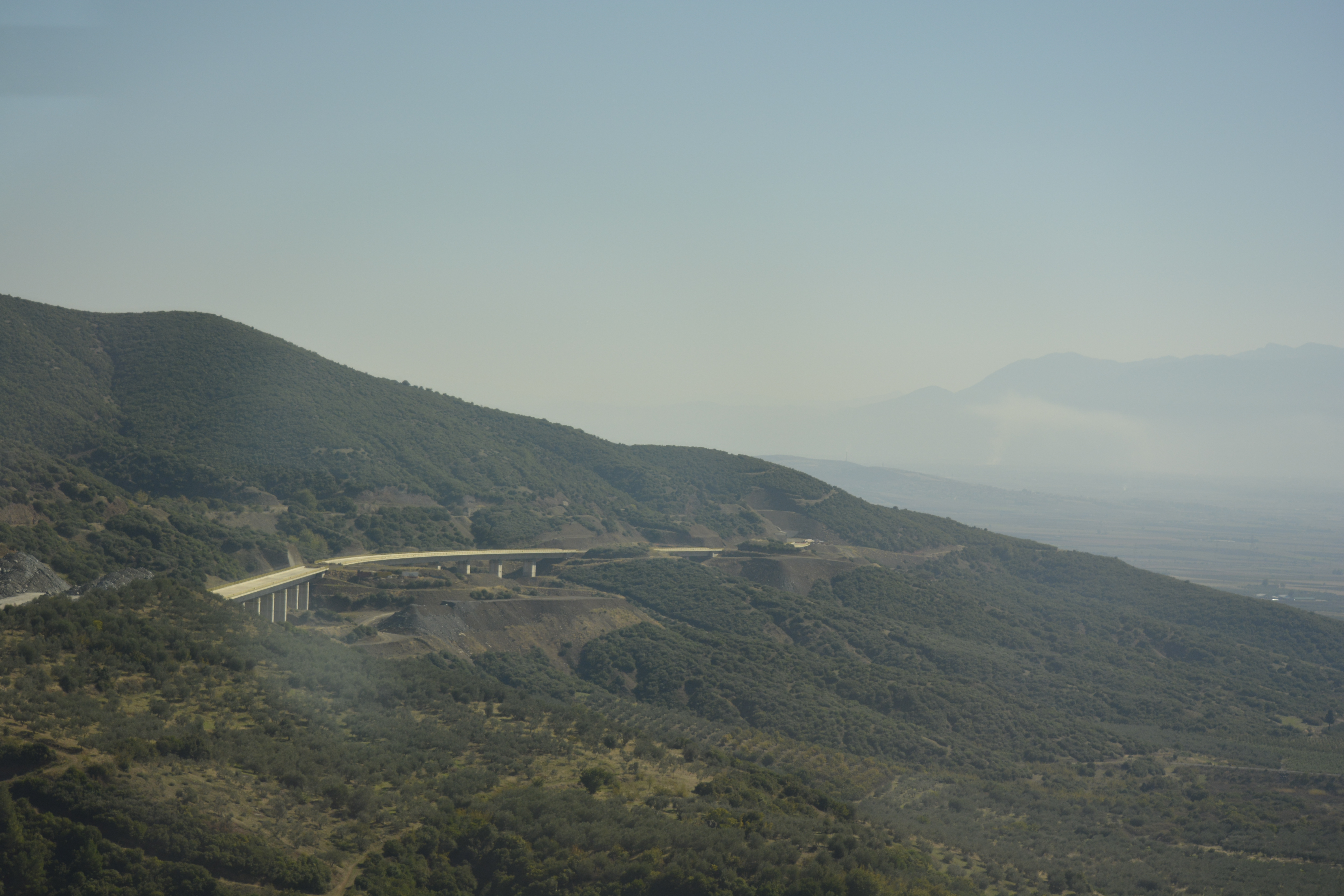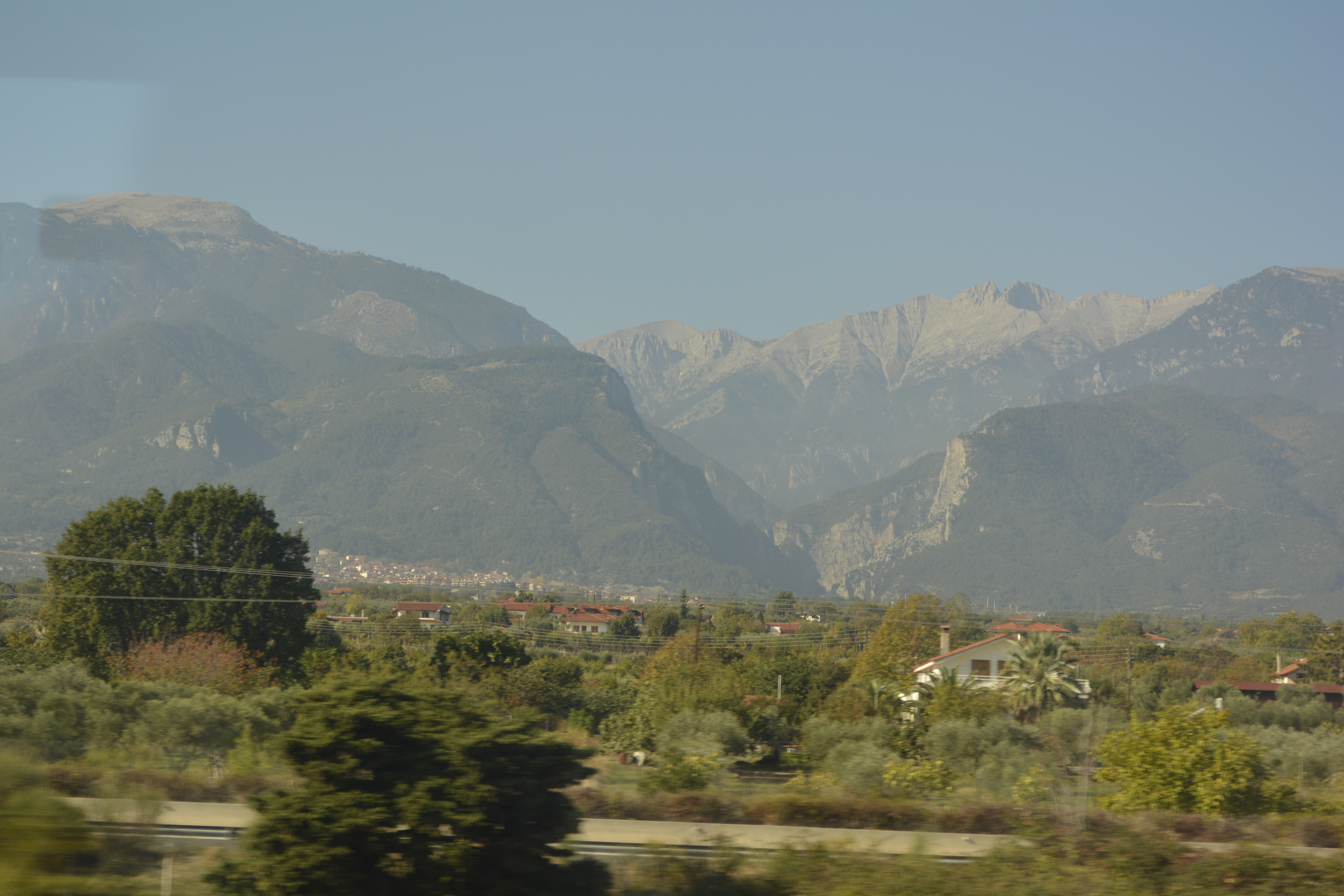 I boarded the train and quickly found the compartment that was to be my refuge for the next 6 hours. There are 6 comfortable seats and a window that was actually clean. Unfortunately, the glass was polarized which made photography less than ideal. My only companion was a 16 year-old Greek girl who spoke no English, so she retreated into her world of calling and texting friends when she was not sleeping. I passed the time enjoying the countryside and occasionally reading. The landscape was, as you would expect, hilly to mountainous with quaint little valleys dotted with houses and villages. This is, as usual, a much more interesting way to travel thorough a country than by flying. About half way, we stopped, and the smokers made a mad dash for the exits. They hung out in small groups enveloped in clouds of smoke. I welcomed the stop to stretch my legs a bit.