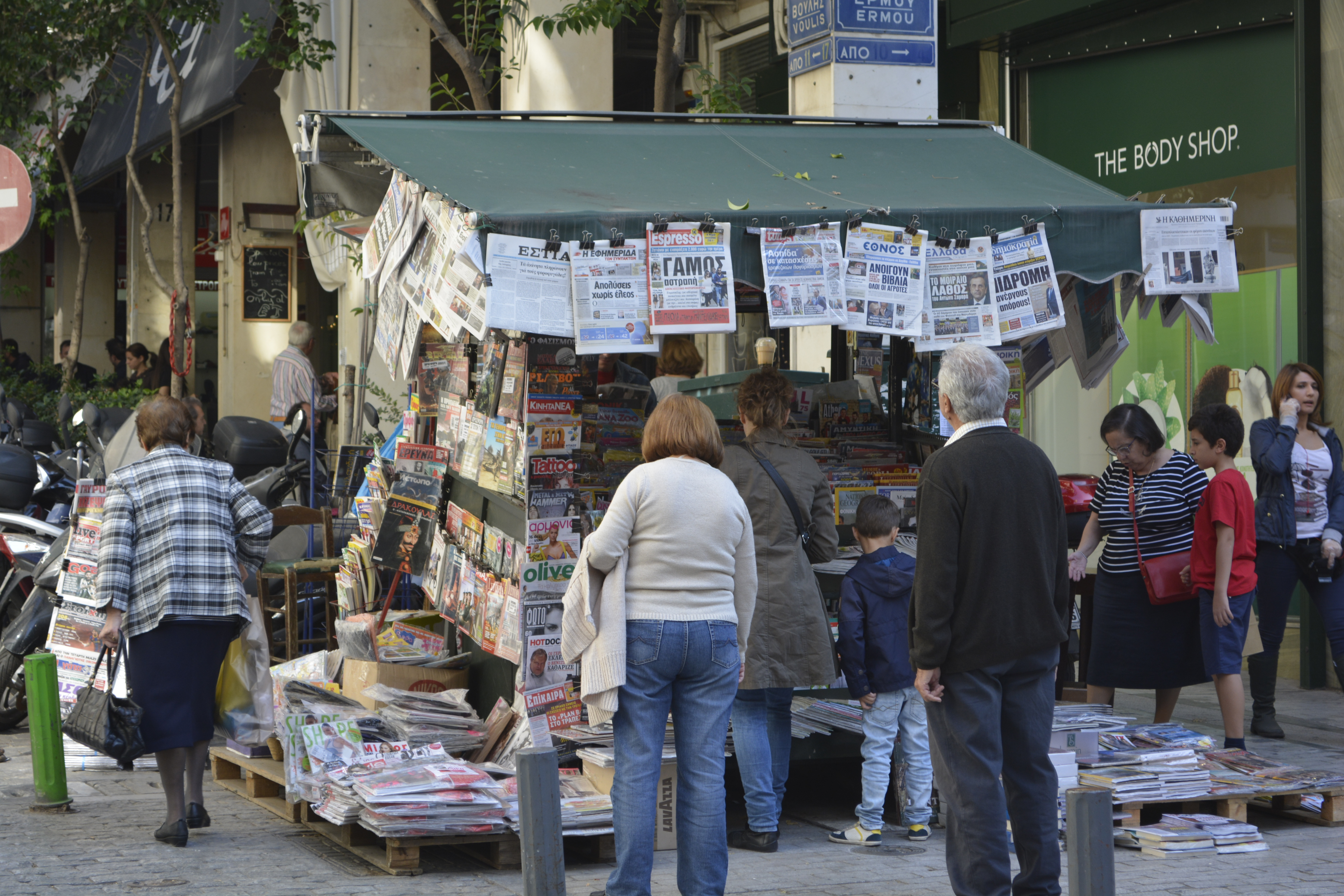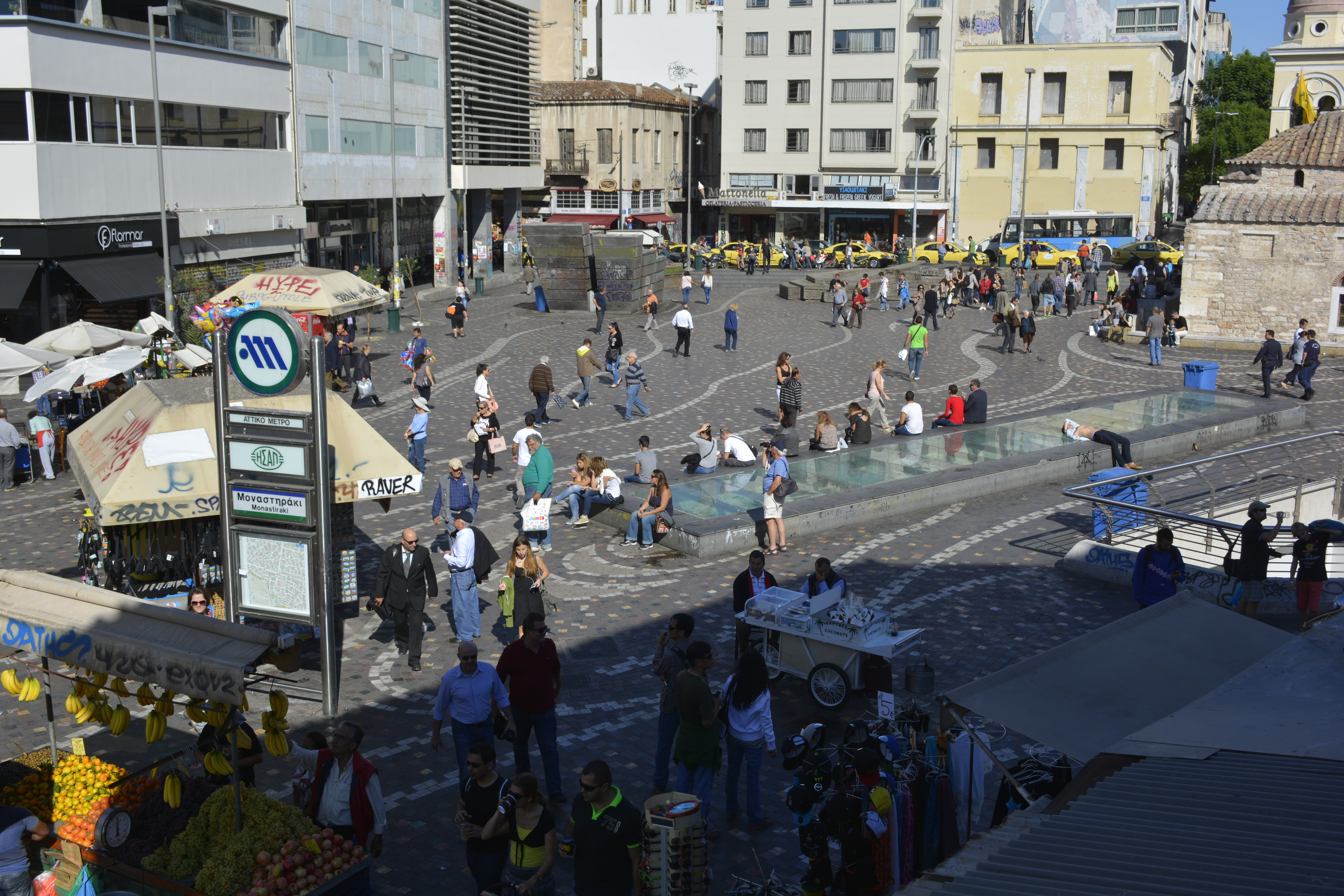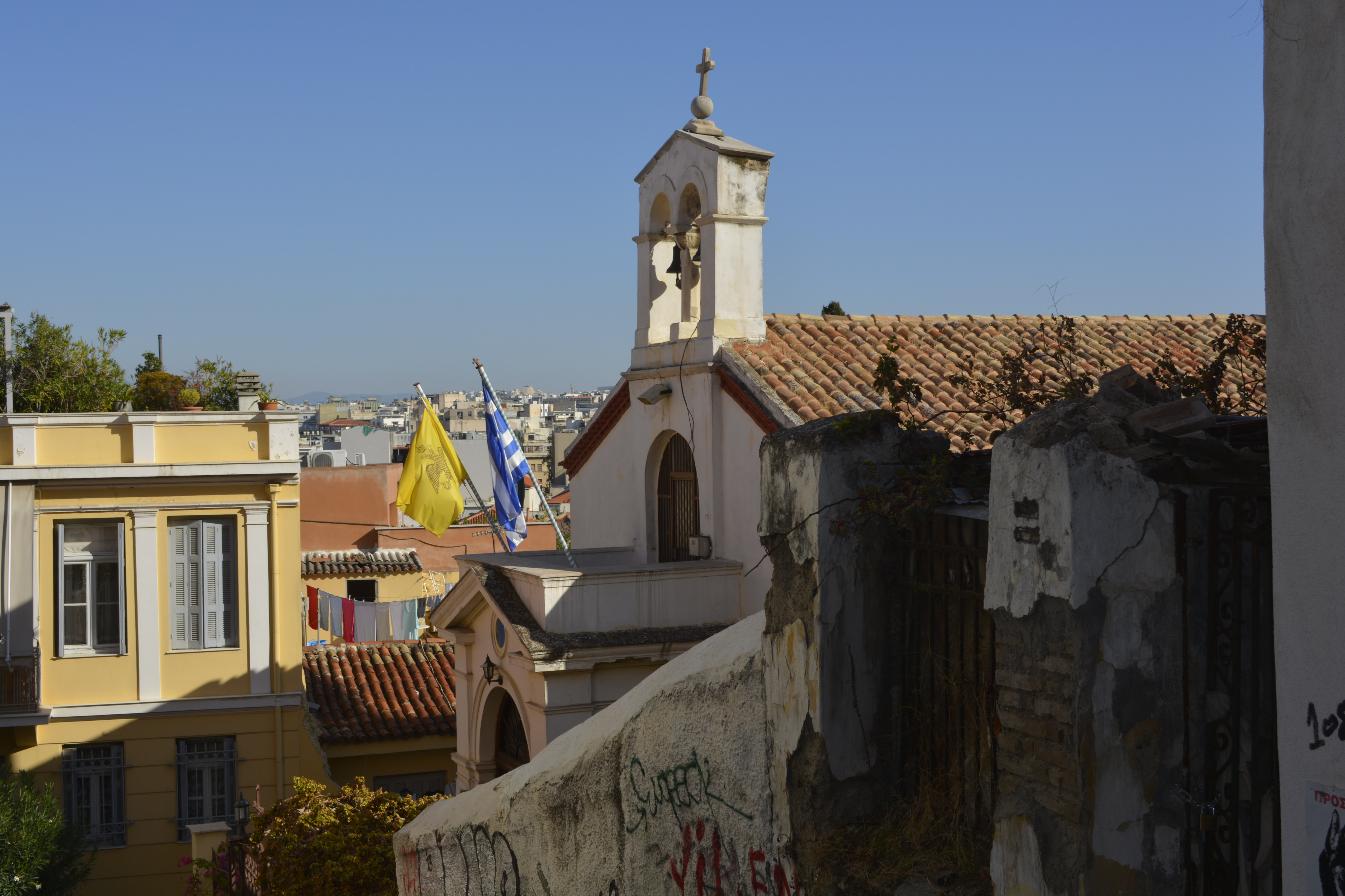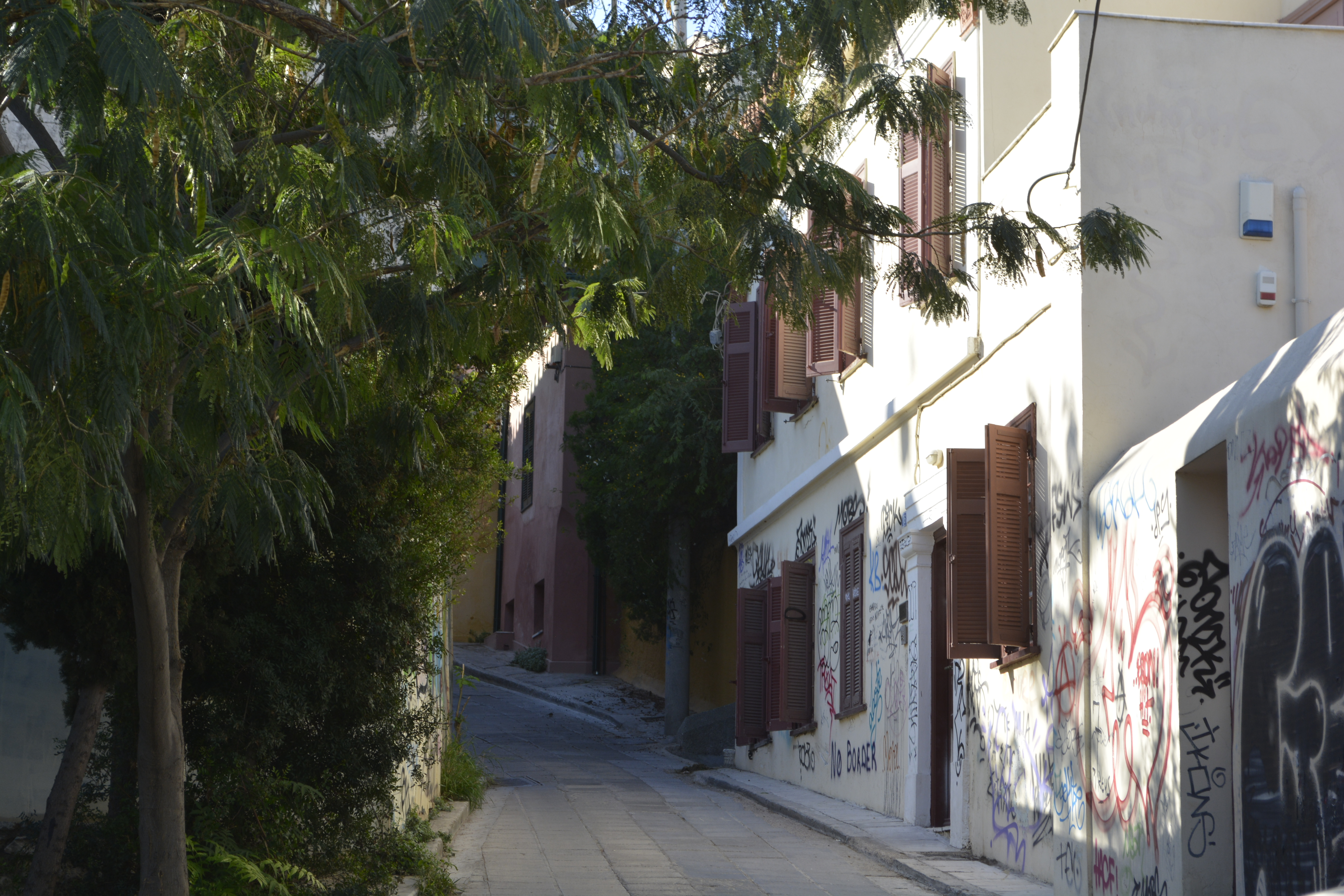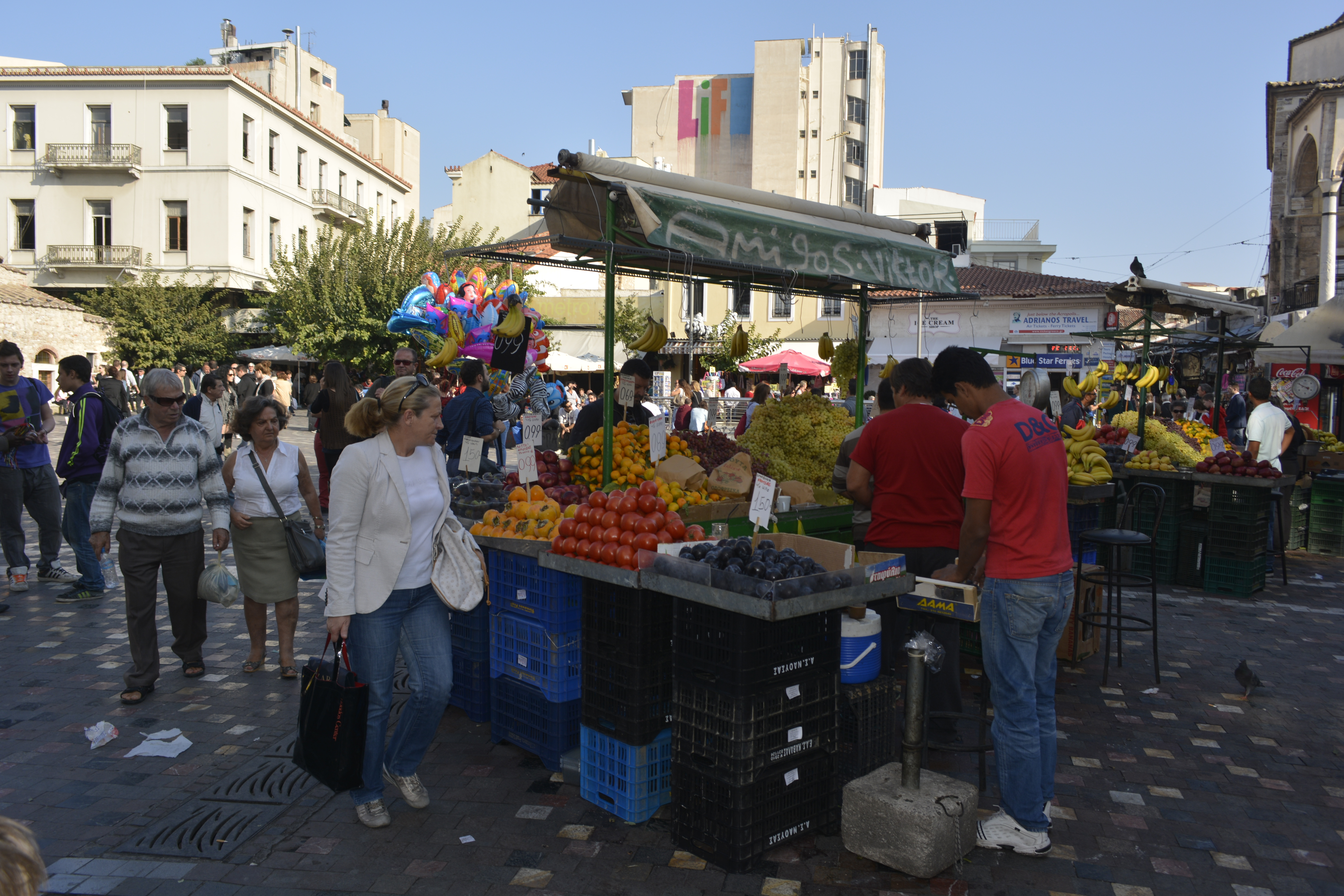 The Apollo Hotel, located in the Metaxourgio quarter, was a good choice. Luckily, it was also very near the Metro stop, but most of the time I opted to walk wherever I was going. At $35 per night the room was not 5-star, but with a good breakfast included, what more could you want? It was clean, air-conditioned and the bathroom was in the room! I even had an Acropolis-view in the distance— from the balcony looking between two buildings! It was a 20-minute walk to the Acropolis and very much in the heart of all the places I wanted to go. I spent the evening walking around the nearby Omonia area. It is a fairly diverse area of homeless Greeks, a middle class population and undocumented workers (many from south Asia). I loved exploring the small back streets, but was always mindful to be very close to other people. This is a business-by-day area, and the demimonde that comes to life as the night falls. Junkies, prostitutes and drunks move freely among the youths hanging out in the parks and the middle-class tourists making their way to cheap but good restaurants that the district is well-known for. There are also many people waiting to take the night buses to other Balkan countries, such as Albania and Bulgaria.