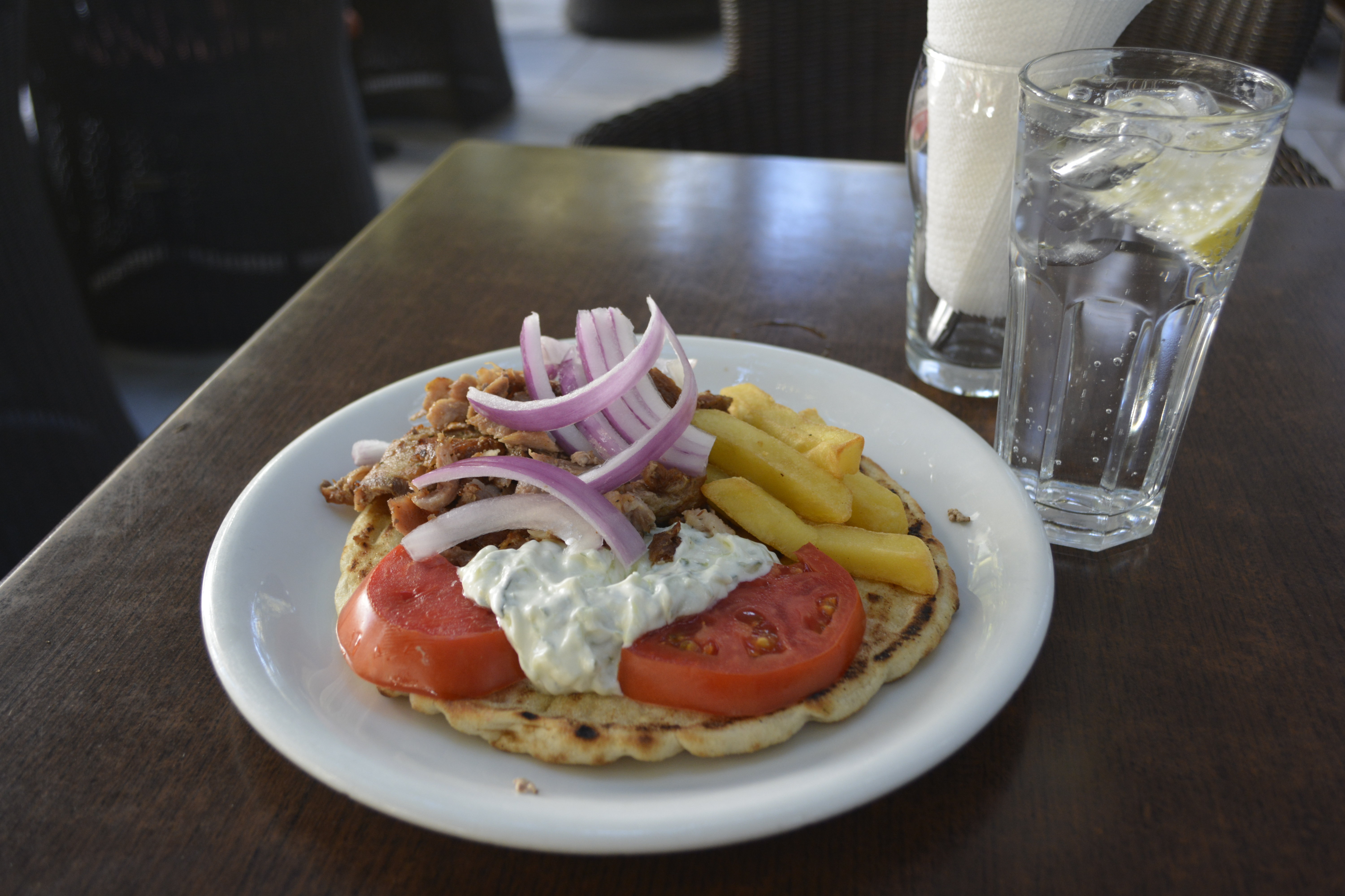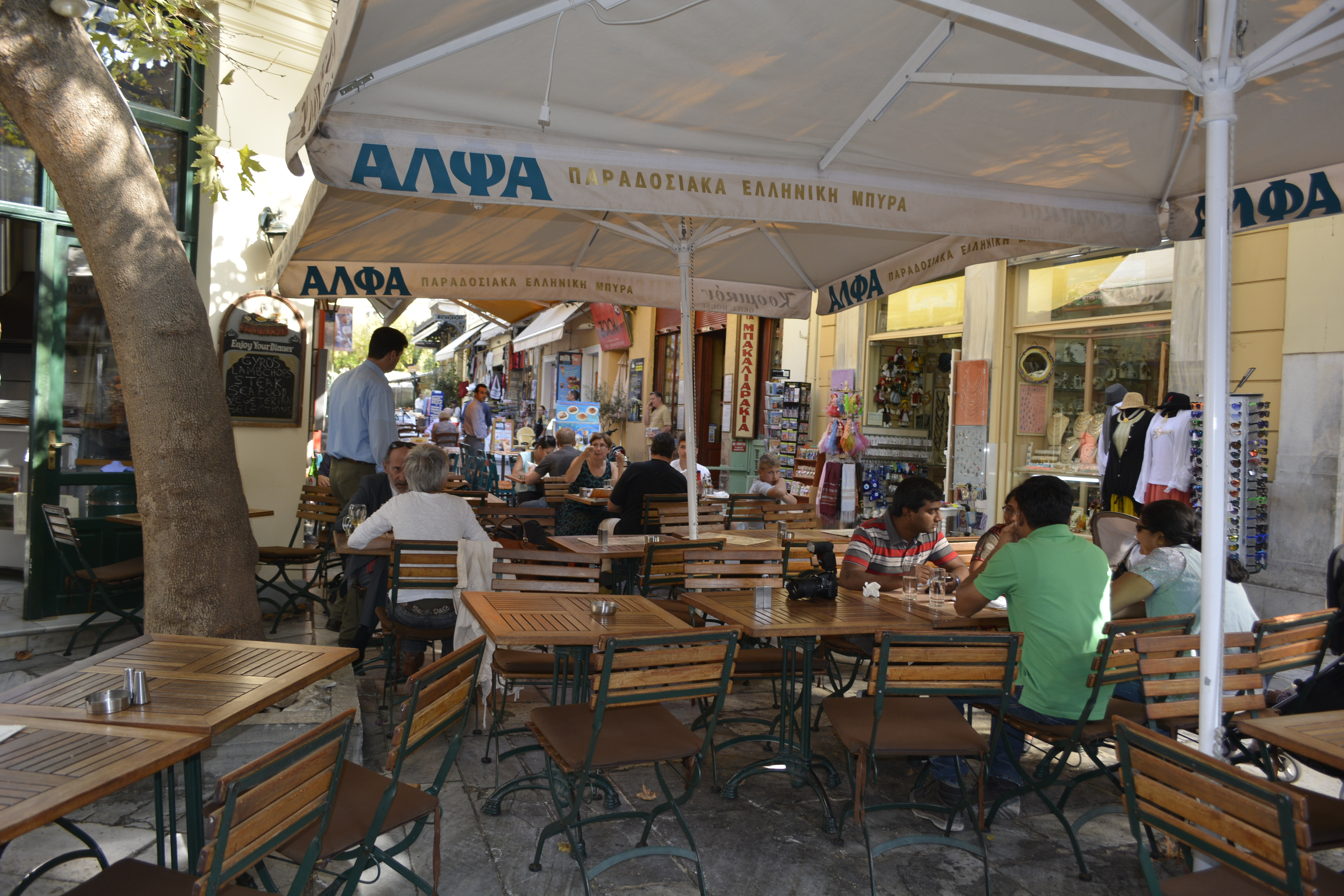 As I hadn’t eaten since breakfast, I crossed to the Plaka area of more shops and restaurants on tree-lined lanes. There are also a lot of side streets you can get lost in, as I quickly did as one interesting thing caught my eye after another. I had a gyro at Taberna Restaurant. I really got to enjoy the al-fresco dining that is such a part of Turkey and Europe.