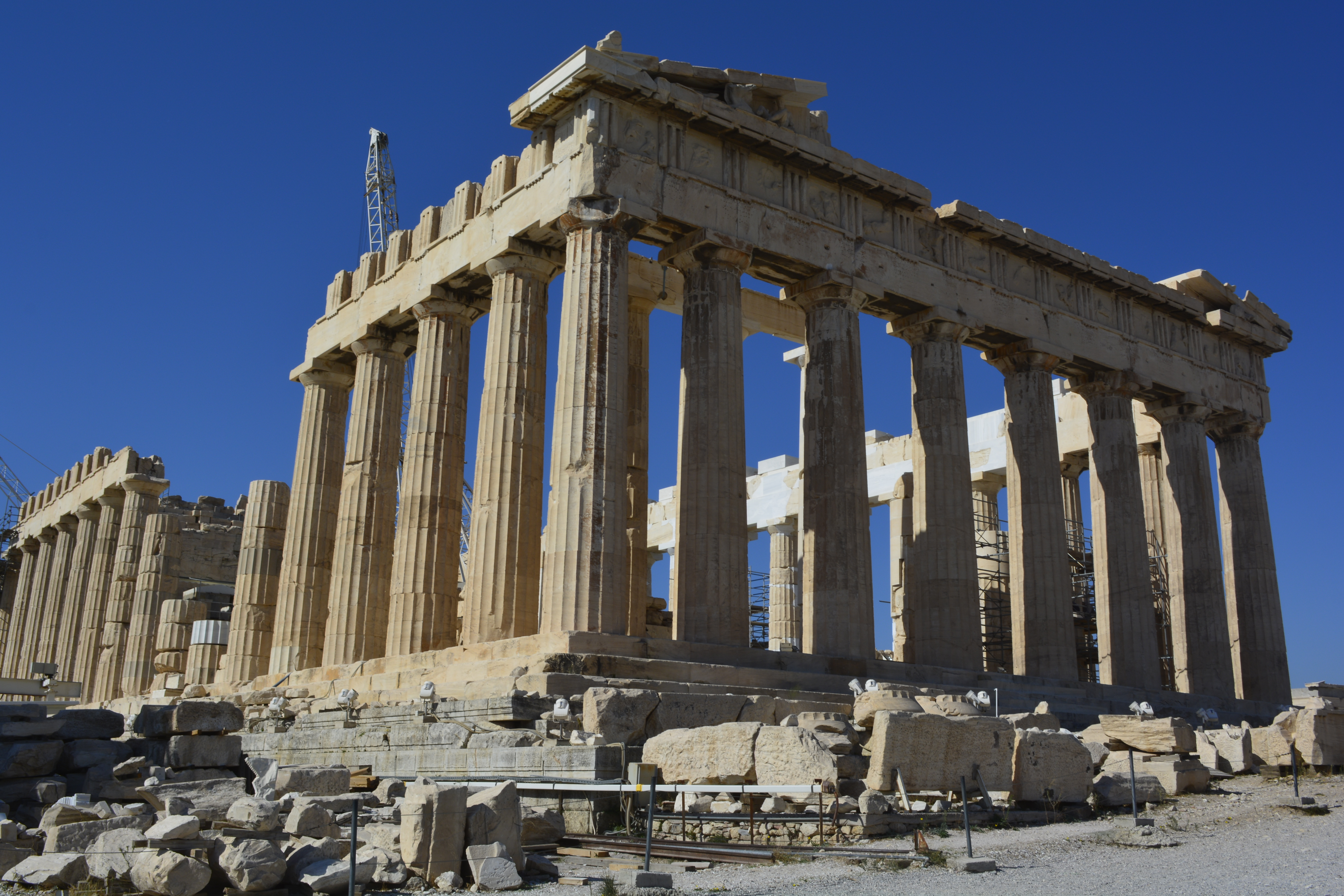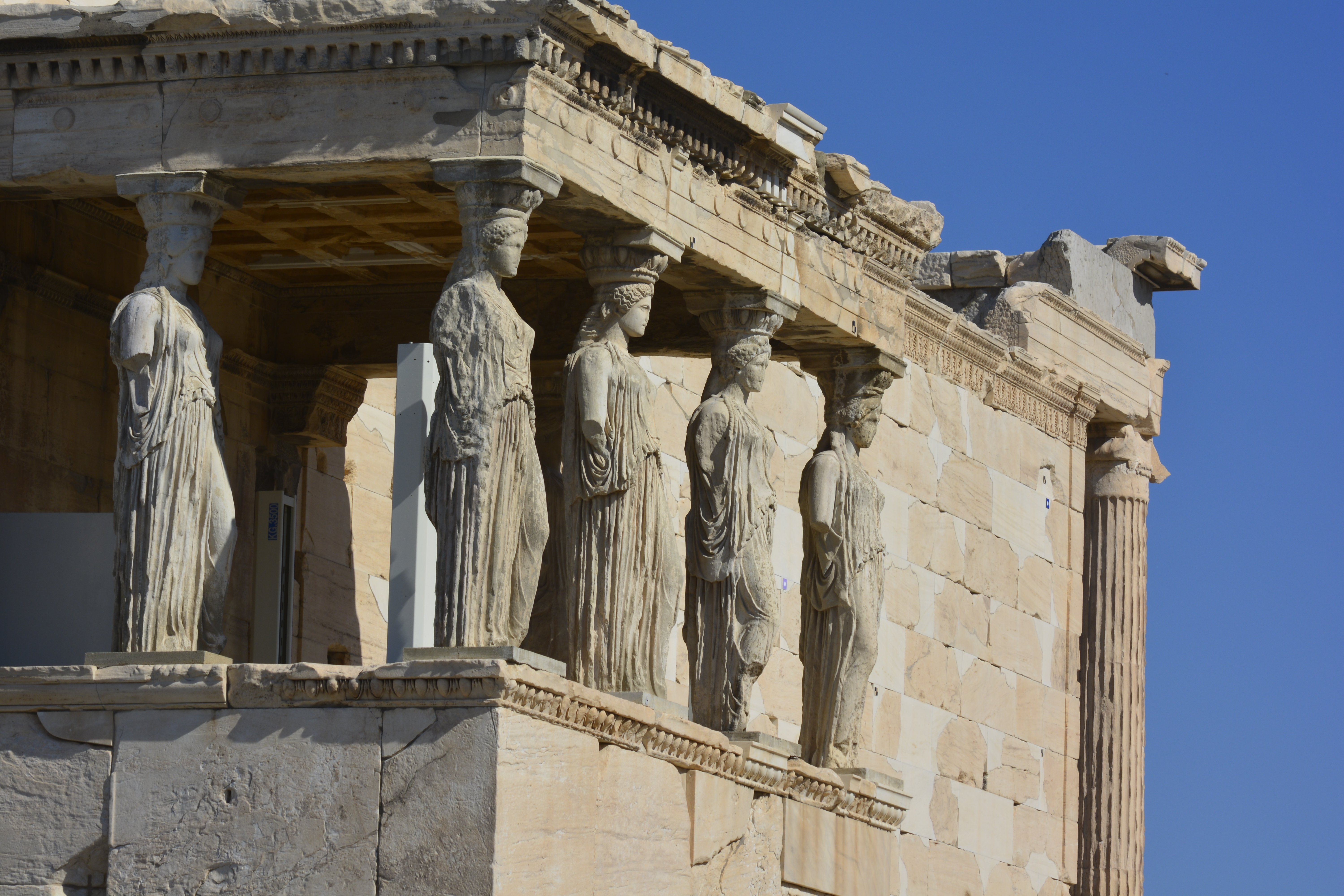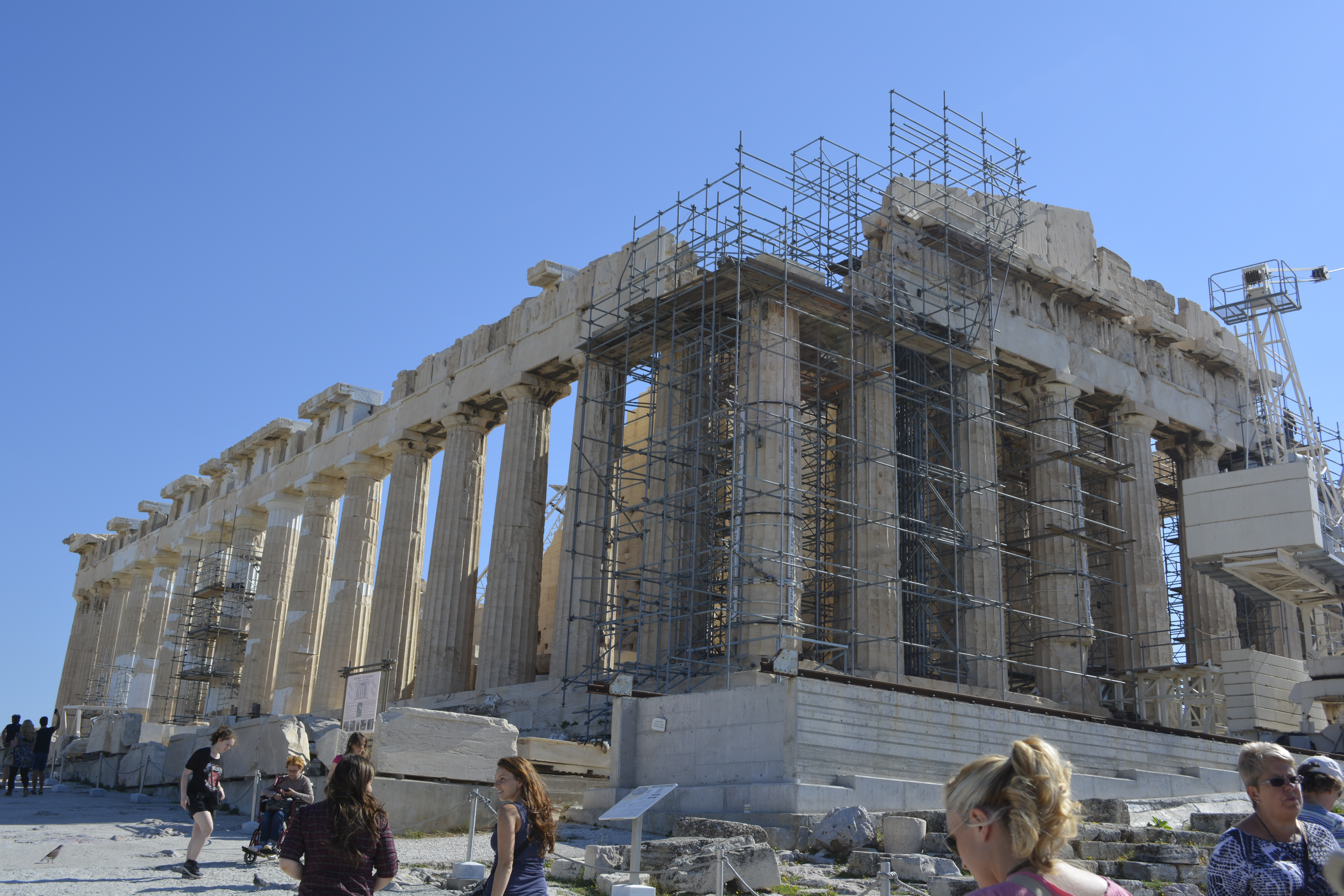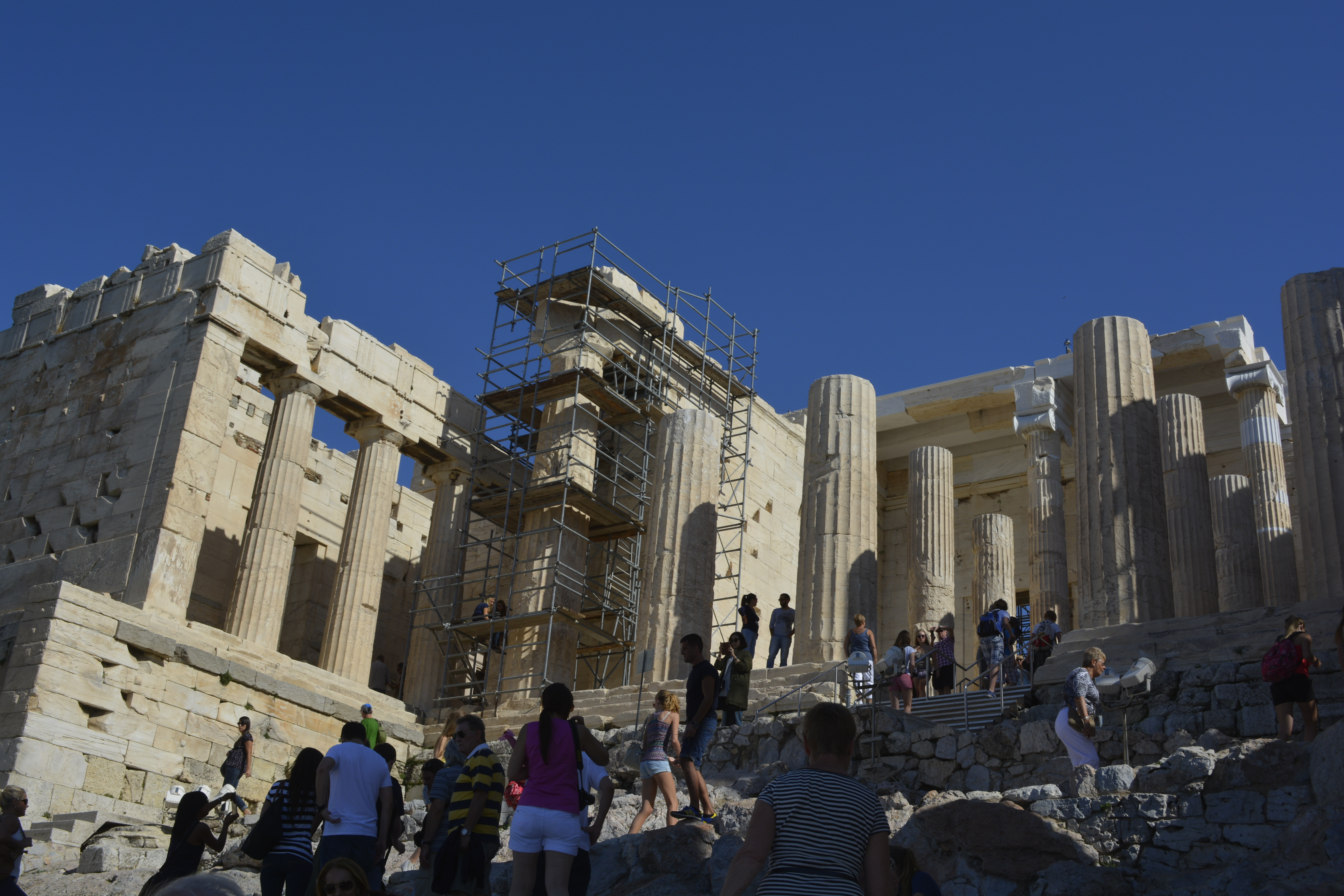 At the very end of the Athinas, you come to Montastiraki Square. This is the starting point for the entire Acropolis area. I made quick visits to the Folklore Art Museum and Hadrian’s Library, not a lot left here save the ruins. But here in the Roman Agora (marketplace), is that magnificent octagonal-shaped Tower of the Winds with its carved representations of the winds and weather. At this point, I decided it was time to make my way to the top of the Acropolis.