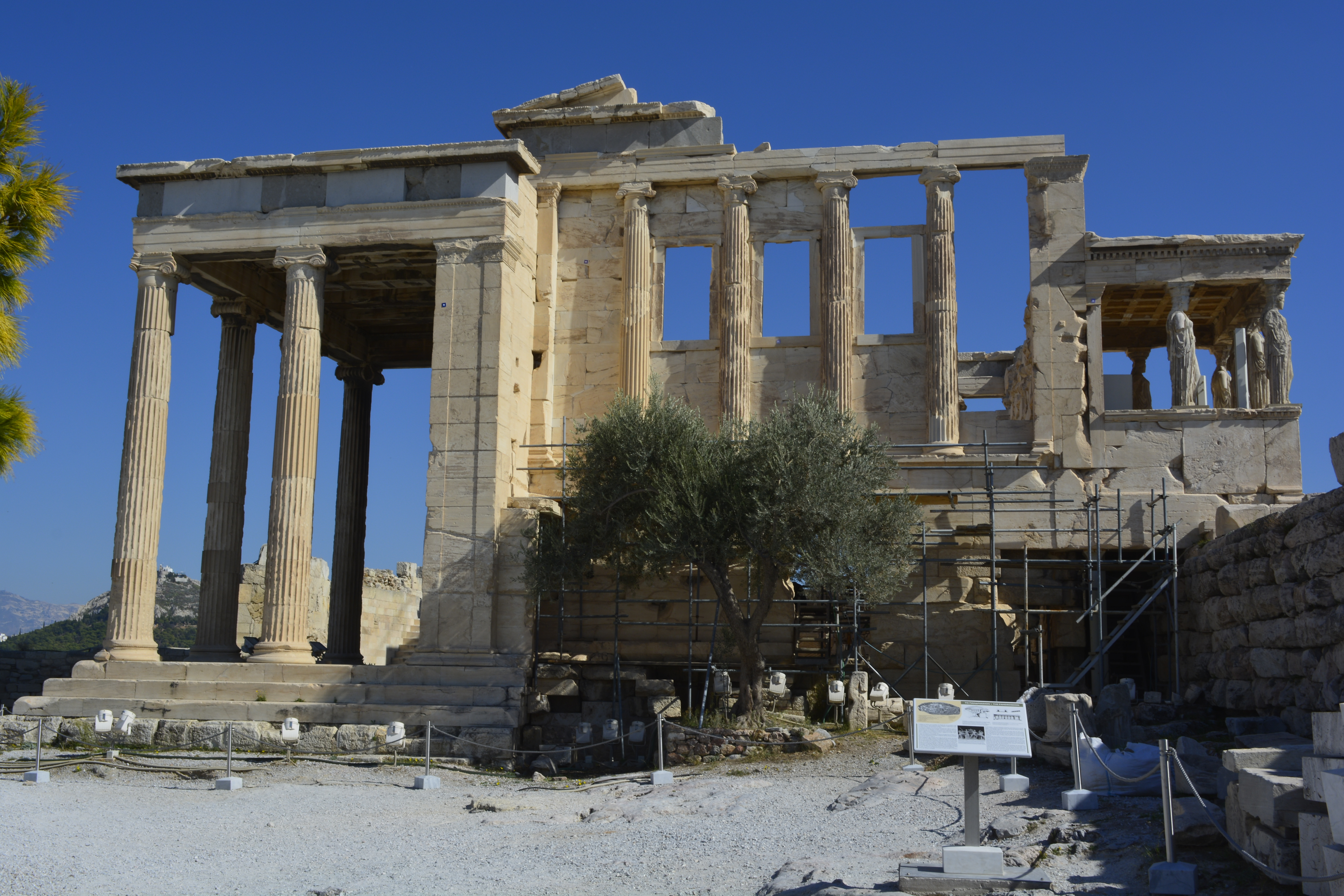 Entering the Acropolis through the western gate is an amazing experience. As with Ankor, the Taj Mahal, Notre Dame and Bourabador you have this immediate euphoria that you have at last arrived! It was very dry, warm and extremely windy when I got to the top. The surface is also surprising in that it is quite uneven and rocky. I was also amazed that there were so few people! Not only was it off-season, but I arrived about noon when many had abandoned the Acropolis in search of food and drink. I spent three hours taking in the Parthenon (full of scaffolding due to the reconstruction), and the amazing Erechtheion with the caryatids statues used as columns to support the porch. There is an olive tree here supposedly from the original tree planted by Athena as she battled with Posiedon, god of the Seas, for the favor of the Athenians. Next to the Erechtheion is a huge Greek flag. It is there in honor of the resistance fighters of World War II. As the story goes, when the Germans entered the city, they told a Greek man to lower the flag. He did so, and then wrapped himself in it and threw himself off the edge of the Acropolis. It was a tremendous inspiration to the resistance movement. I could write two entries on the Acropolis, but suffice it to say, I enjoyed having the time to just quietly relax and not have the horde of tourists around. The interesting thing here is that a lot of the original carvings and statuary have been removed to the new Acropolis Museum, and copies have been put in their place. There are also a number of the frieze carvings from around the Parthenon now in the British Museum in London as they were basically stolen by Lord Elgin years ago when the Parthenon was in ruins and Greece was under British influence. As I left at 3:30, two boatloads for tourists arrived from ships docked in Piraeus, the port of Athens . I again made may way down to Montastiraki Square to sit and people-watch as I had a bottle of water and bought some grapes and bananas.