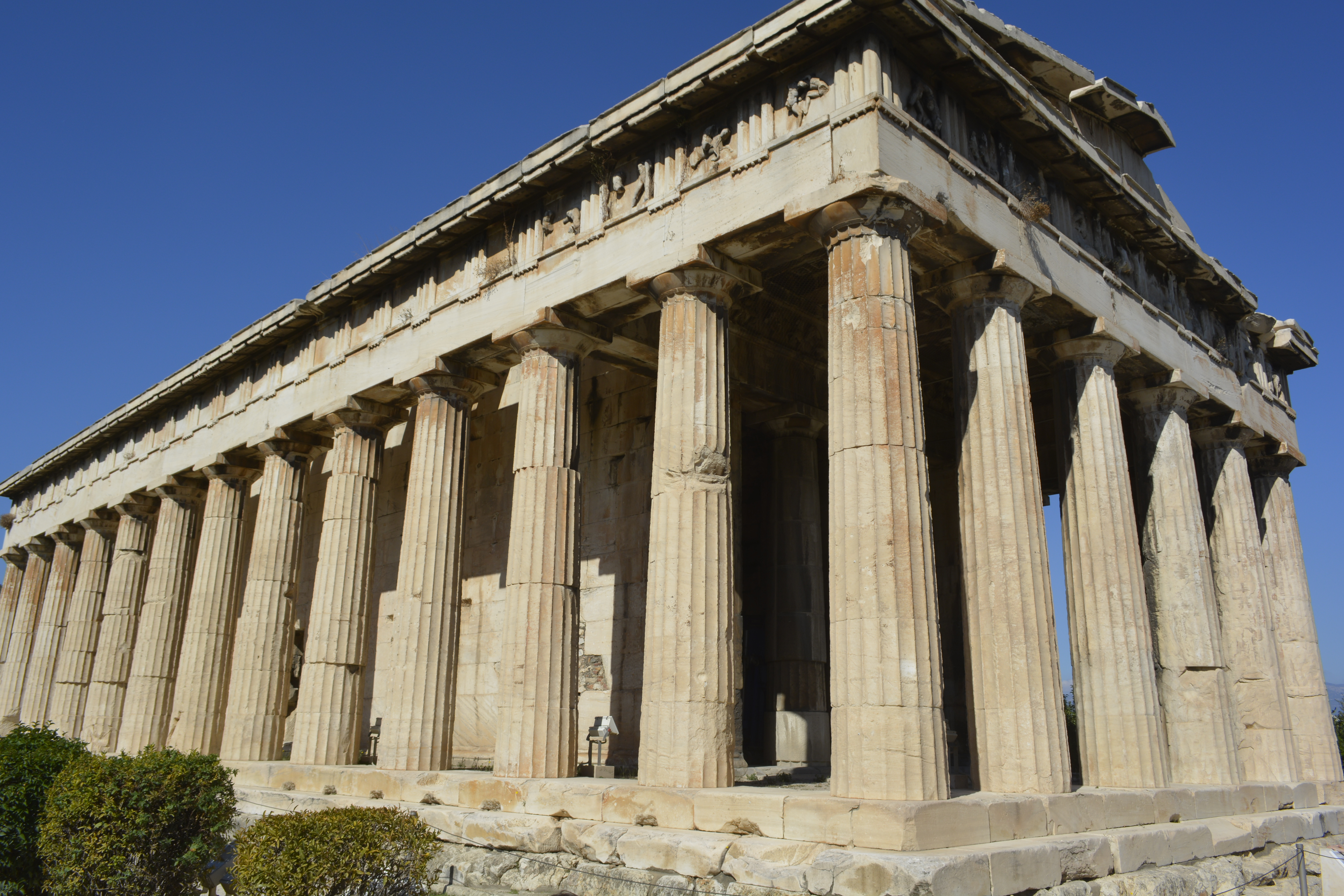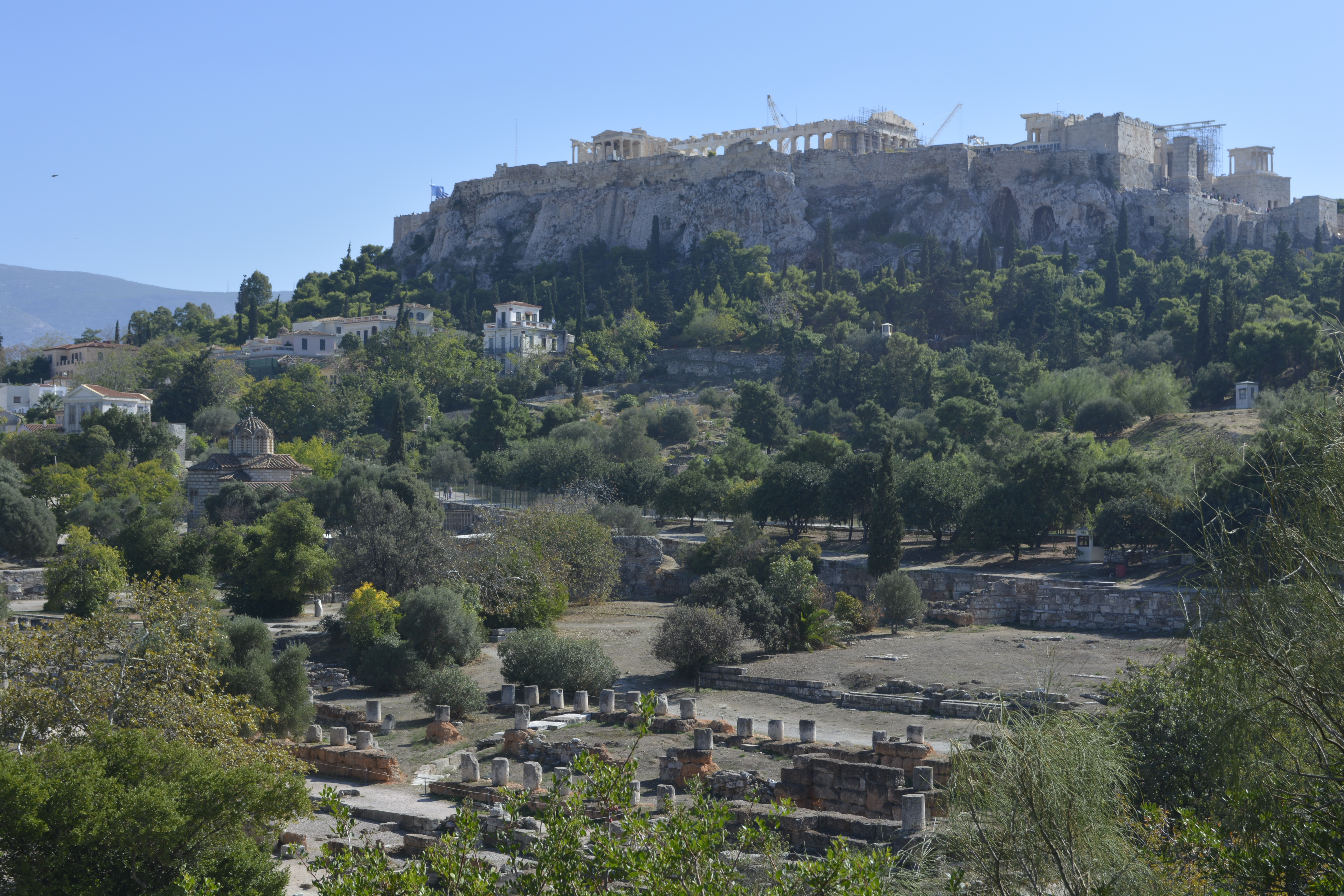 On the other side of the agora is the Temple of Hephaistos. The columned temple is in surprisingly good shape and is located in a more remote area of the agora, so there are few people there when I arrived. There are many ruins of temples, odeons, stoias and shrines in the old agora– all in a park-like setting with well-positioned benches where you can sit quietly and imagine how life was back then. With my knee acting up that day, this proved to be the perfect activity as it afforded me many opportunities to stop and rest before moving on to the next site. It was also amazingly quiet as it was mid-afternoon and rather warm, but not overly so. I ended the day walking back to the hotel and stopping in Omonia to rest in the park and have dinner in a nearby restaurant I had passed the day before.
