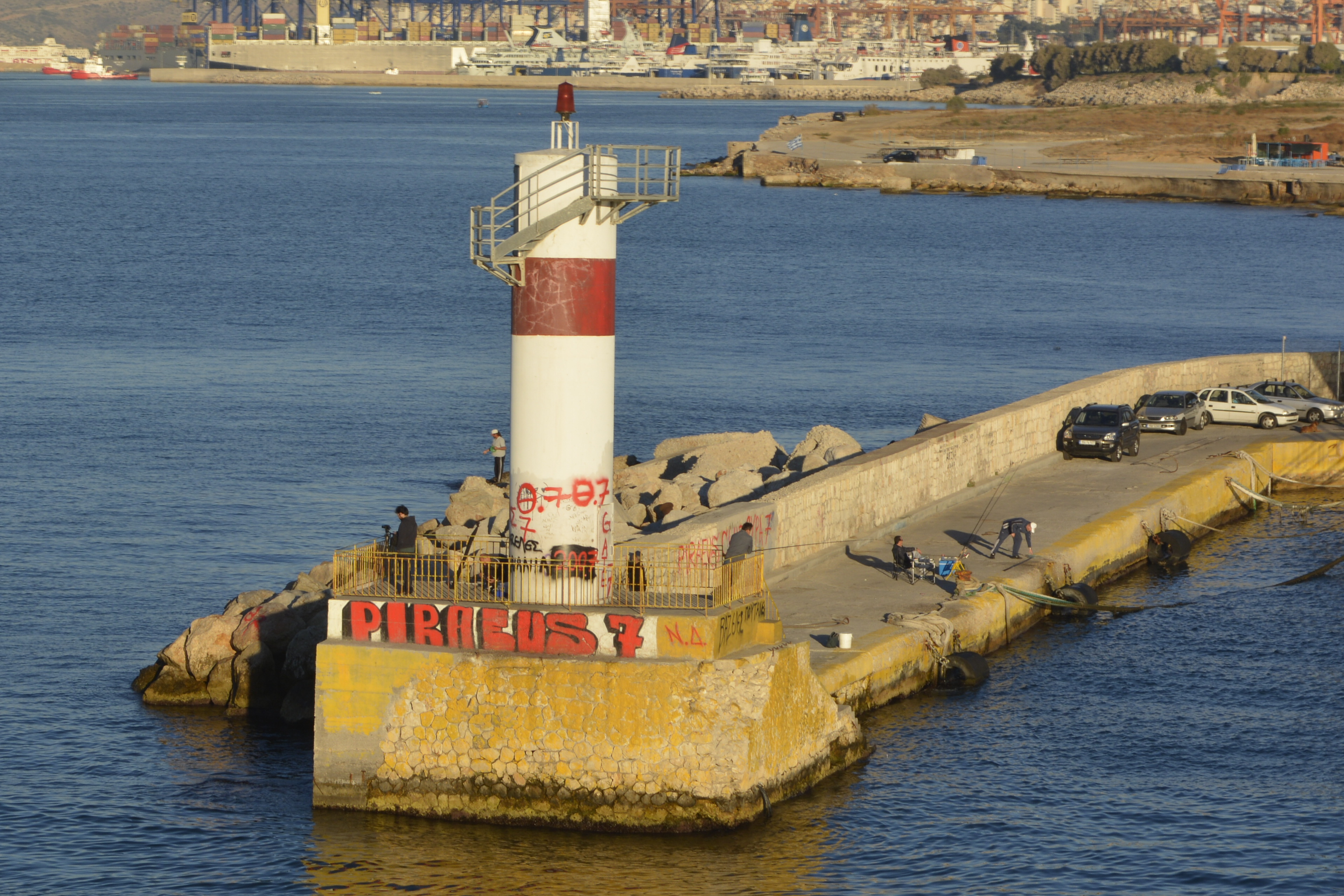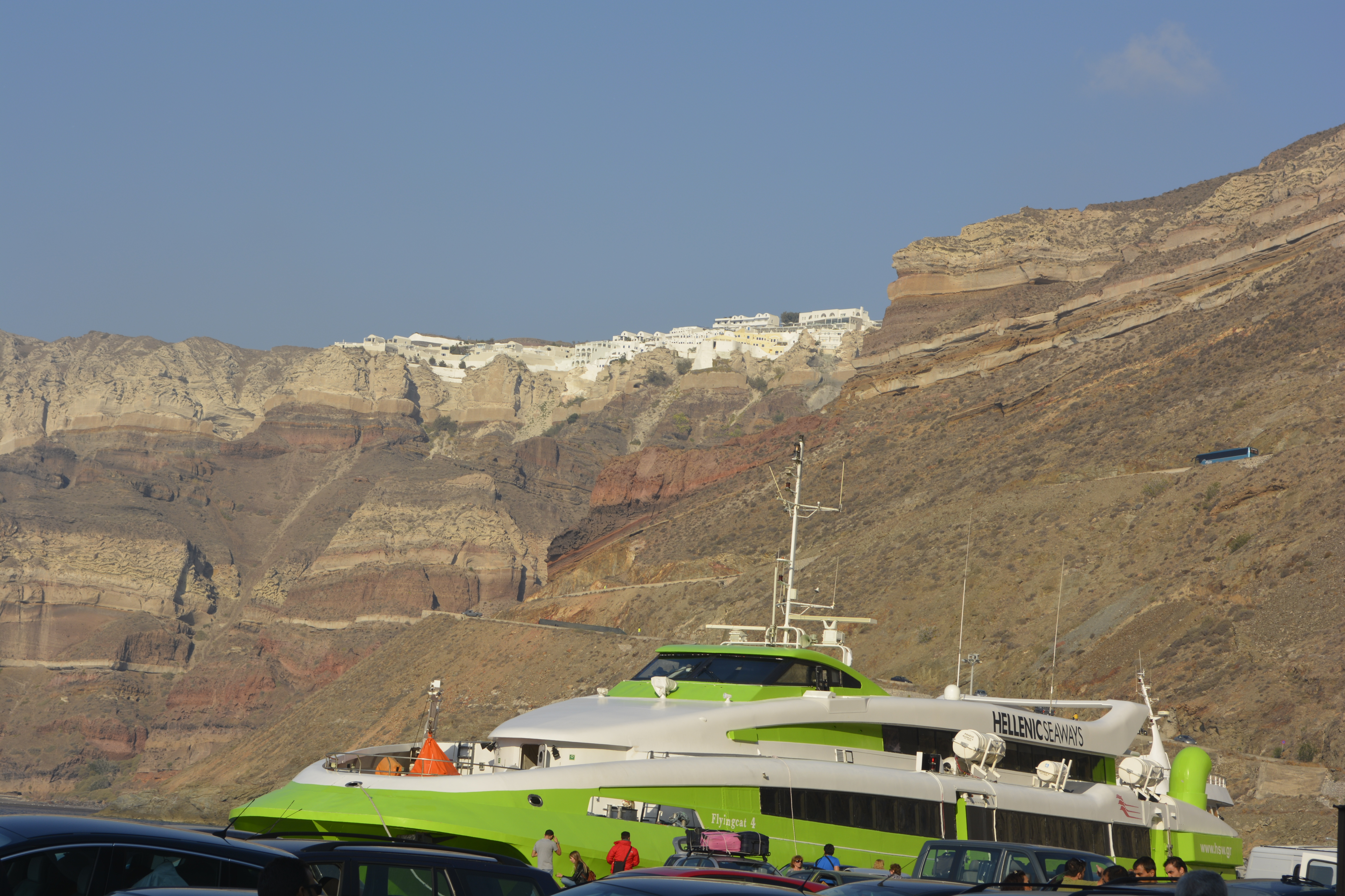 The boat was due to leave at 3:30, but it arrived a little late, had to discharge its passengers, and the seemingly endless procession of trucks loaded with everything from food to fuel. It was a chaotic boarding as people gave up and hauled their luggage on to the boat sometimes with near-death experiences as there was no understanding or direction from the boat staff as to who or what had the right-of-way! There were a lot of people on the boat as it was the last day of the season on Santorini. In the business class, however, there were only 10 of us! I claimed a big section at the front. And so we finally left, the boat passed Fira, Firostefani, Imerovigli and Oia at the tip. A final, sad salute of the horn from the ferry as it rounded the tip and we were off. When the sun went down and Santorini was lost in the distance, I slept and read all the way back to Piraeus.