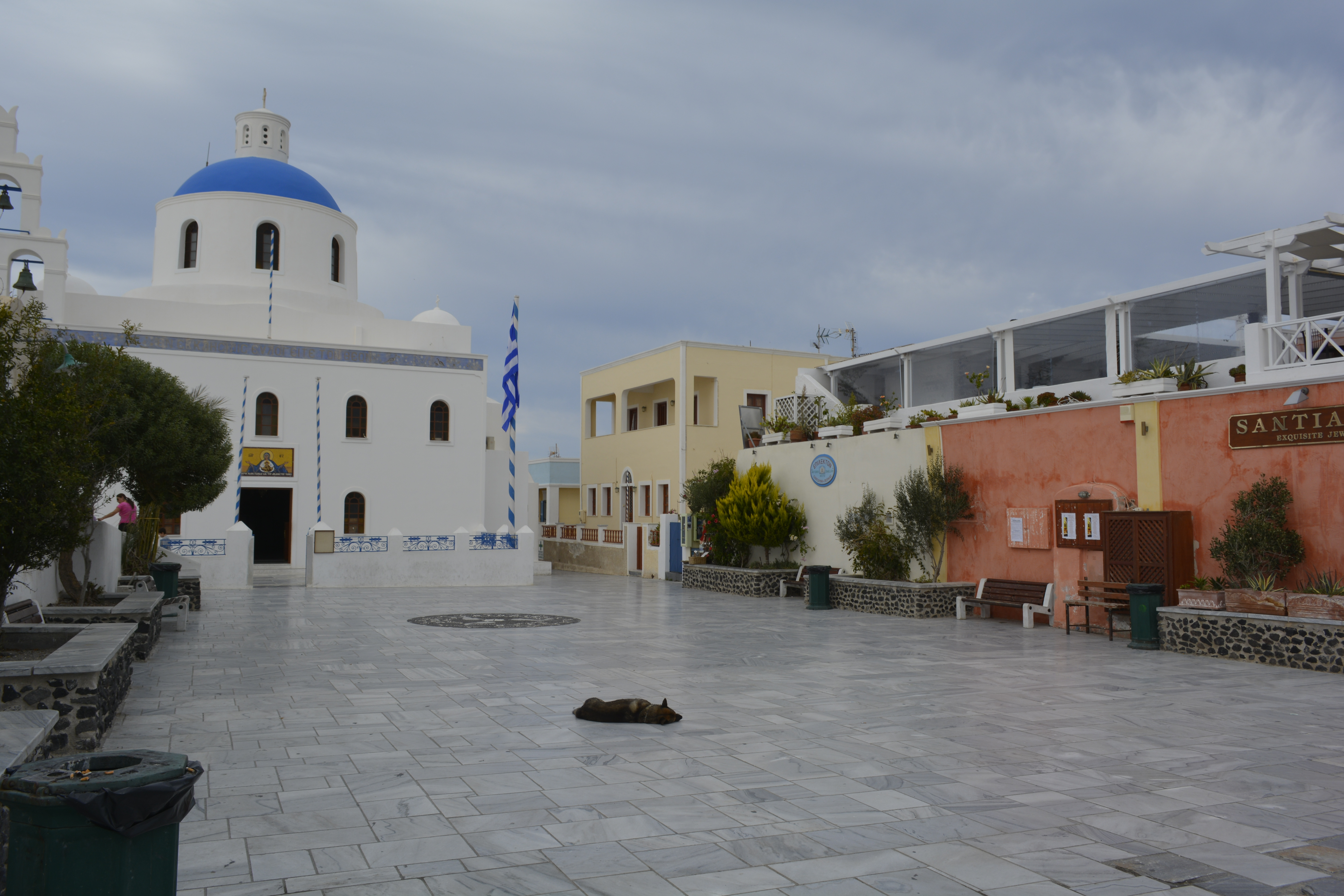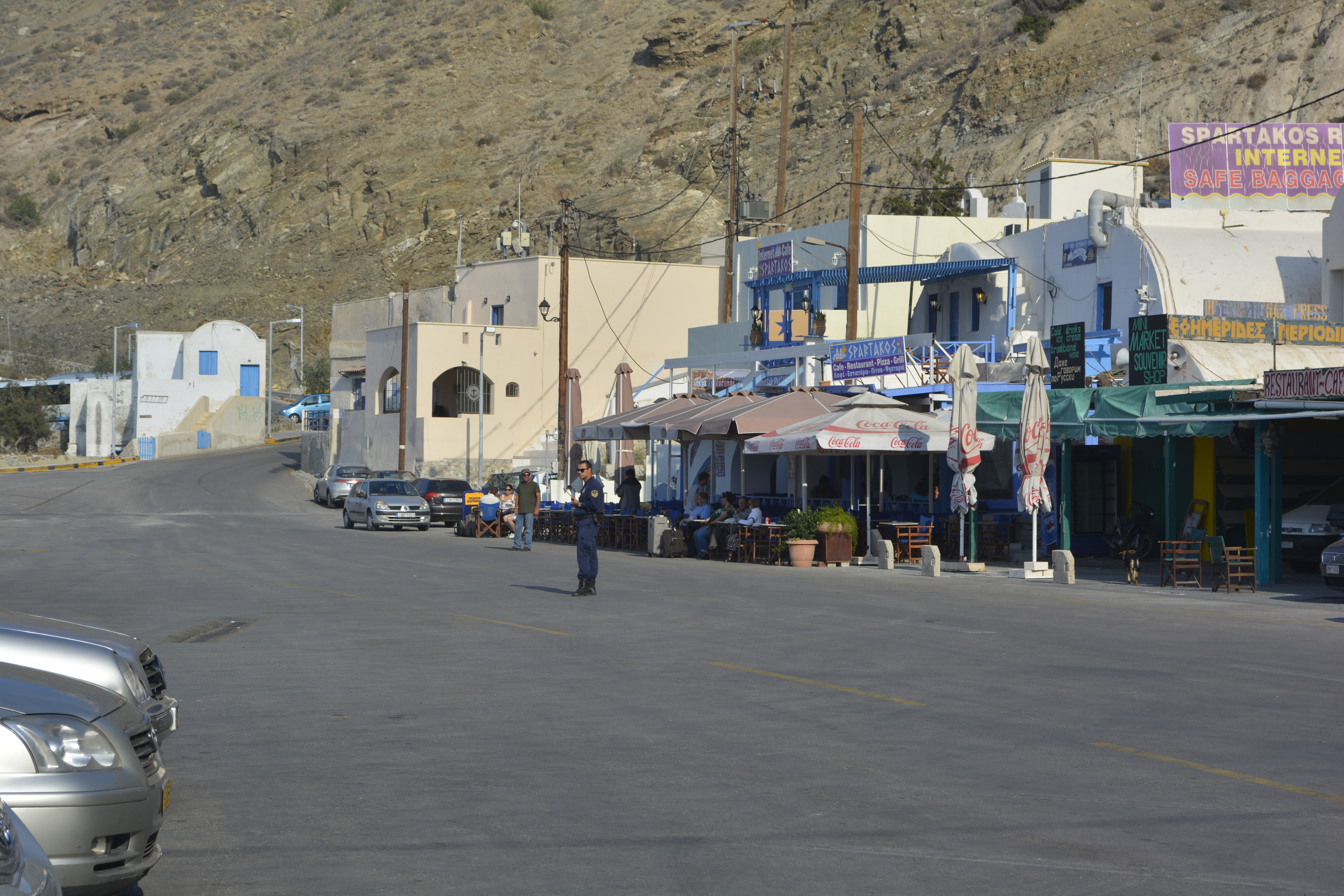 The second day, I was very lucky to be there for the “Day of No” parade. On that day in 1940, Greece said “no” to Mussolini who basically demanded that the Greeks surrender to him. It is now a national holiday. The parade was quaint and small-town terrific. The only marchers were the kids from the elementary and high schools. Some were dressed in native costumes. The Patriarch of Greece was also in attendance. First, there was a religious ceremony at the Greek Orthodox church and then the parade began. The viewers on the sidelines were equally as interesting as the kids in the parade! The elementary kids, especially the kindergarteners, stole the whole show! The music which was the ballads of the World War II era (think or Google Edith Piaf), was incredible. The whole afternoon, I was hiking all over the towns of Fira and neighboring Firostefani. There is a great hiking trail between the two towns that takes you along the rim of the caldera. Wonderful views all along the way! One of the locals told me that there are many jobs on the island due to the tourist trade, so few of the young leave to move elsewhere. There are many reasons why you would want to live here. It is an absolutely wonderful island! However, I’m sure the lure of Athens and the world beyond has its appeal to the youth none-the-less! Many of the residents go away at the end of the season. In fact, the owners of the Anatoli Hotel were planning just such a trip to live in Athens for a few months till after the New Year.
