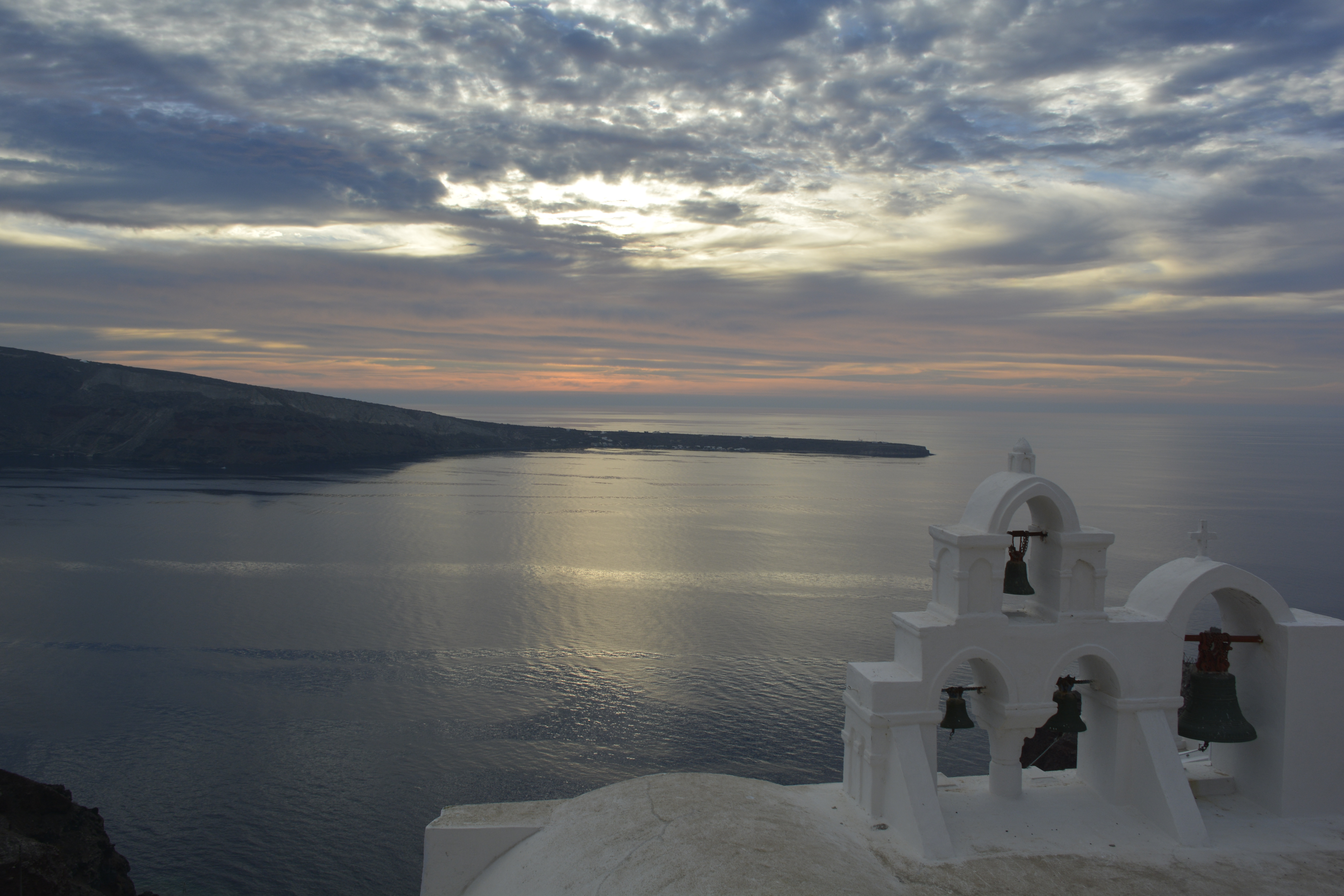 And finally it arrives, cheerily casting forth its golden abundance which flashes like scattered coins tossed across the waters toward us. The sunlight colors the blue-domed churches, white-washed homes and the verdant trees below.
