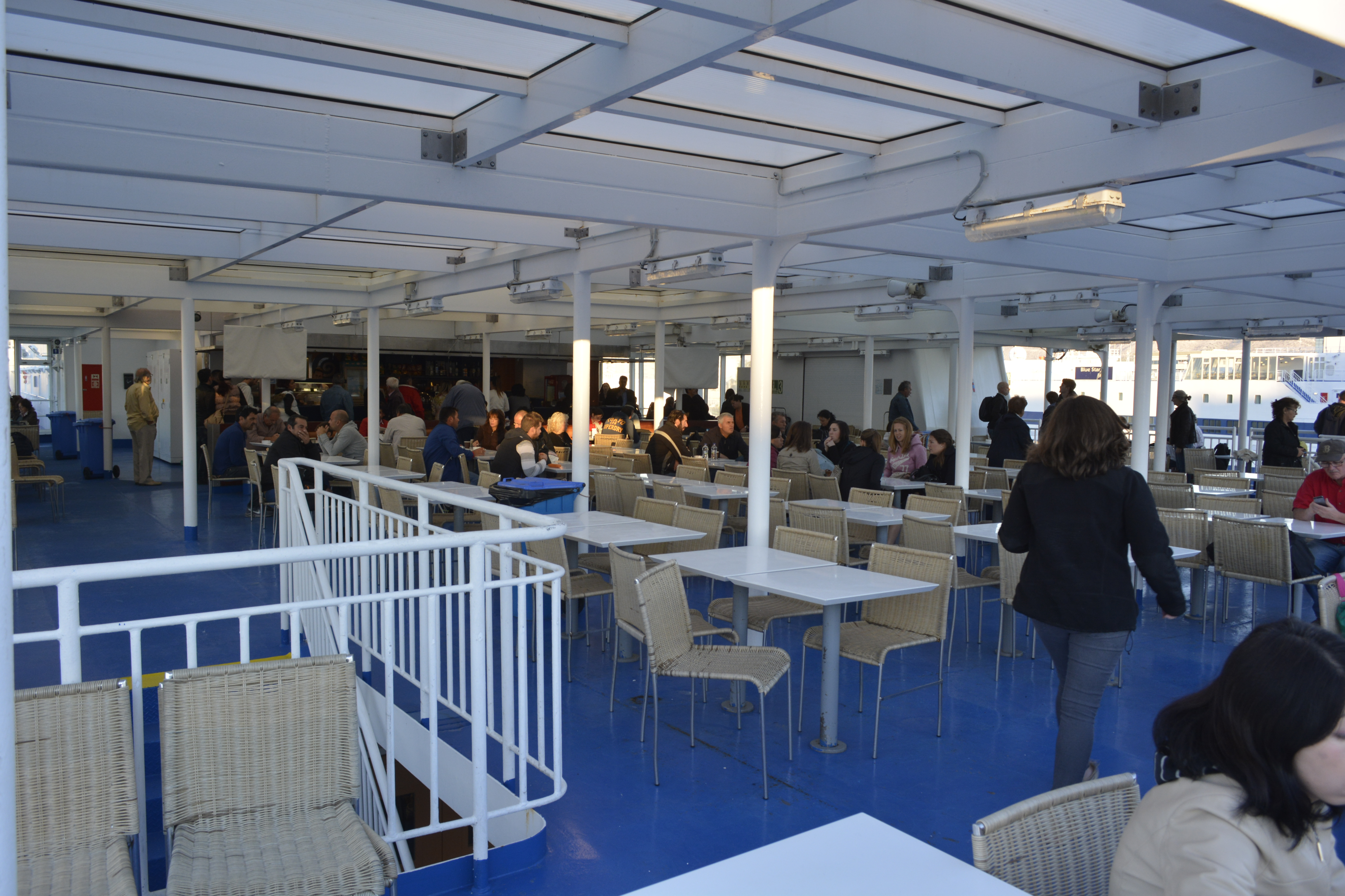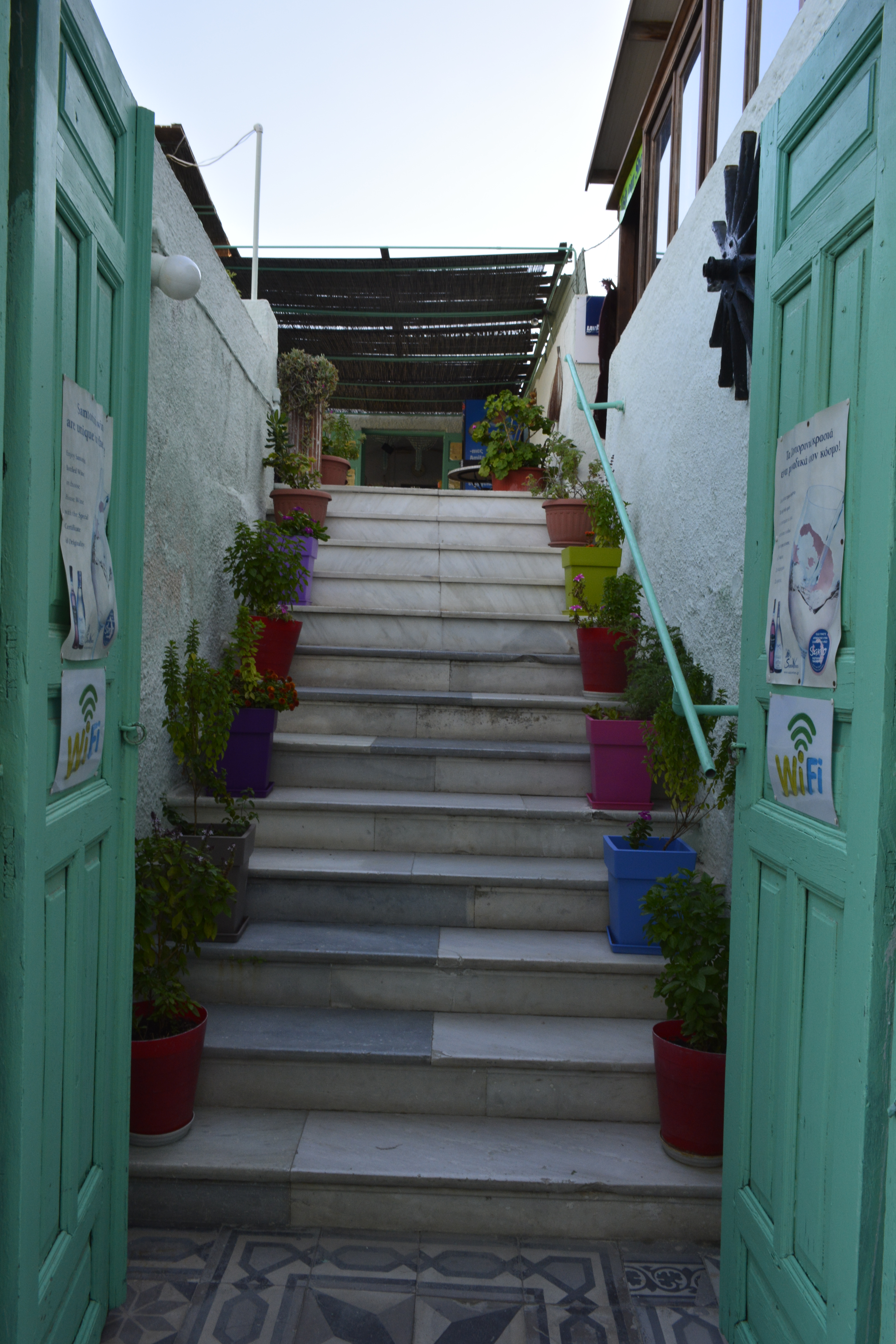 I boarded the 7:30 am ferry at Piraeus. As every day before it, it promised to be warm and sunny. We made the 8-hour trip on a large ferry. There were three main areas. One was the economy section where you sit at cafe or booth tables or in chairs on the deck for the trip. There are also comfortable lounge chairs in this section if you are lucky enough to get one! The other, was the “business” class. You are in a very cushy area in the front of the boat with access to nearly all the ship. There is also a section with small, private cabins. Food is available at several places aboard the boat.