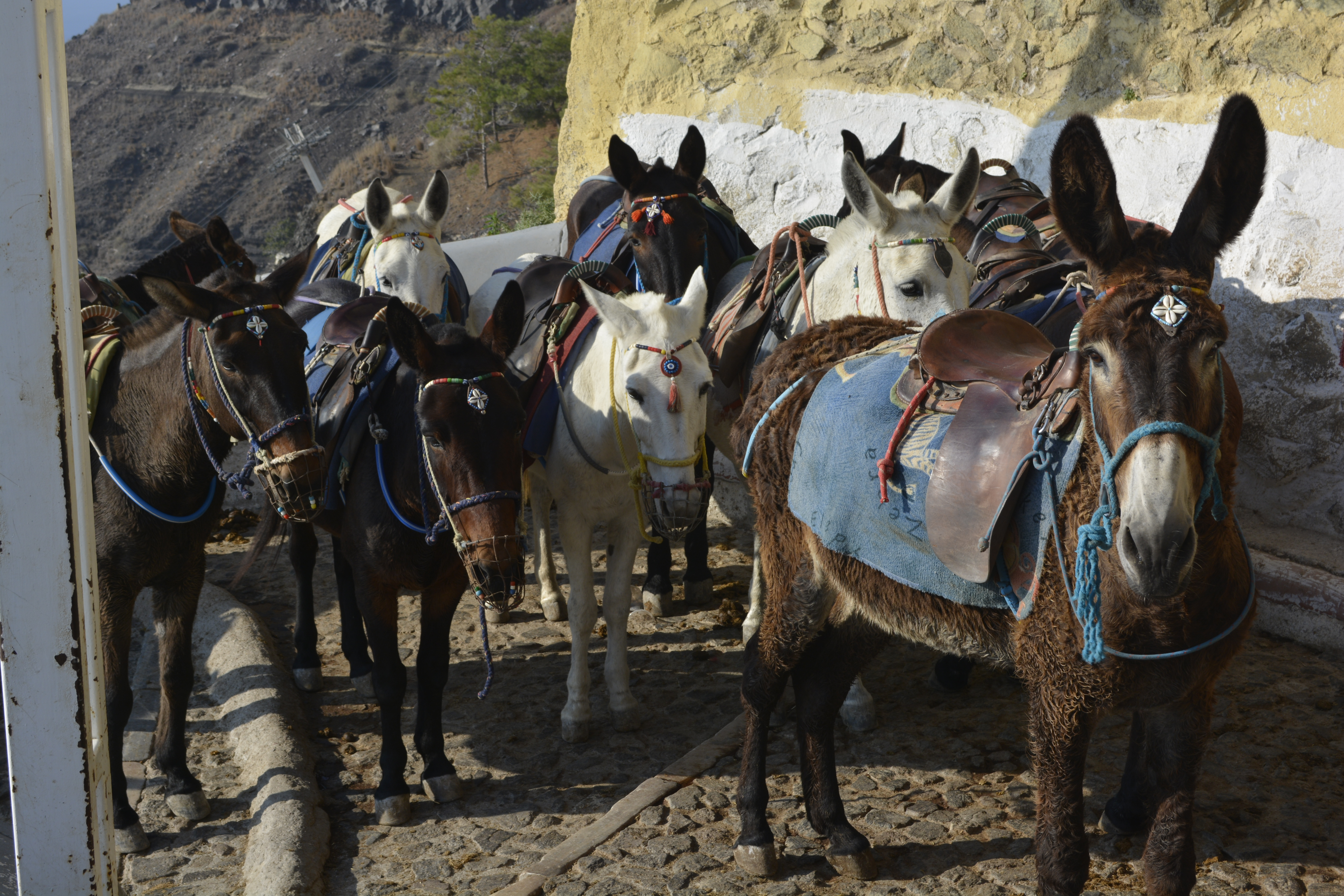 In the afternoon, I headed back to Fira. After a quick lunch, I decided to spend the afternoon down at the steps photographing the donkeys and their drovers. Although I enjoyed this to no end, I could not help but feel sorry for the donkeys that travel from about 1/4 of the way down the stairs to the beach below- about 450 steps. Not only do they have to travel up and down the somewhat steep stairway, but they also have to endure the tourists riding them! Many of these people have never ridden before and end up getting overly nervous which adds to the strain on the donkeys. The donkeys often show their displeasure with long, shreaking brays.