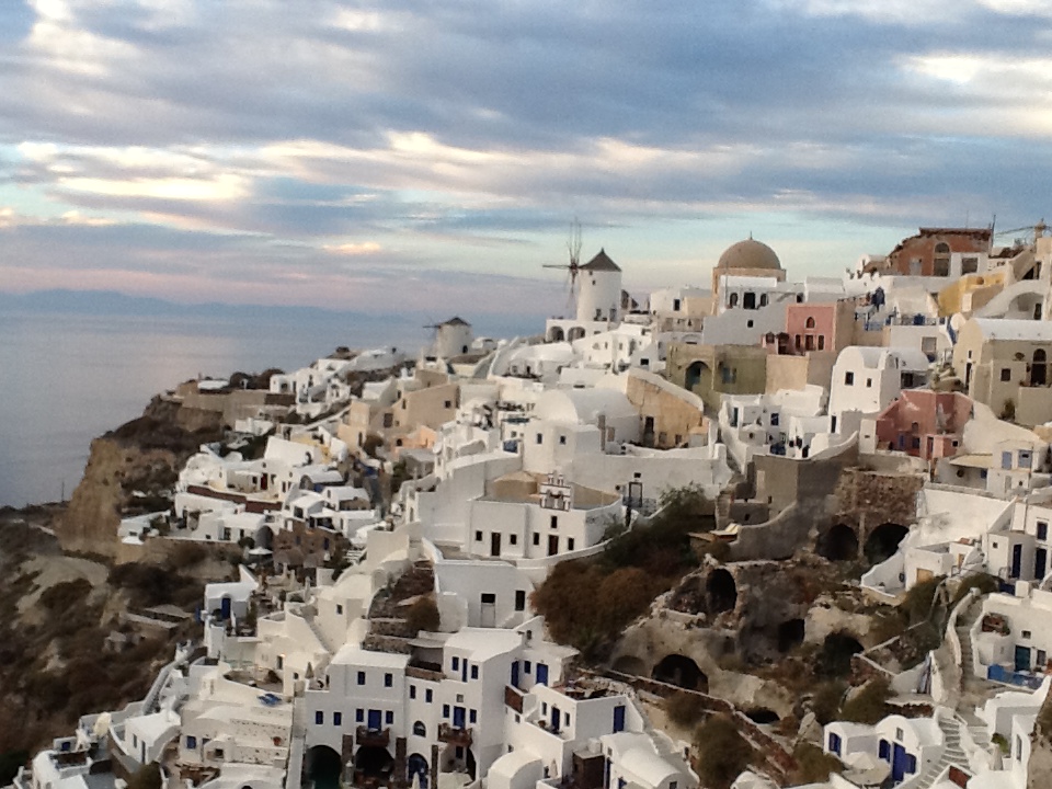 It was then a relatively short hop to Santorini. The Greeks call the island Thira. The name “Santorini” came from the Venetian traders who used to visit the island and attended the church there called “Saint Irene” (Santo Irene). This island was first settled by the Minoans in 1900 BC. They were forced to leave as the volcano began to erupt. When it finally did explode it created what scientists believe to have been one of the greatest volcanic explosions ever. It was so great that it left only three small islands, which had been a part of the volcano itself. The “caldera” (center of the volcano) was filled with water when most of the volcano itself was blown away. So catastrophic was this explosion that it is attributed to causing the decline of the Minoan civilization. It is also believed to be the origin of the story of Atlantis. There was another eruption in the 1950’s that totally destroyed the towns. They rebuilt soon after creating these magical white-washed buildings. A small volcanic island emerged after an eruption in the 17th century. There are basically two main towns on the island: Fira, the largest and in the center of the crescent-moon shaped island, and Oia (pronounced “EE- ah”) on the northern tip. The ferry from Athens arrives at the “new port” and you are transported to Fira by bus (2-3 euros) or taxi. You can also rent a car at one of the many car rental places near the docks. You then make your way up the side of the cliff via the serpentine two-lane road. If you arrive by cruise ship, you arrive at the old port and make your way up by climbing the 525 steps, taking the cable car, or riding a donkey up to the top. There is also a small airport on the island. The towns are built along the rim of the old volcano. In the evening light, they appear to be a white froth cascading over the edge of a cup of cocoa.