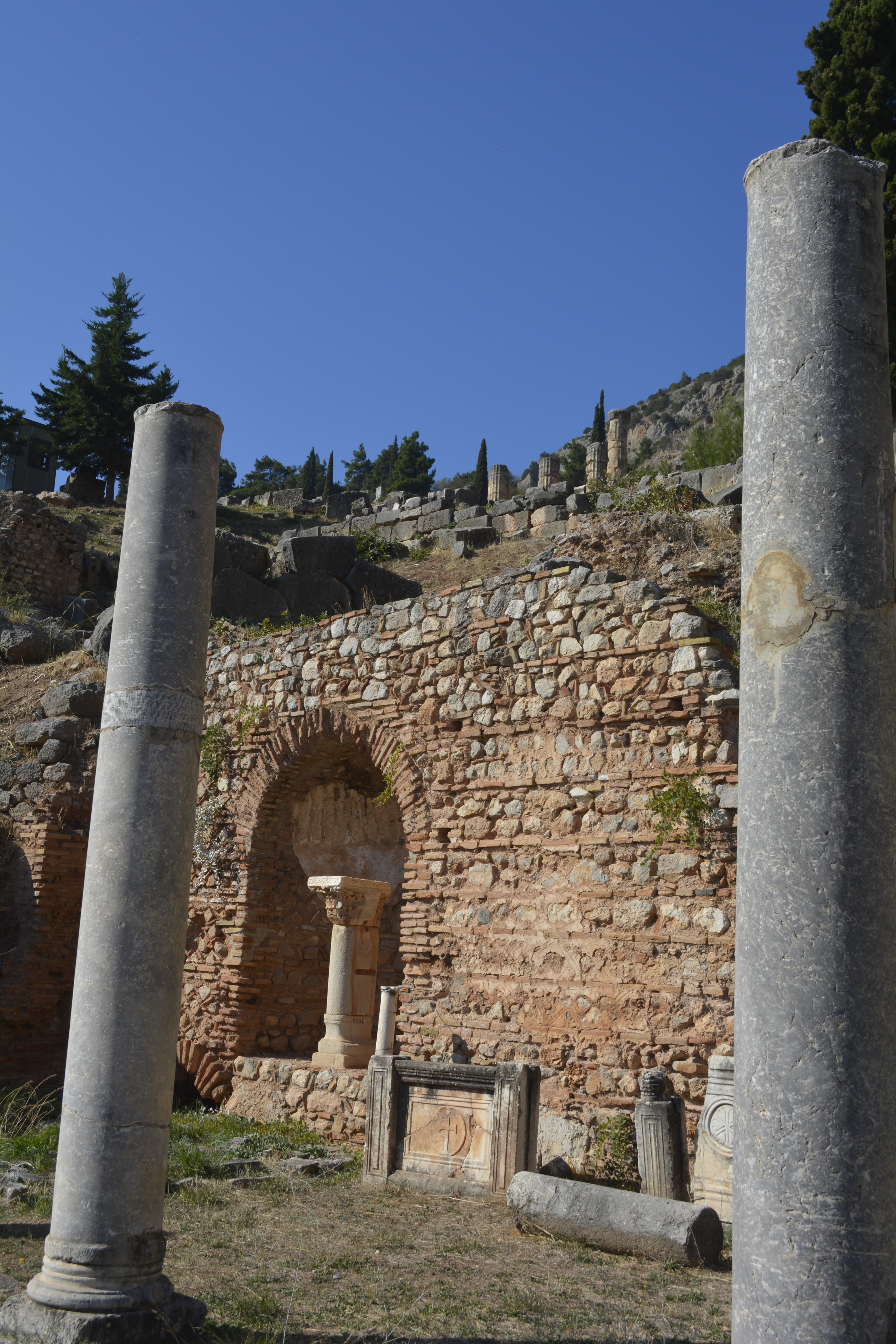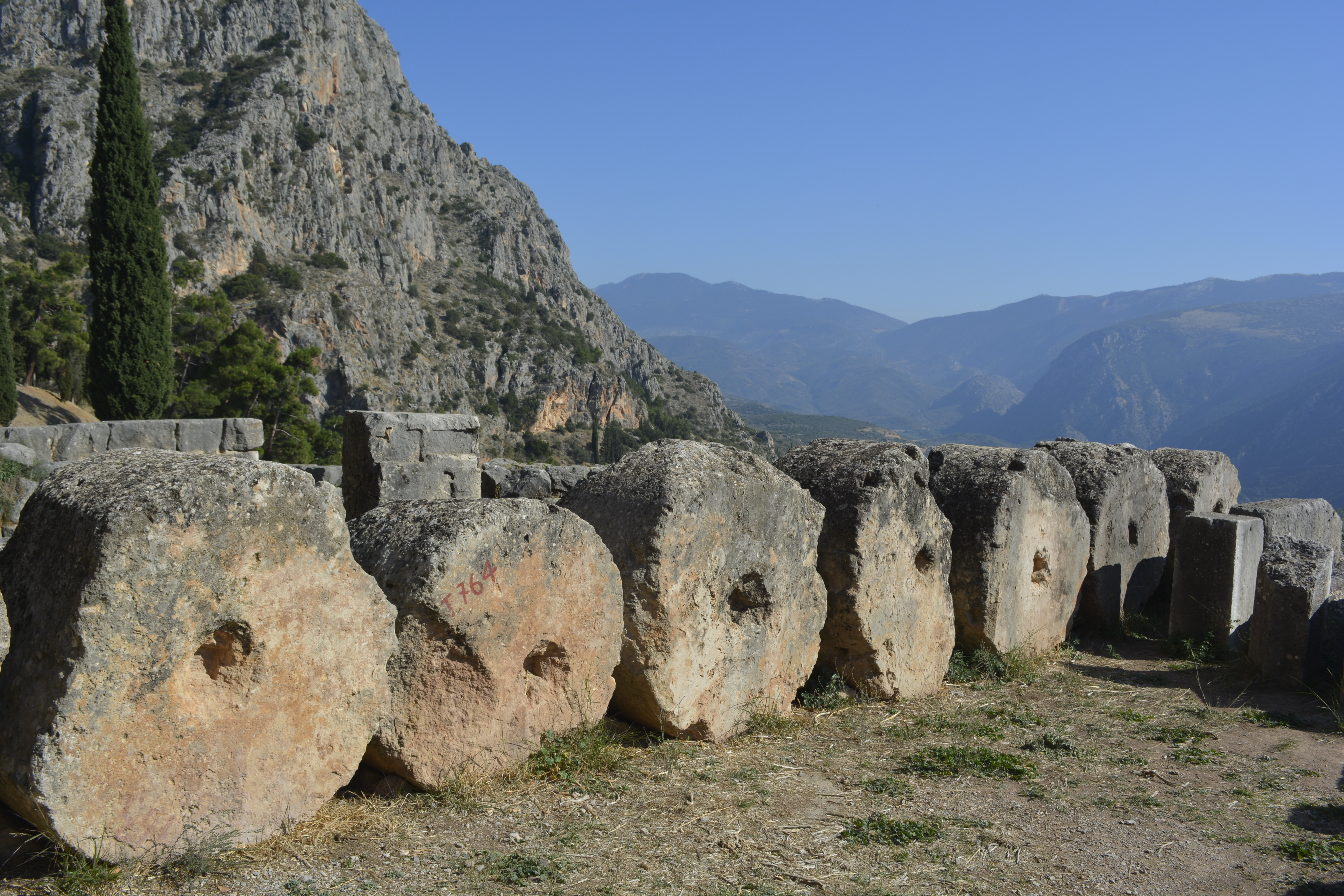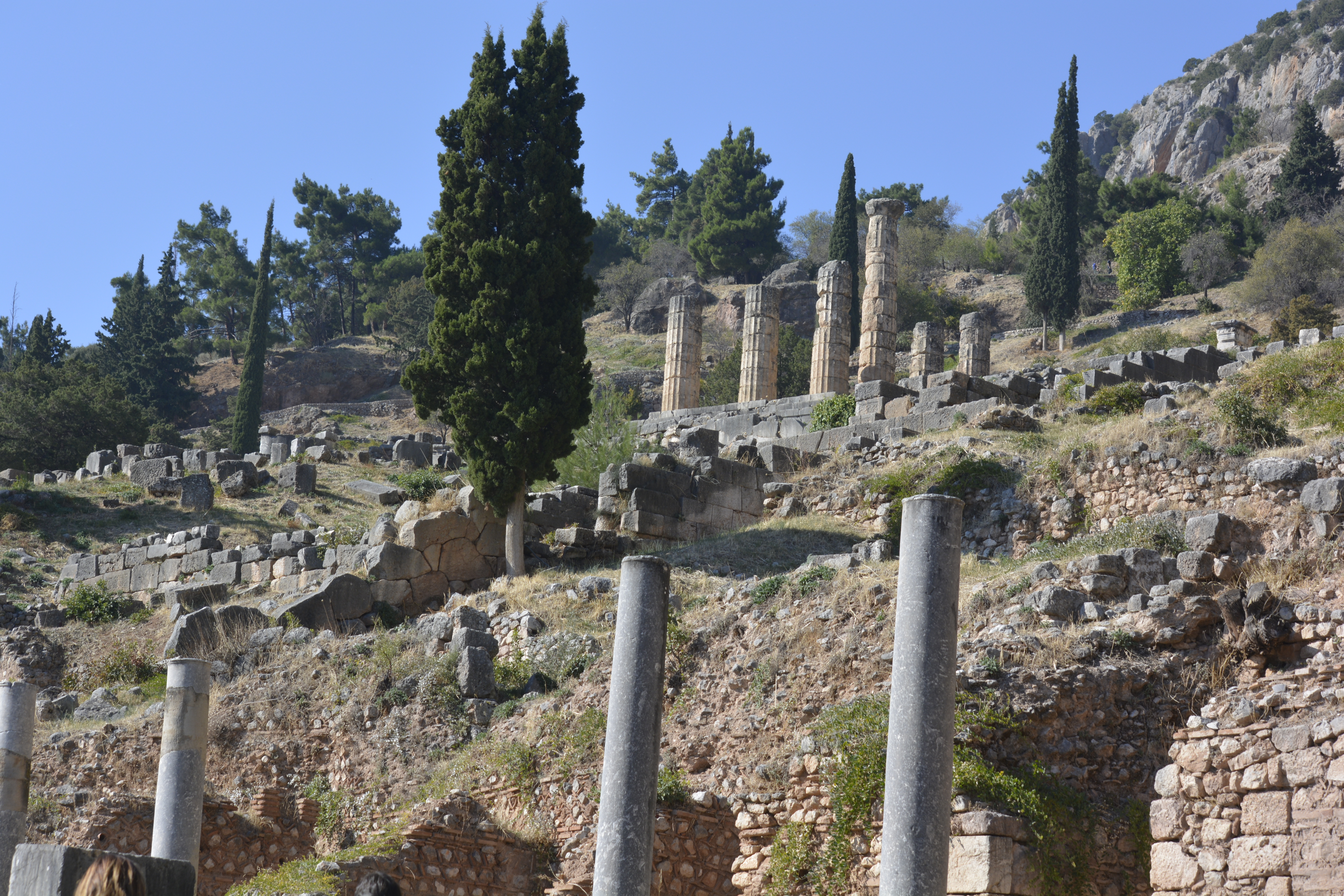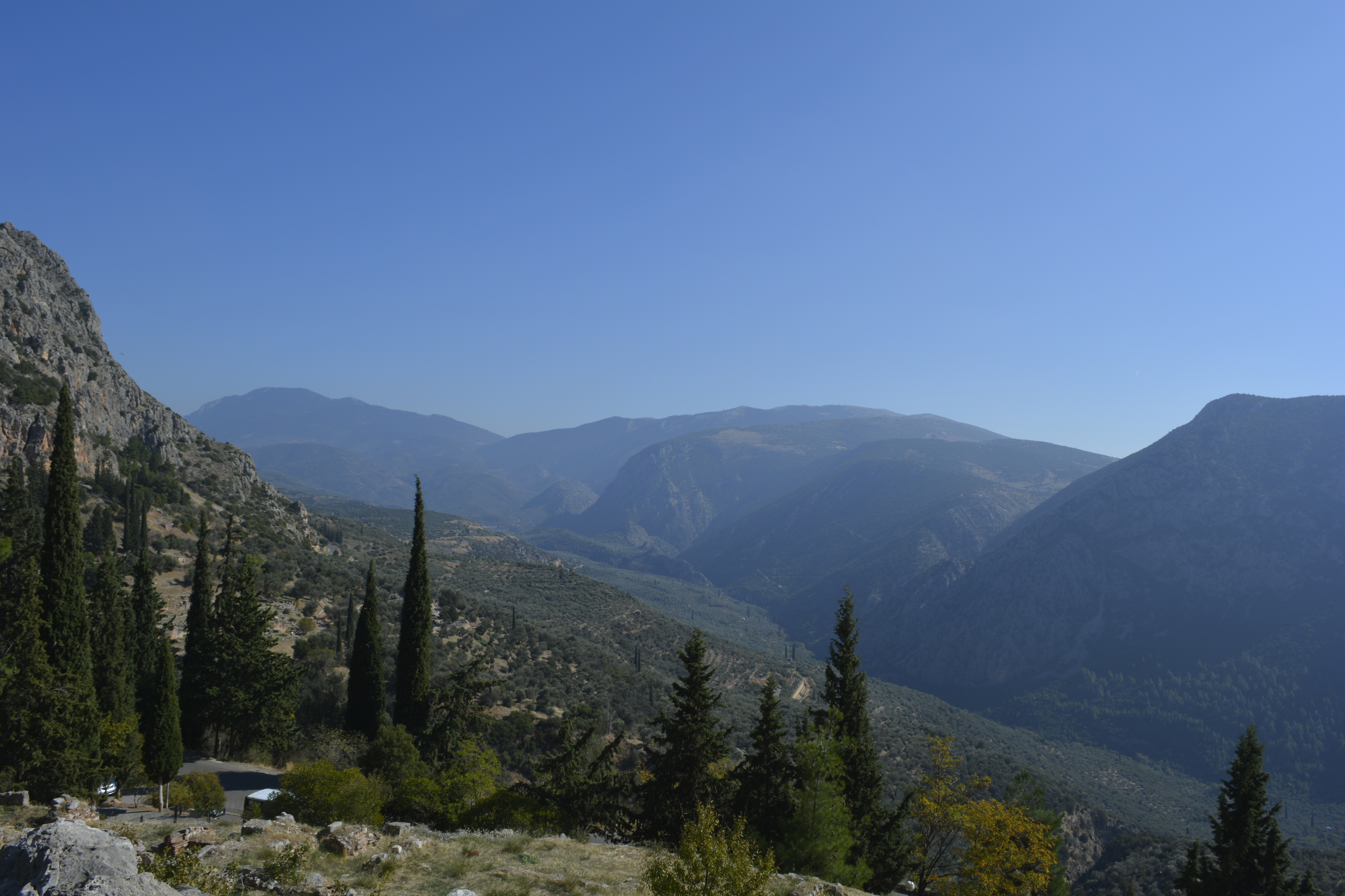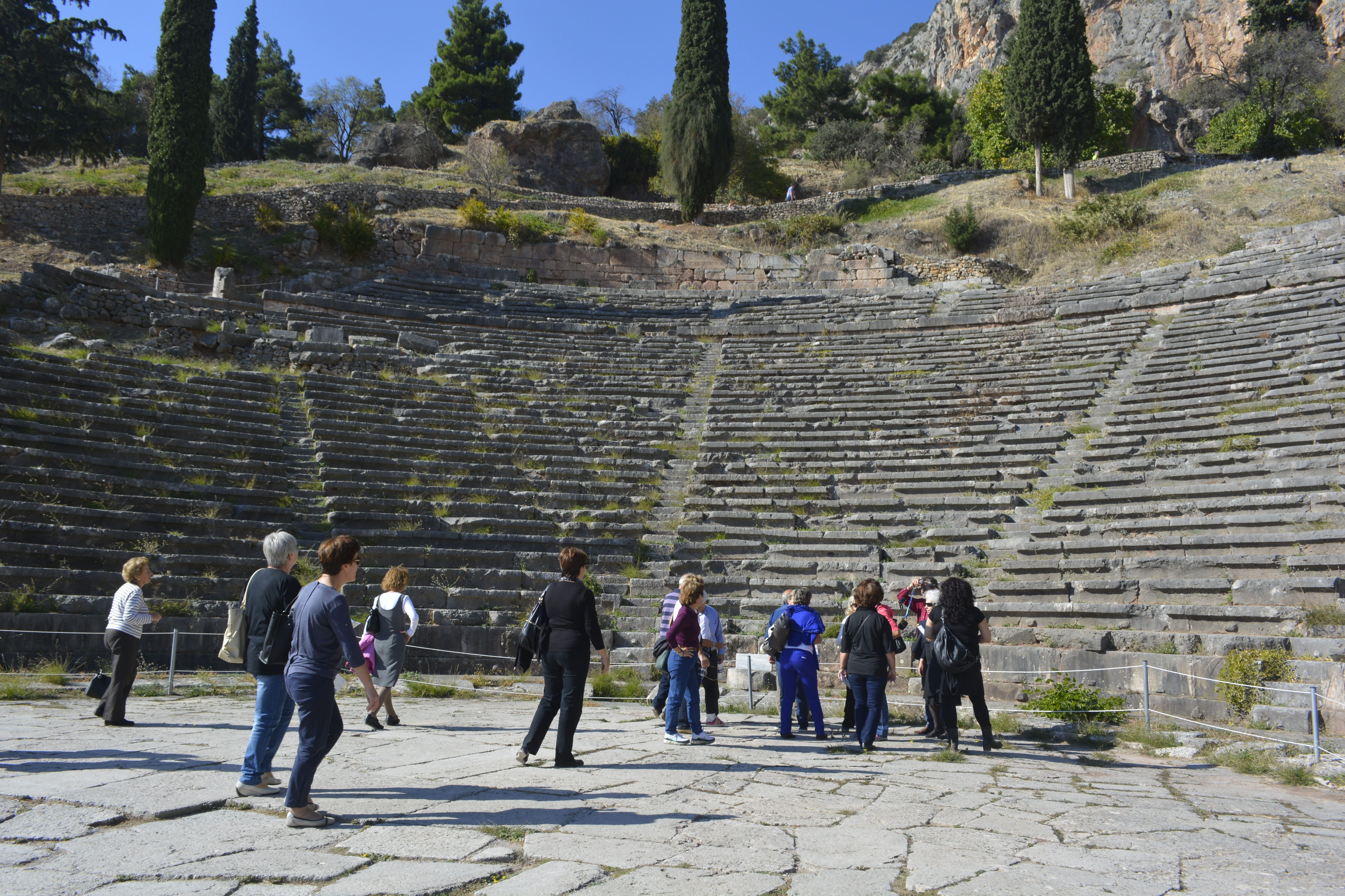 When we finished with the museum, many of us made our way to the stadium at the top of the hill. We walked past the temples, theatre, and treasuries that are now gone, in ruin or reconstructed from the originals. The view of the valley is wonderful. The climb up this part of Mount Parnassus is steep, but you stop often to take in the ever-changing view, so it is actually not so bad. When we got to the top, I was disappointed in that I thought we would have a good view of the Gulf of Corinth. Unfortunately, that was not to be. Those of us who made the climb, made our way back down to the gate and on the bus. I really have to say that I think we had just the right amount of time here, but it would be nice to return someday and explore other areas nearby.