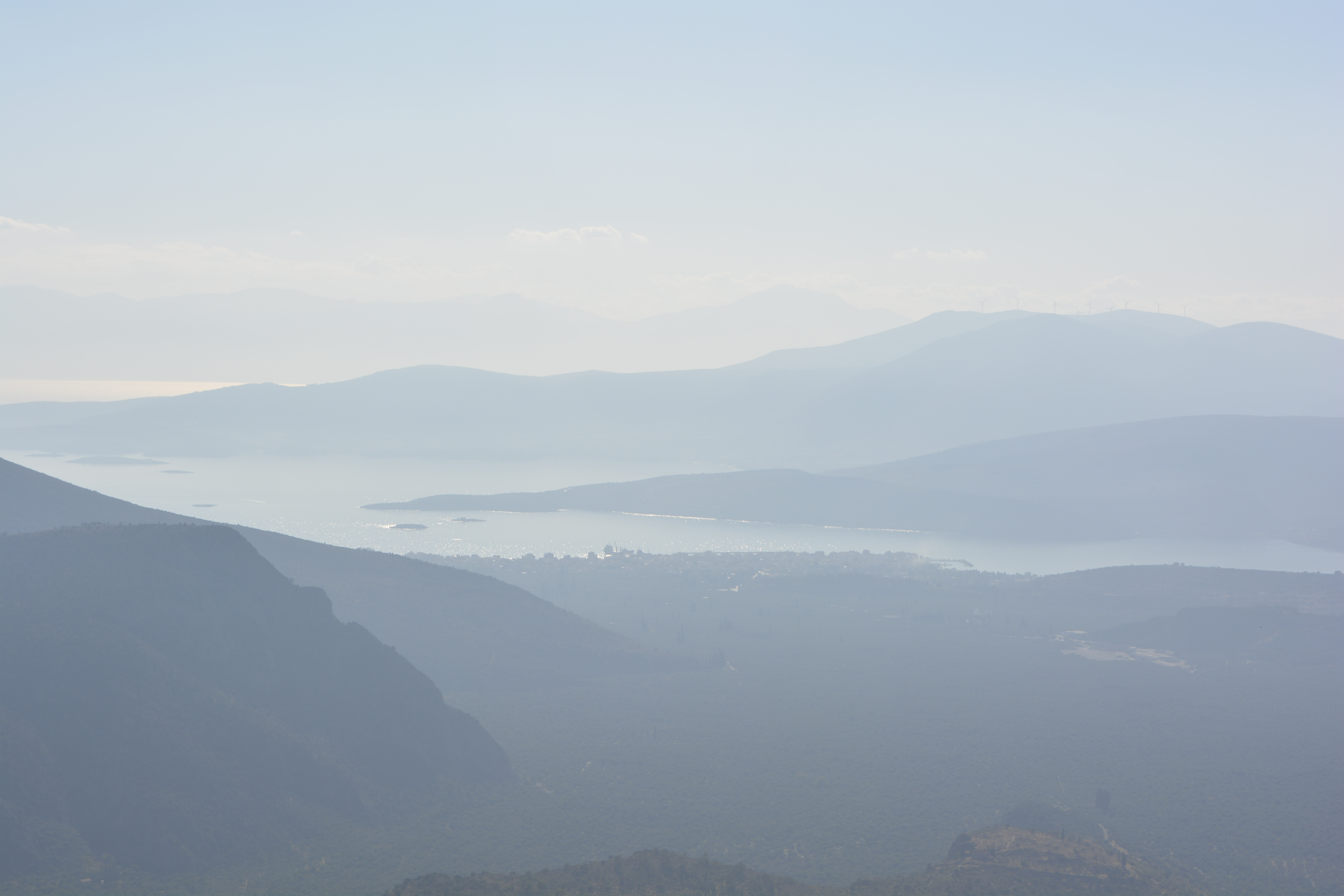 We had lunch in the modern town of Delphi. I did not prepay for lunch, so I brought my own and asked at the restaurant where I could go to eat. They directed me to a garden outside the restaurant itself. And there, lo and behold, was a chair and round wrought iron table under a tree——- with a spectacular view of the Gulf of Corinth below! I’ve often said that this whole trip through Turkey and Greece was magical—– and here the last full day, magic again! Some of the people on the tour made their way out to take in the view after lunch.