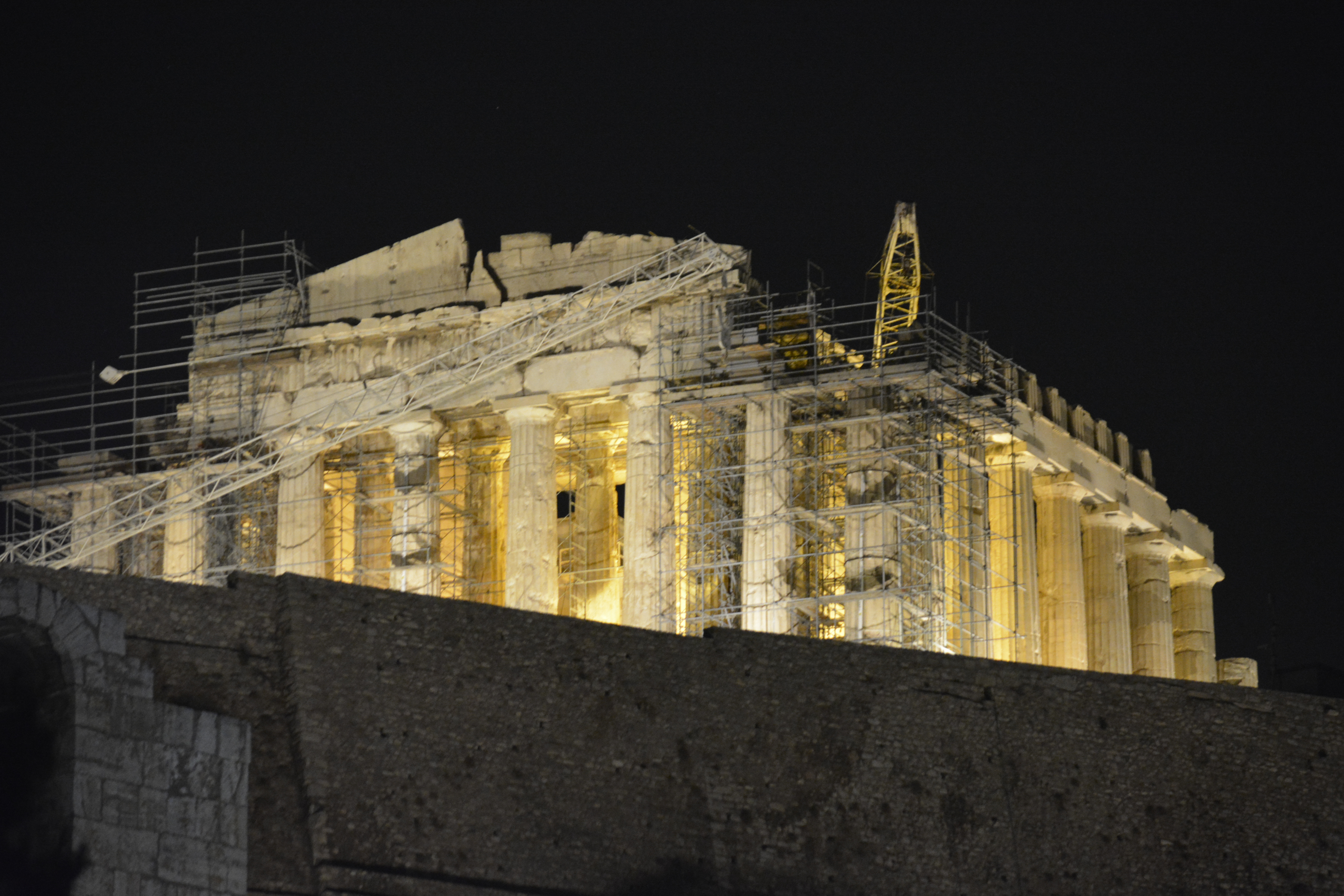 At late afternoon, I was at the old Greek Agora. I had two entrance tickets left on my pass, so I entered and walked the pathways again taking pictures of the Acropolis as nightfall came. I then took a last walk around the base of the Acropolis, and had dinner at a restaurant on the Plaka. A nice way to say goodbye to Athens.