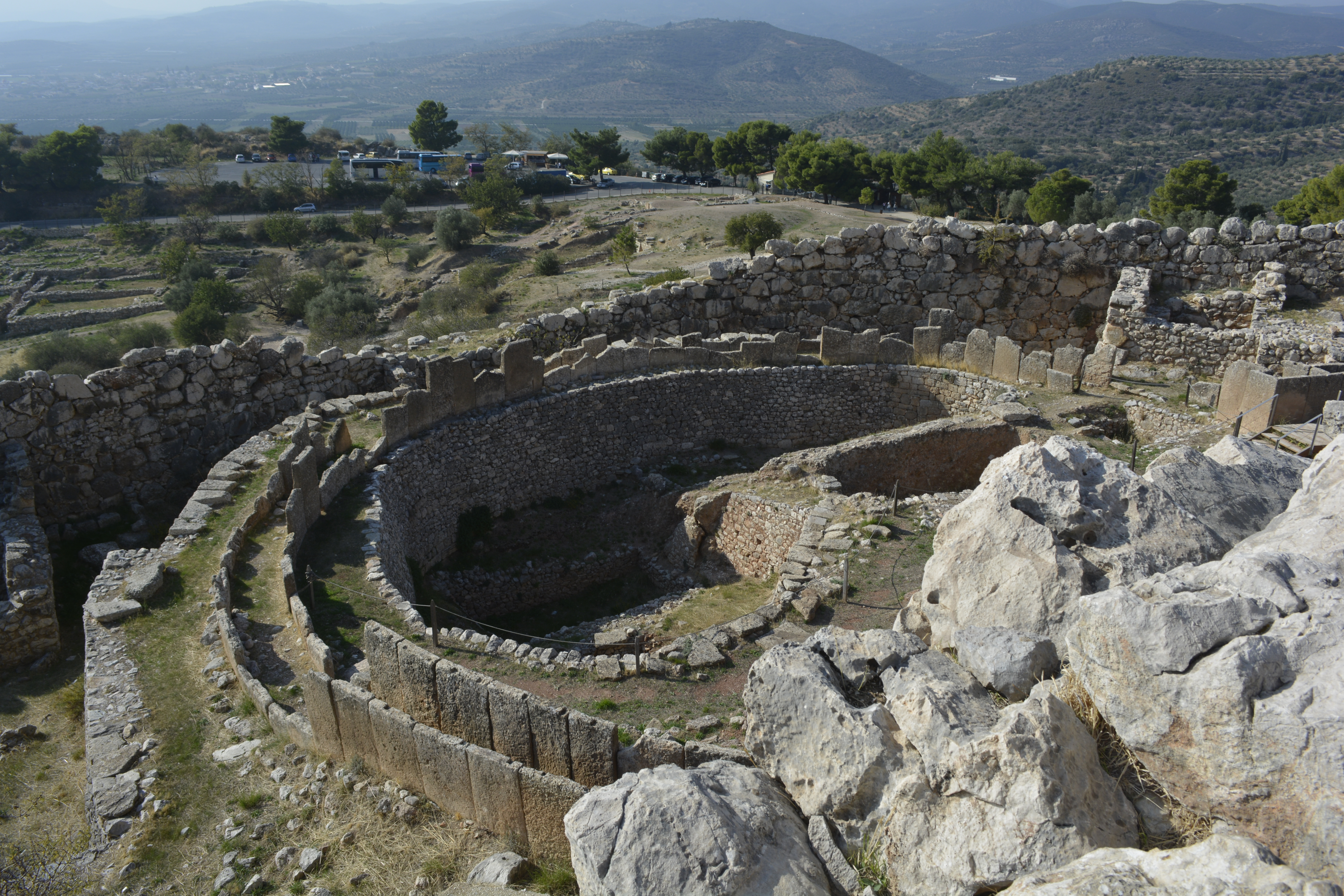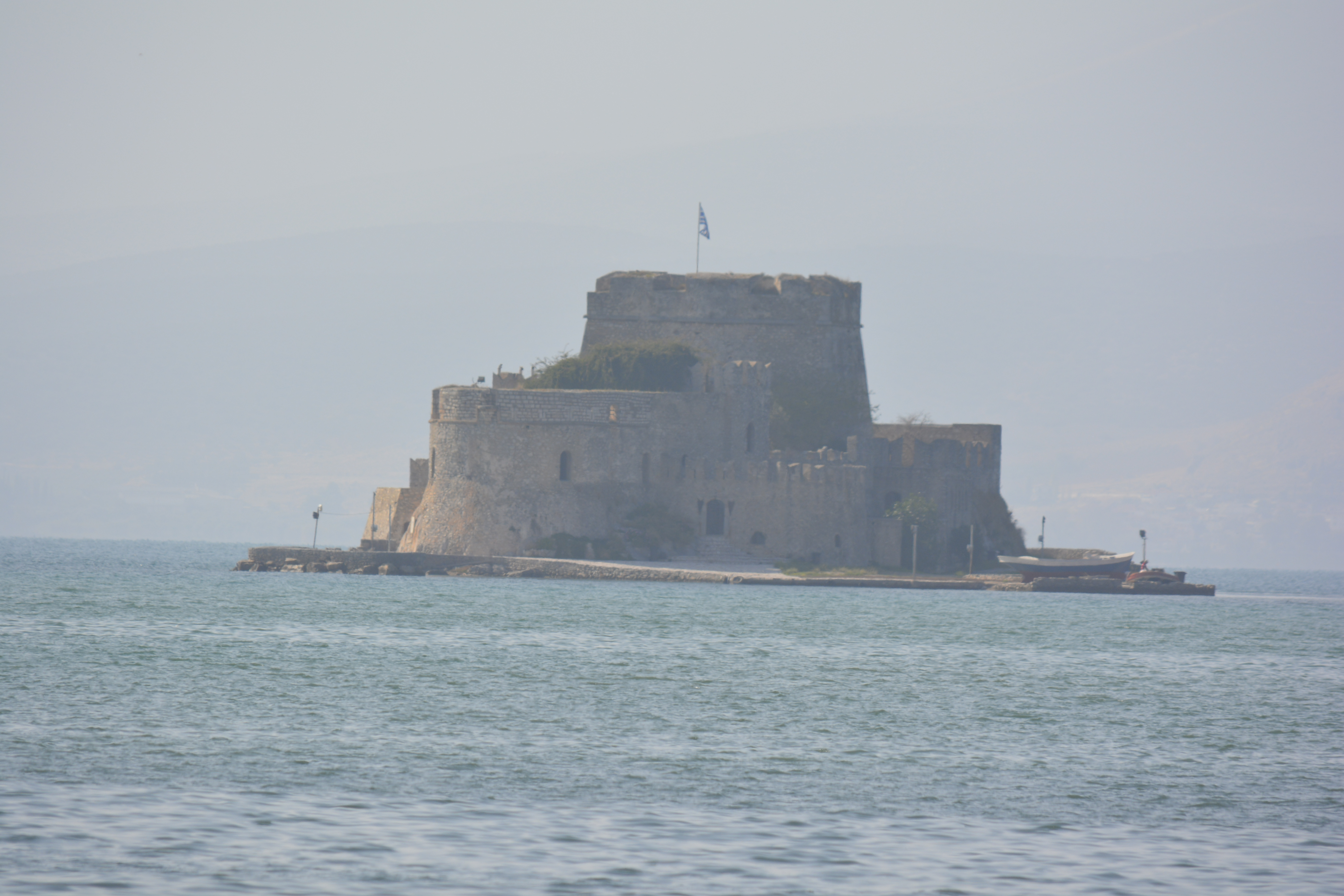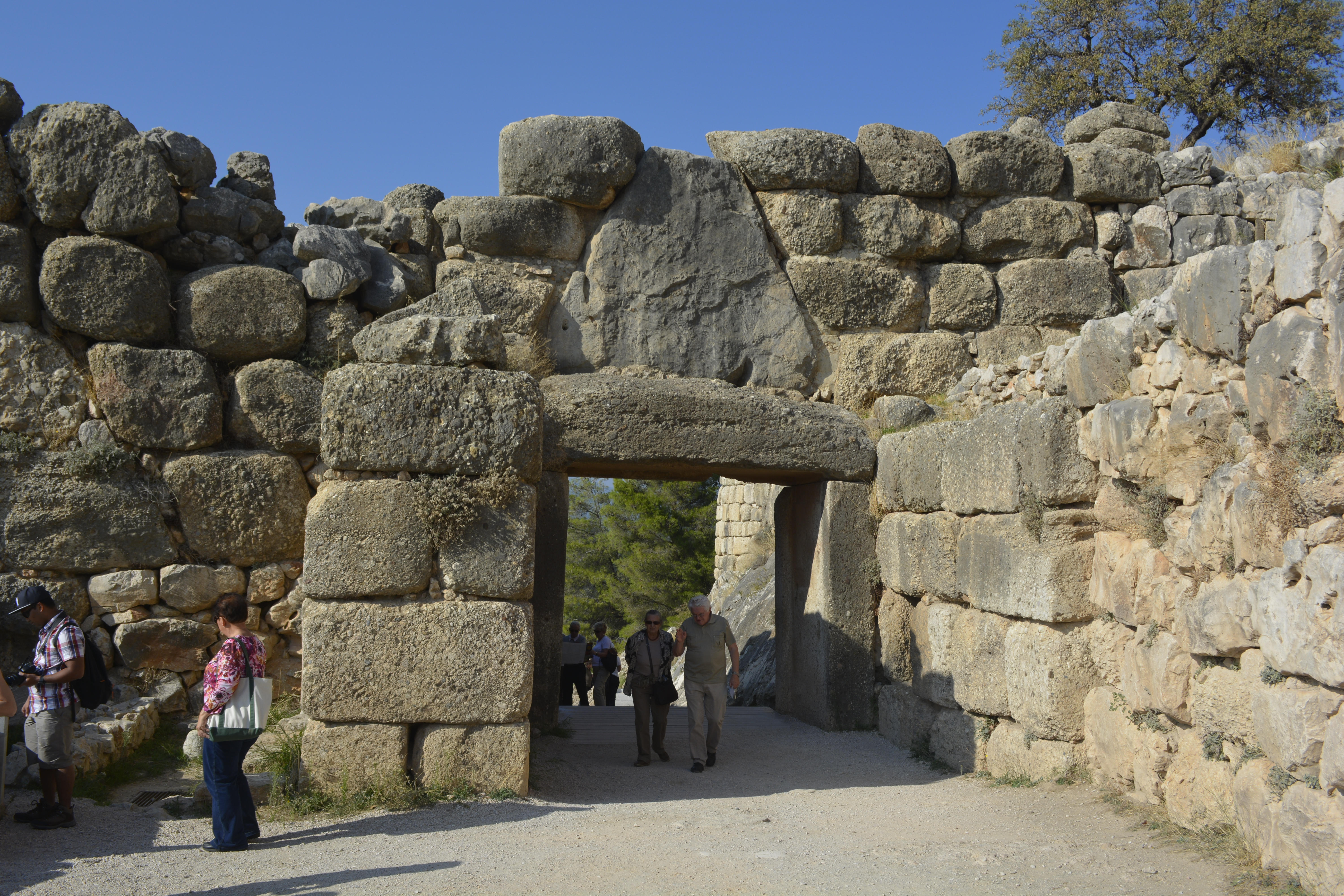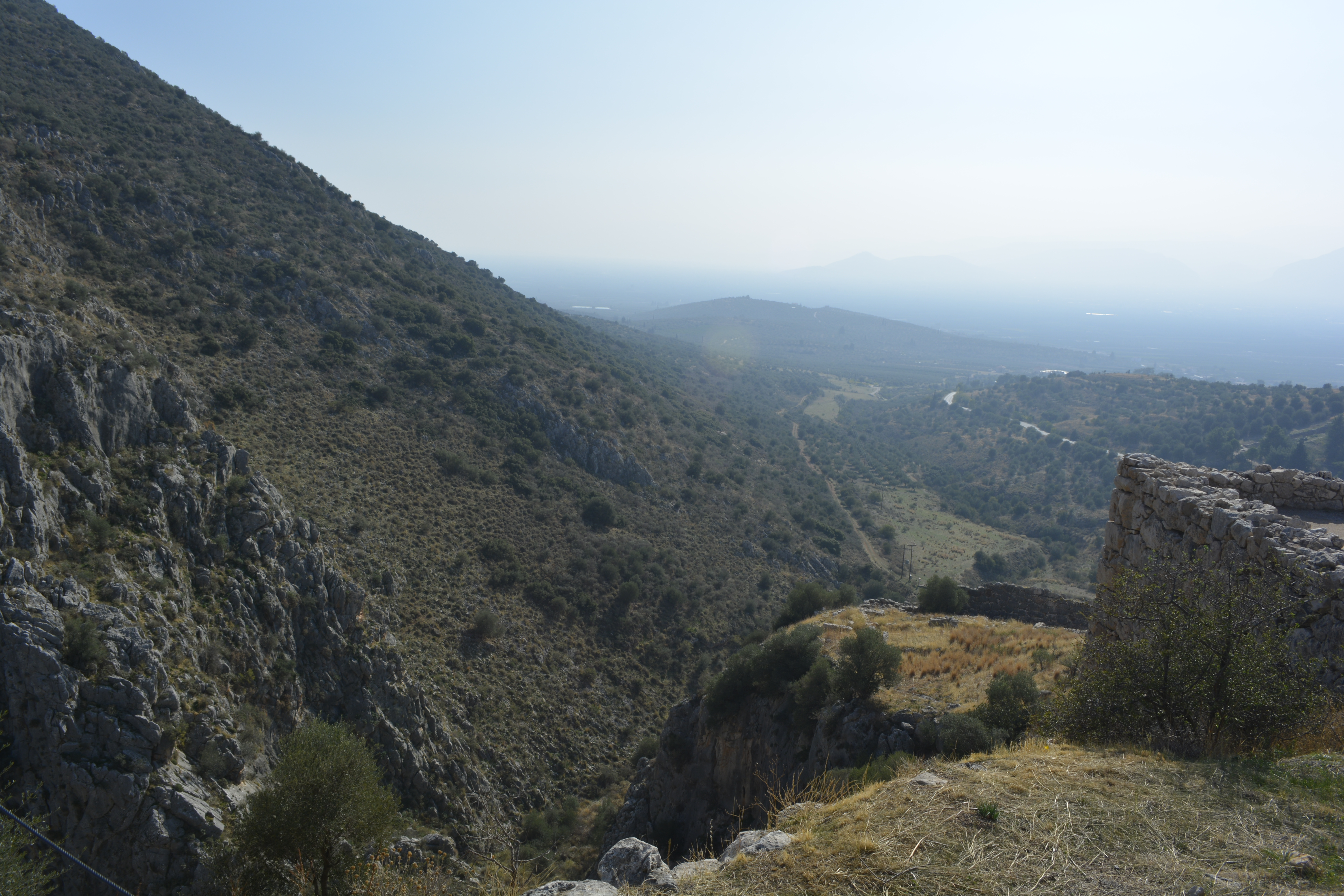 On our way to Mycenae, we took a side trip to Nafplio, the first modern capital of Greece after the country achieved independence from the Turks in the 19th Century. We quickly drove through the small city to the seacoast. We stopped at a refuse cluttered area near the railroad tracks. The day was hazy, but we were encouraged to get off the bus to see the acropolis of the town high above and the remnants of two fortresses, one built by the Venetians. I wasn’t the only one bewildered as to why we stopped here for 20 minutes. You really couldn’t take any pictures as it was extremely hazy and we were quite a distance from any of these sites! This time lost became important when we final got to Mycenae shortly thereafter and discovered that, as it was now November, the site closes at 3PM. This gave us a little less than an hour to see the whole site!