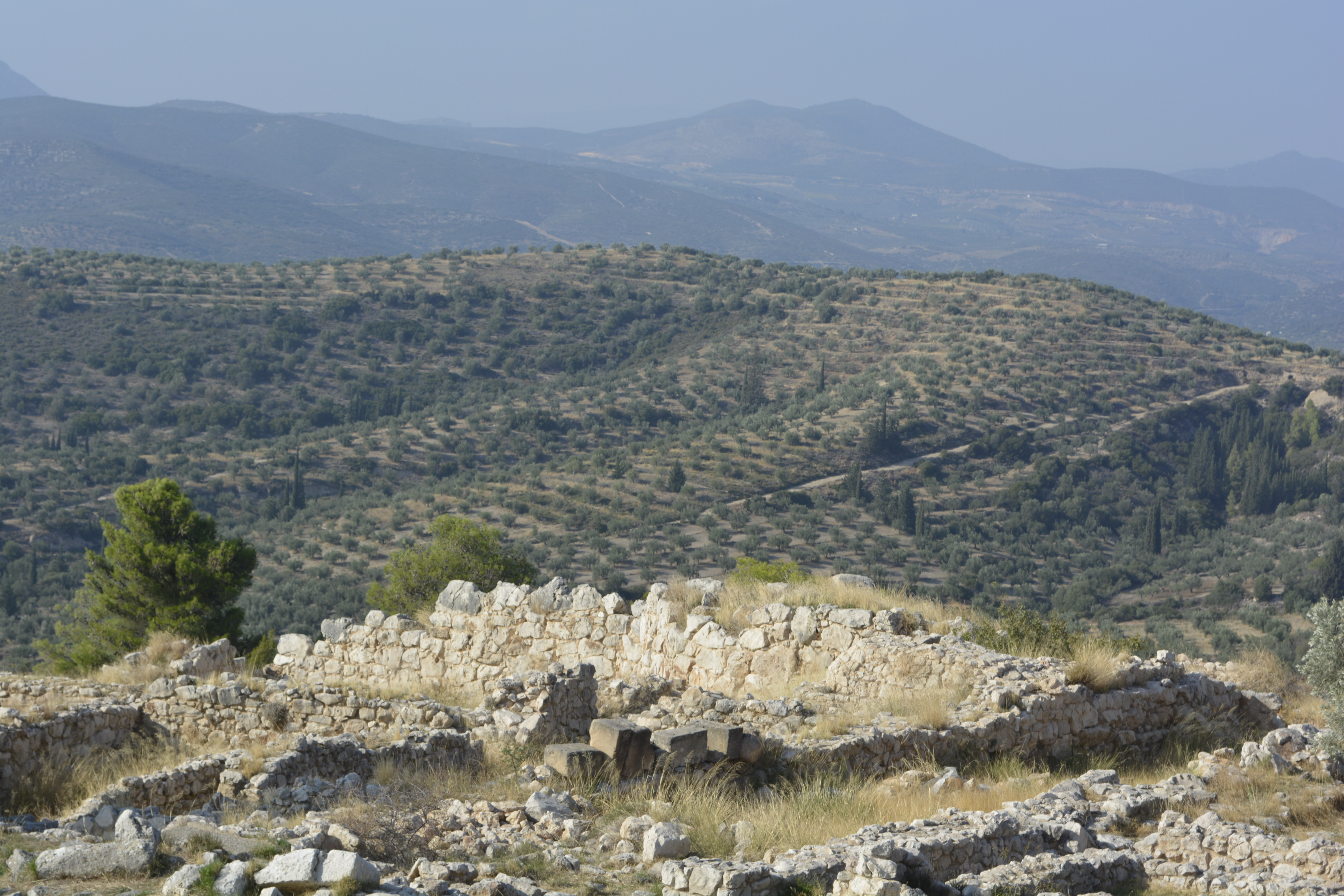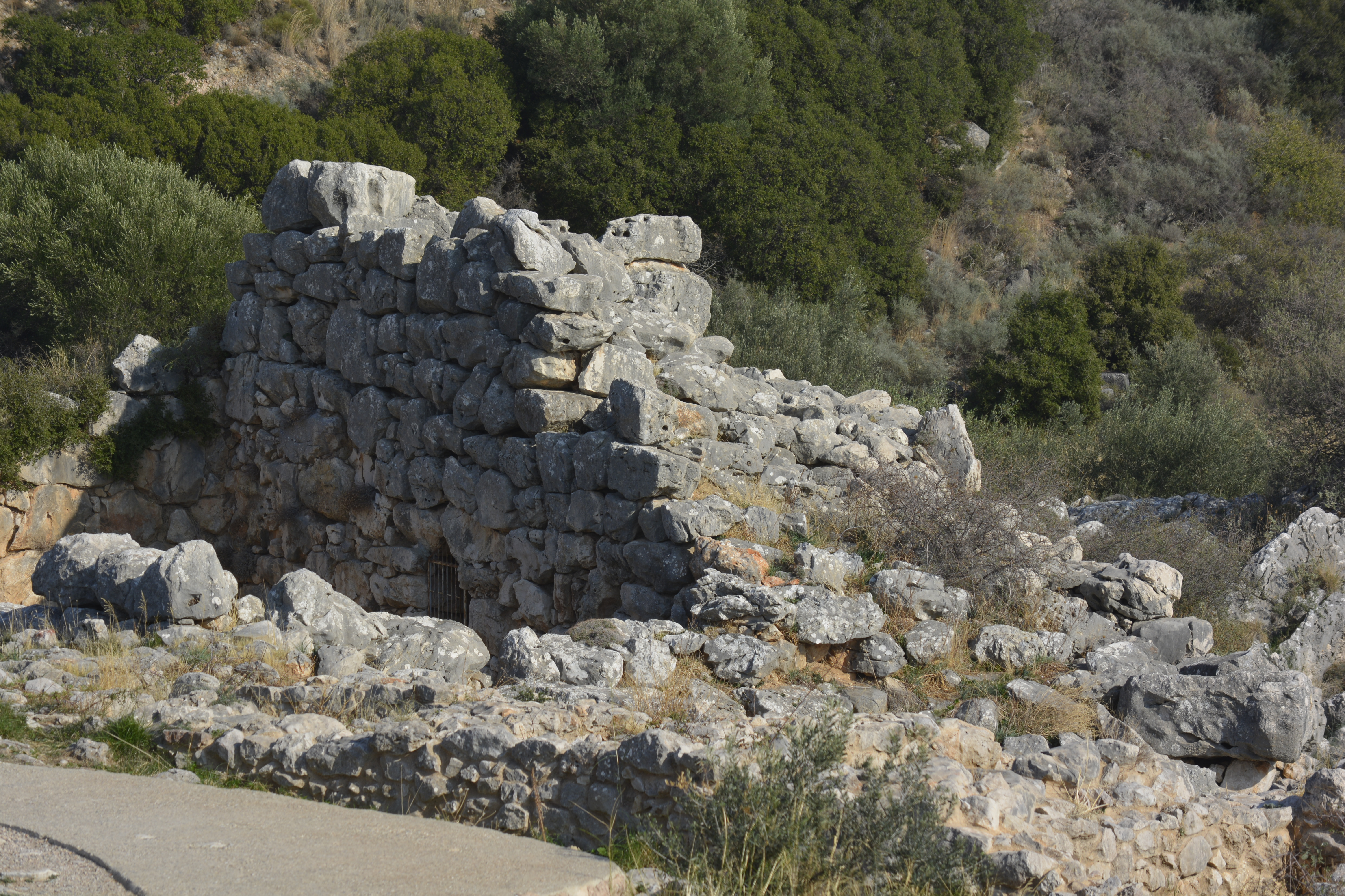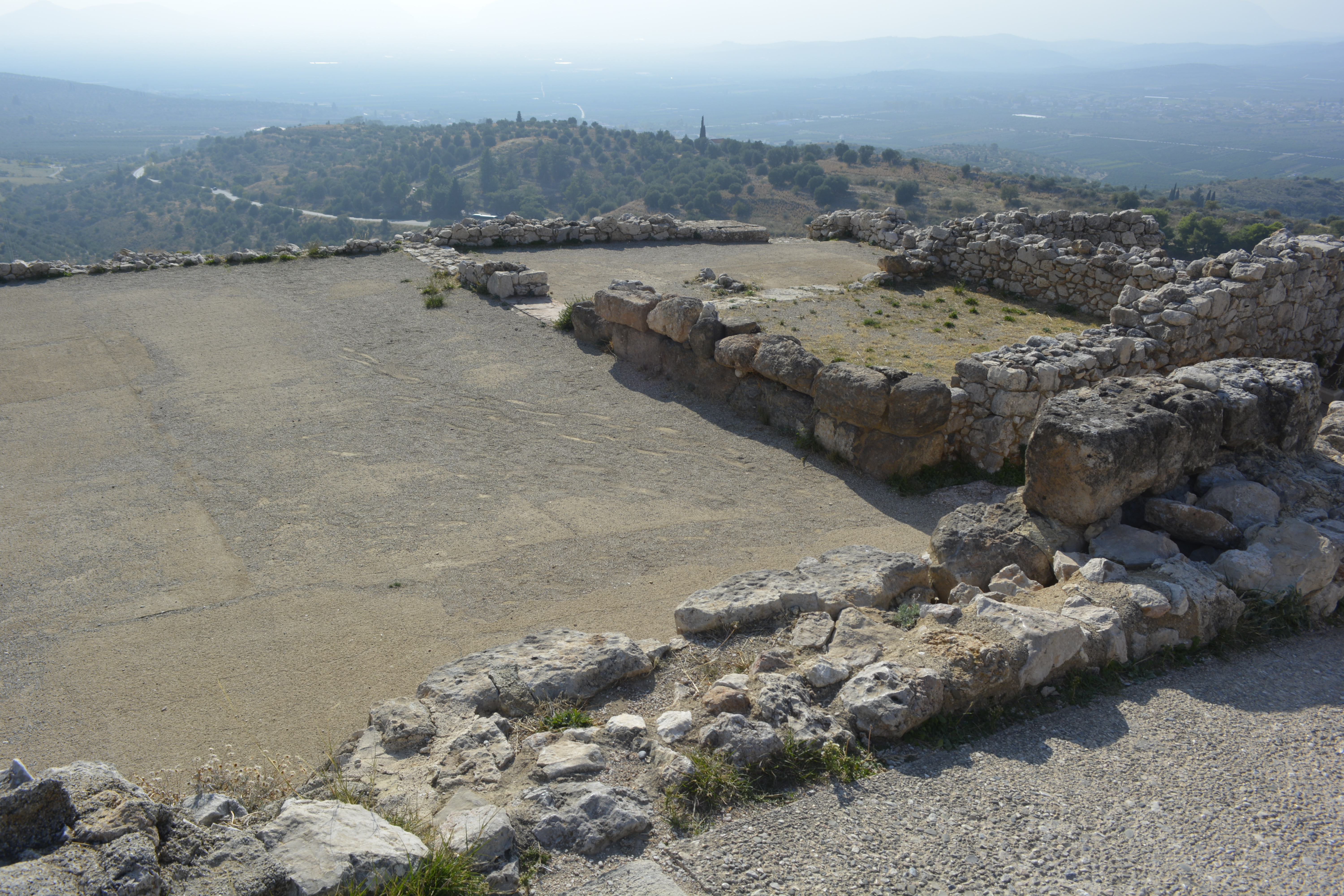 On our way to Mycenae, we took a side trip to Nafplio, the first modern capital of Greece after the country achieved independence from the Turks in the 19th Century. We quickly drove through the small city to the seacoast. We stopped at a refuse cluttered area near the railroad tracks. The day was hazy, but we were encouraged to get off the bus to see the acropolis of the town high above and the remnants of two fortresses, one built by the Venetians. I wasn’t the only one bewildered as to why we stopped here for 20 minutes. You really couldn’t take any pictures as it was extremely hazy and we were quite a distance from any of these sites! This time lost became important when we final got to Mycenae shortly thereafter and discovered that, as it was now November, the site closes at 3PM. This gave us a little less than an hour to see the whole site!