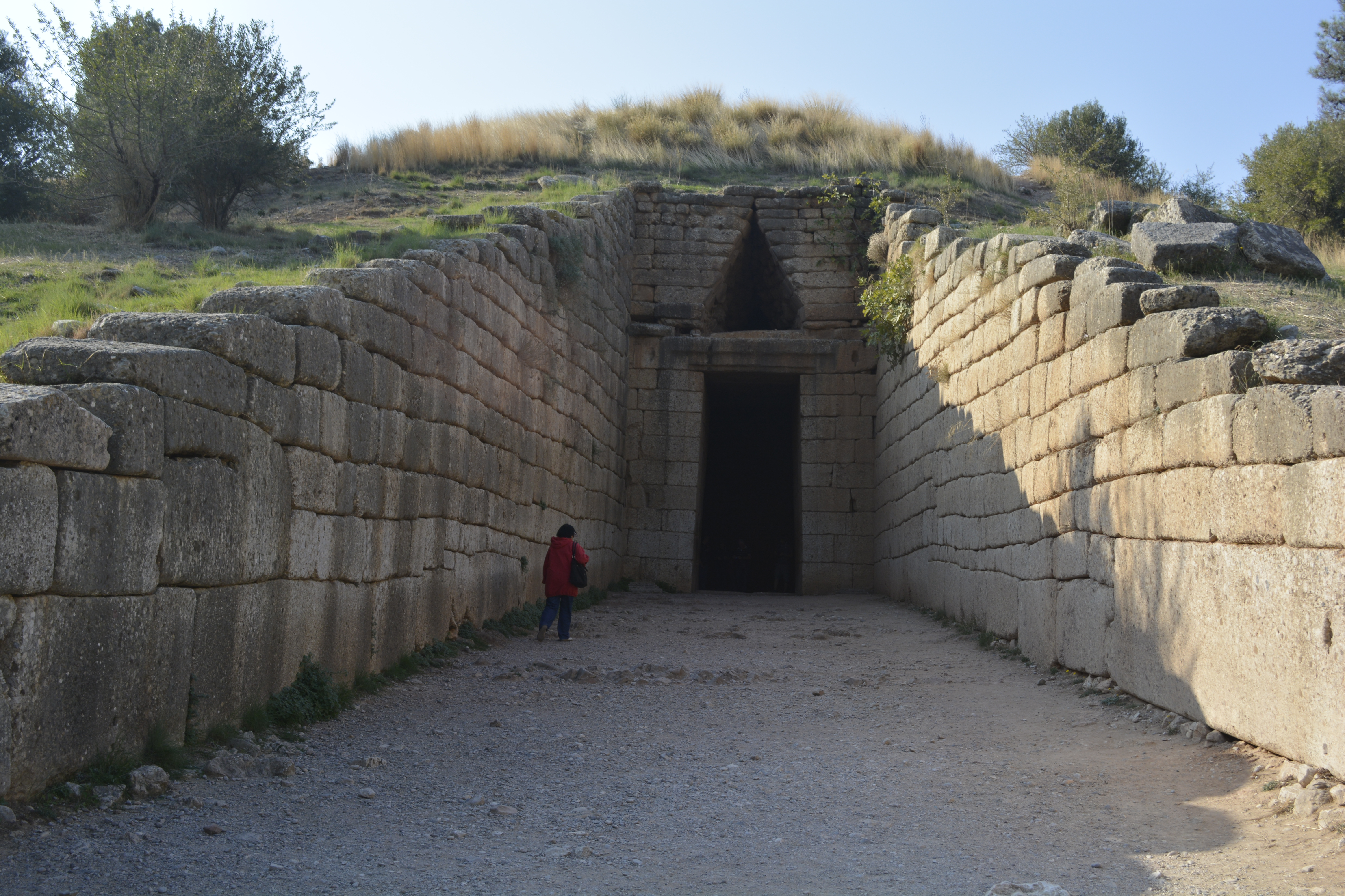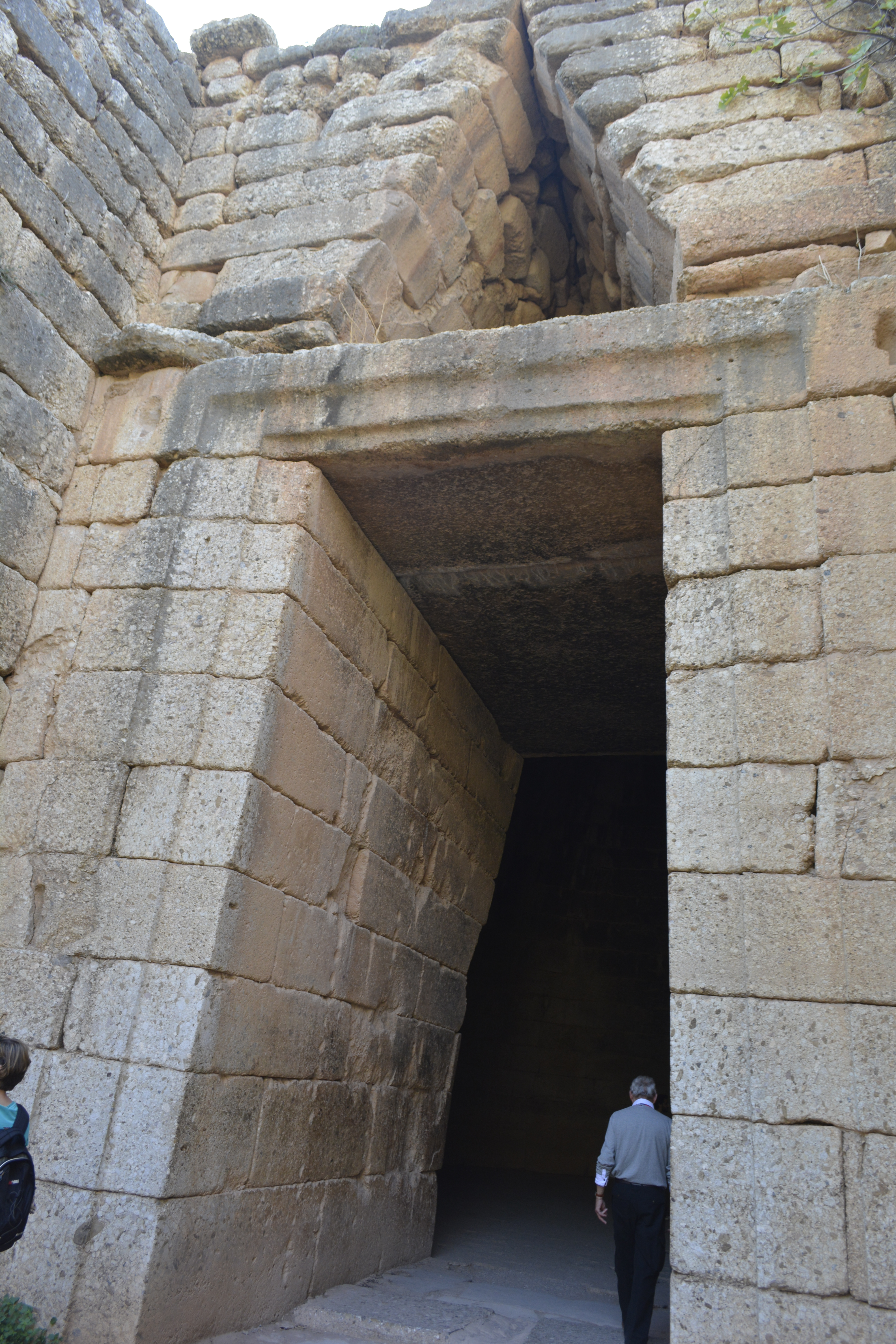 As we left the site, we stopped at the Treasury of Atreus. This is an amazing beehive-shaped structure built into the side of the hill. I am again stunned by the stonework. Considering it was built circa 13th Century BC, I wondered how they managed to construct this with the perfect cone shape of such tight-fitting stones. I went ahead of the tour entering the tholos and marveled at the sound magnification created by simply scuffing your foot along the dirt floor. Looking up at the ceiling, I was in awe of its perfection.