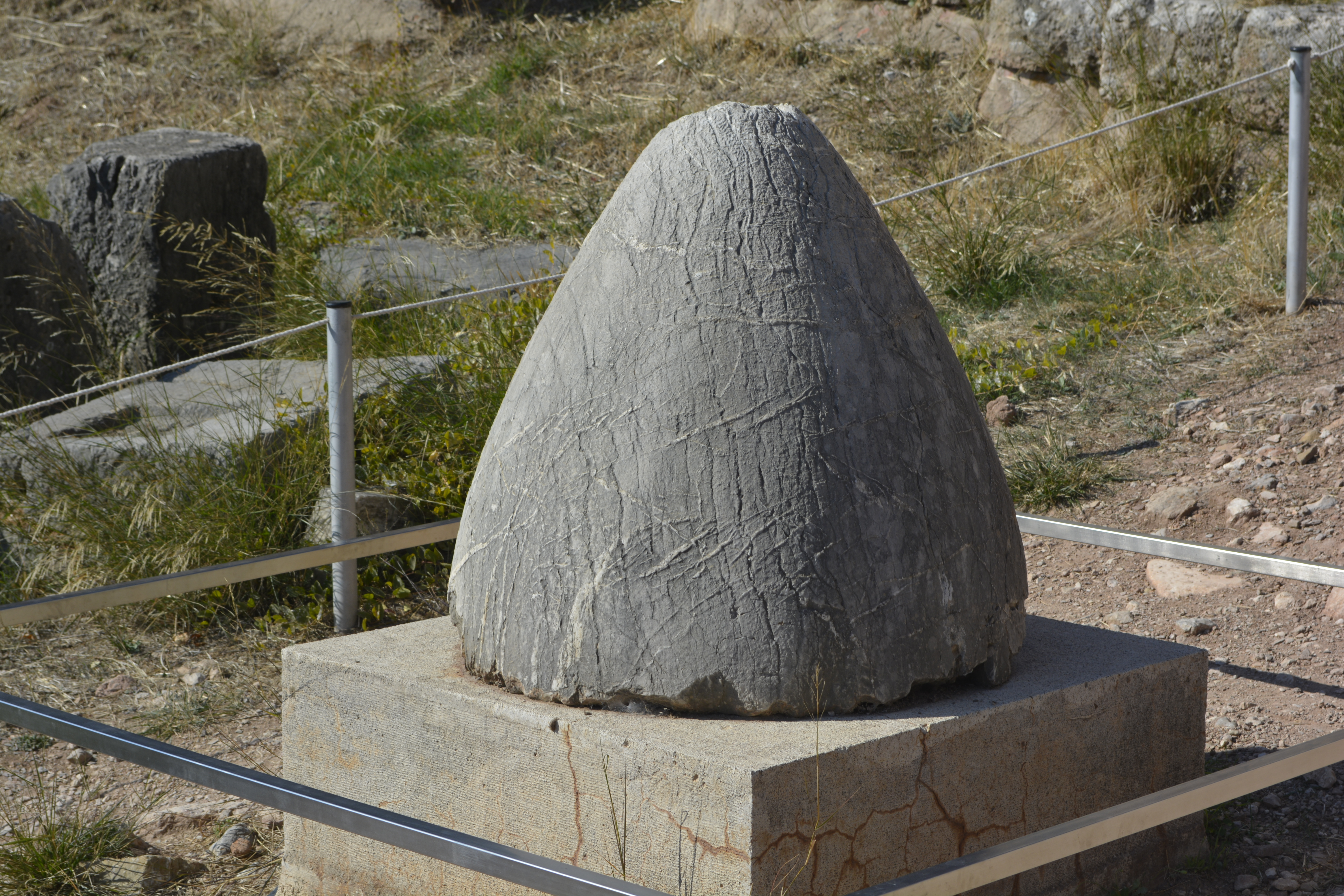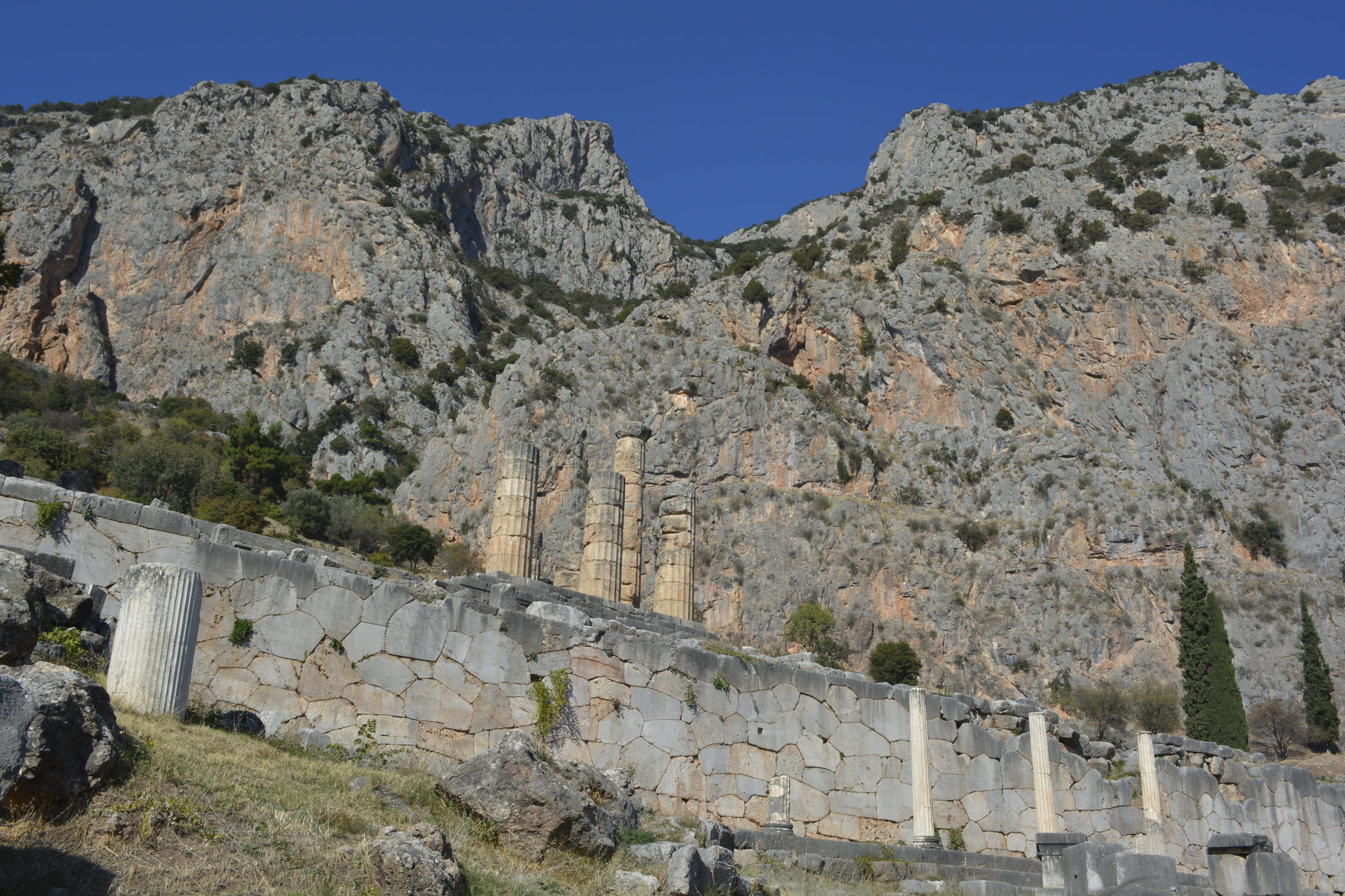 The last full day in Greece! And off I went on another guided tour. (I had gotten a great deal on both the Mycenae and Delphi day tours as it was the end of the season and the tour company was anxious to fill its buses!) What a difference a knowledgable, engaged tour director with a good PA system on the bus can be! The trip to Delphi took about 2 1/2 hours. We saw the field of Marathon, 26 miles west of Athens. It is here that the Greeks won an important victory against the Persian armies. One of the soldiers ran in full armor all the way to Athens to make the announcement to the nervous population awaiting news of the battle. As soon as he gave the news, he reportedly fell dead from exhaustion. We drove past the city of Thebes and fields full of cotton. It must have been harvest time as we saw trucks loaded with cotton and the white, fluffy tuffs blowing along the side of the roadway.