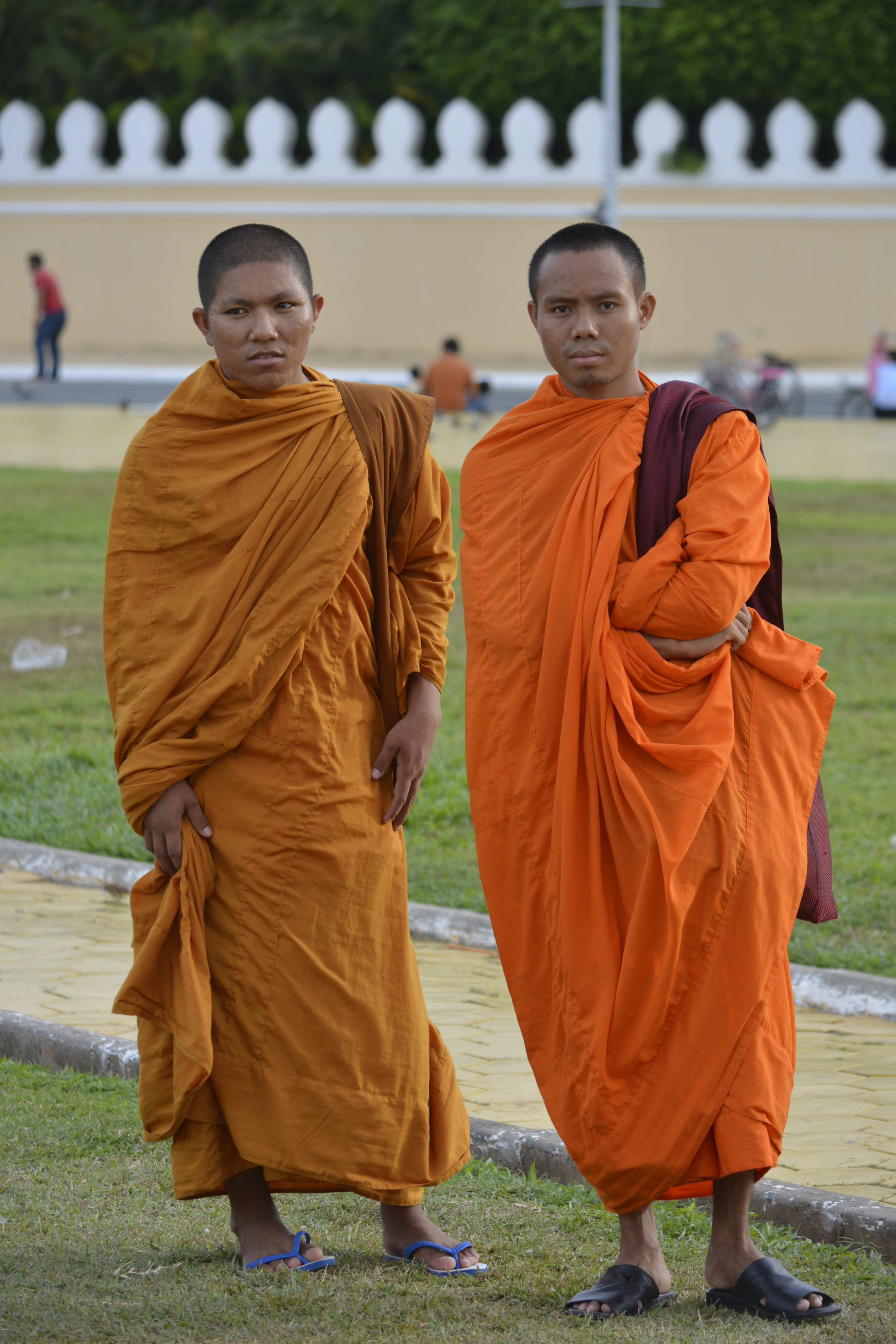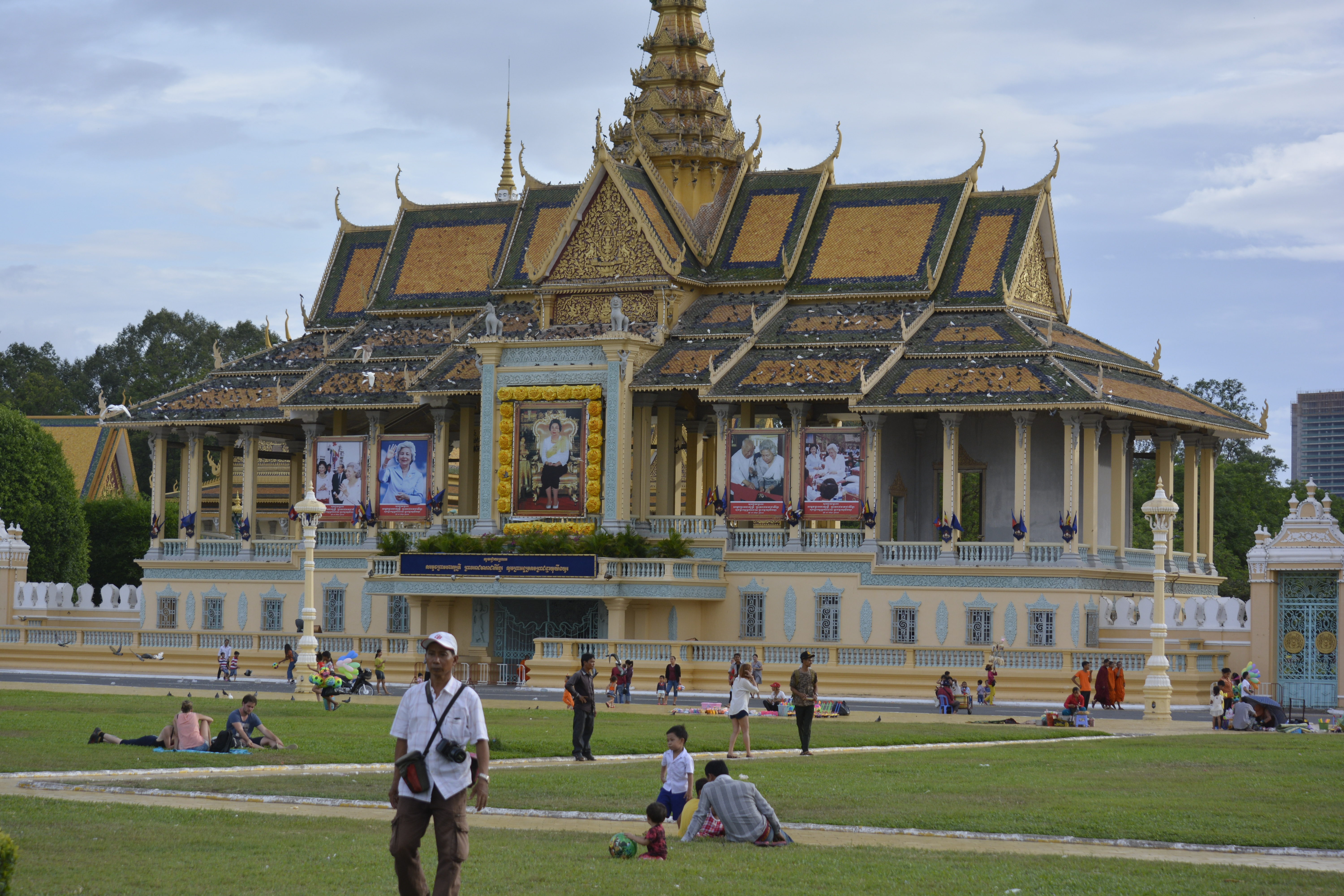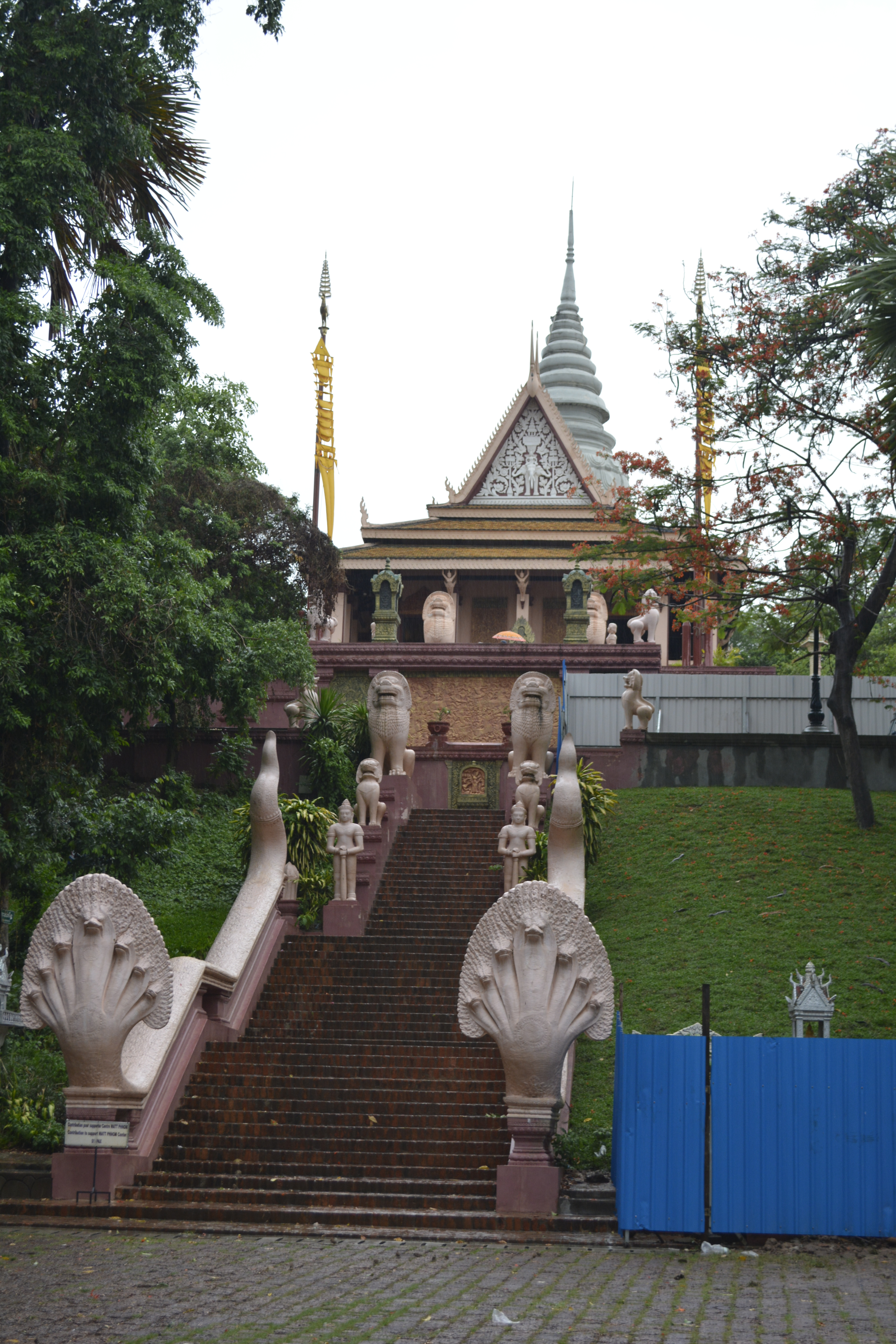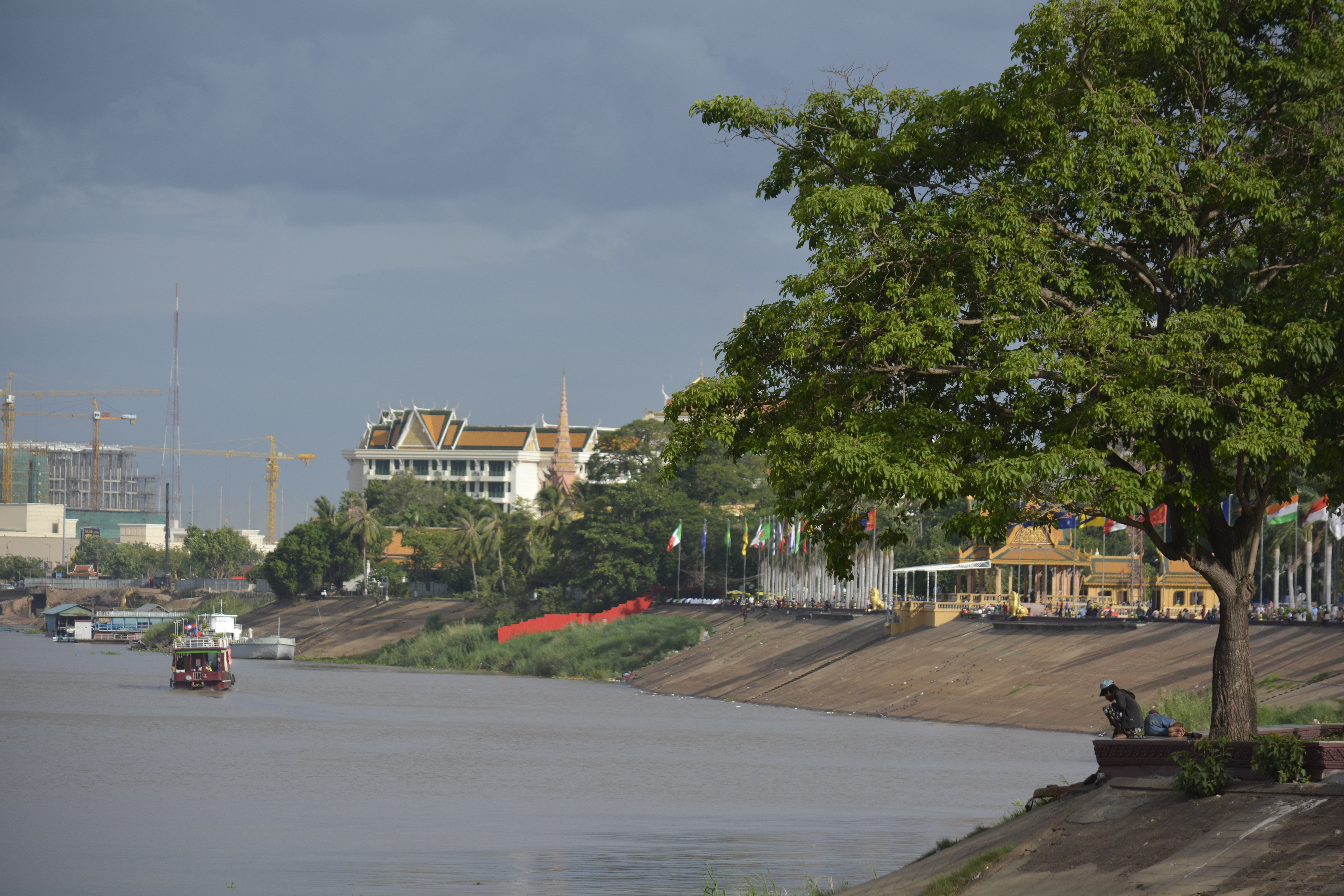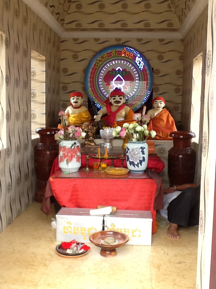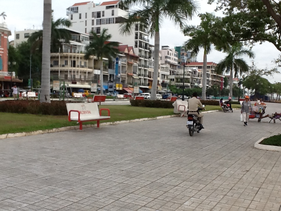 I arrived in time to take an evening walk along the river to the place where it joins the wide Mekong. I love this walk along the promenade. So many people are here. There is always a breeze, so many take advantage of it for some relief from the hot, sticky weather of this time of year. Unlike Thailand that is experiencing a drought, Cambodia has rain daily in some form. Today we are lucky, the rains fell earlier, so the air is bearable. People are out on the commons before the Grand Palace picnicing, talking with friends, engaging in group exercises, arranging rendez-vous, or even making offerings for good fortune at one of the temples and shrines large and small in the area. Many with a Hindu flavor to the predominant Buddhism.