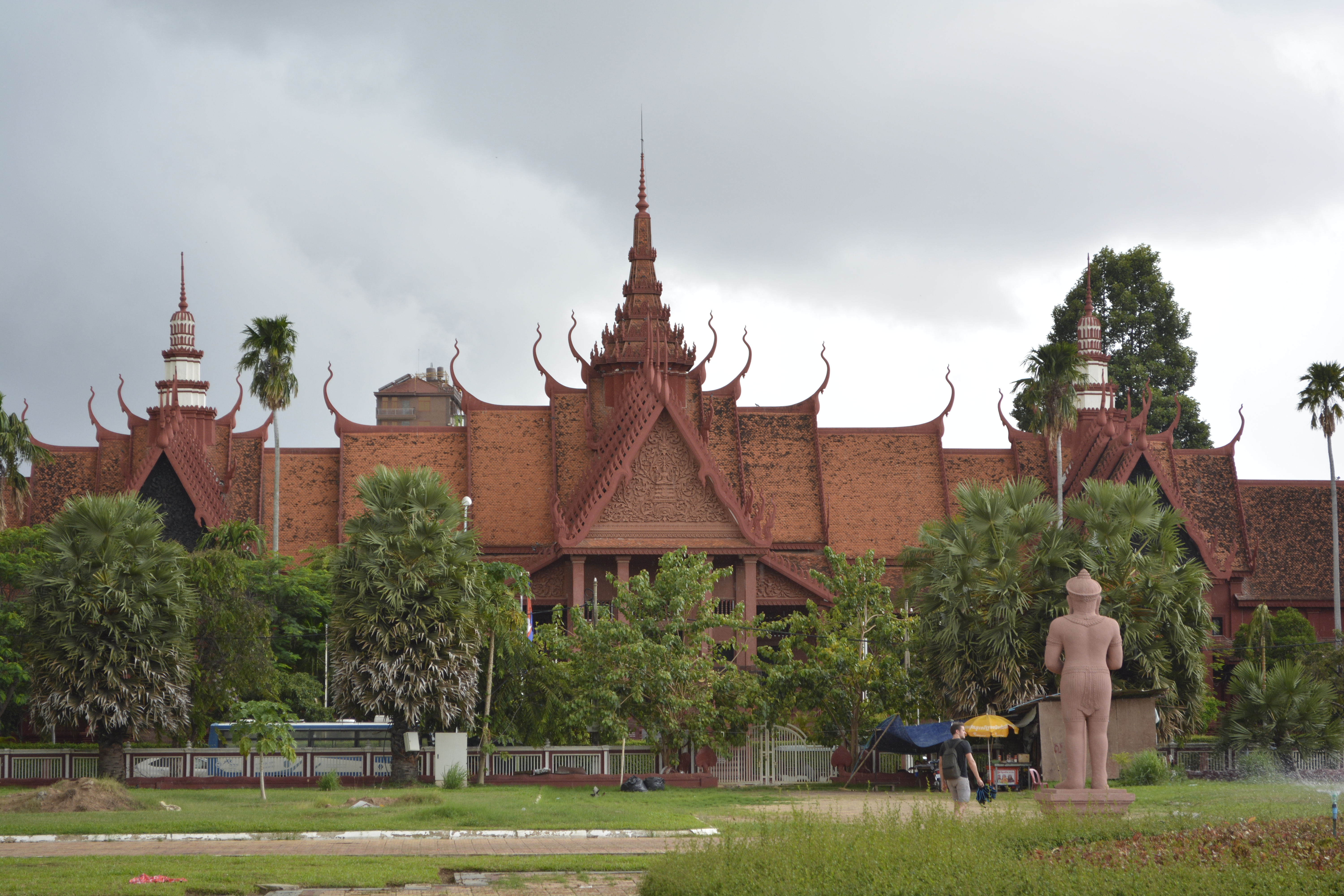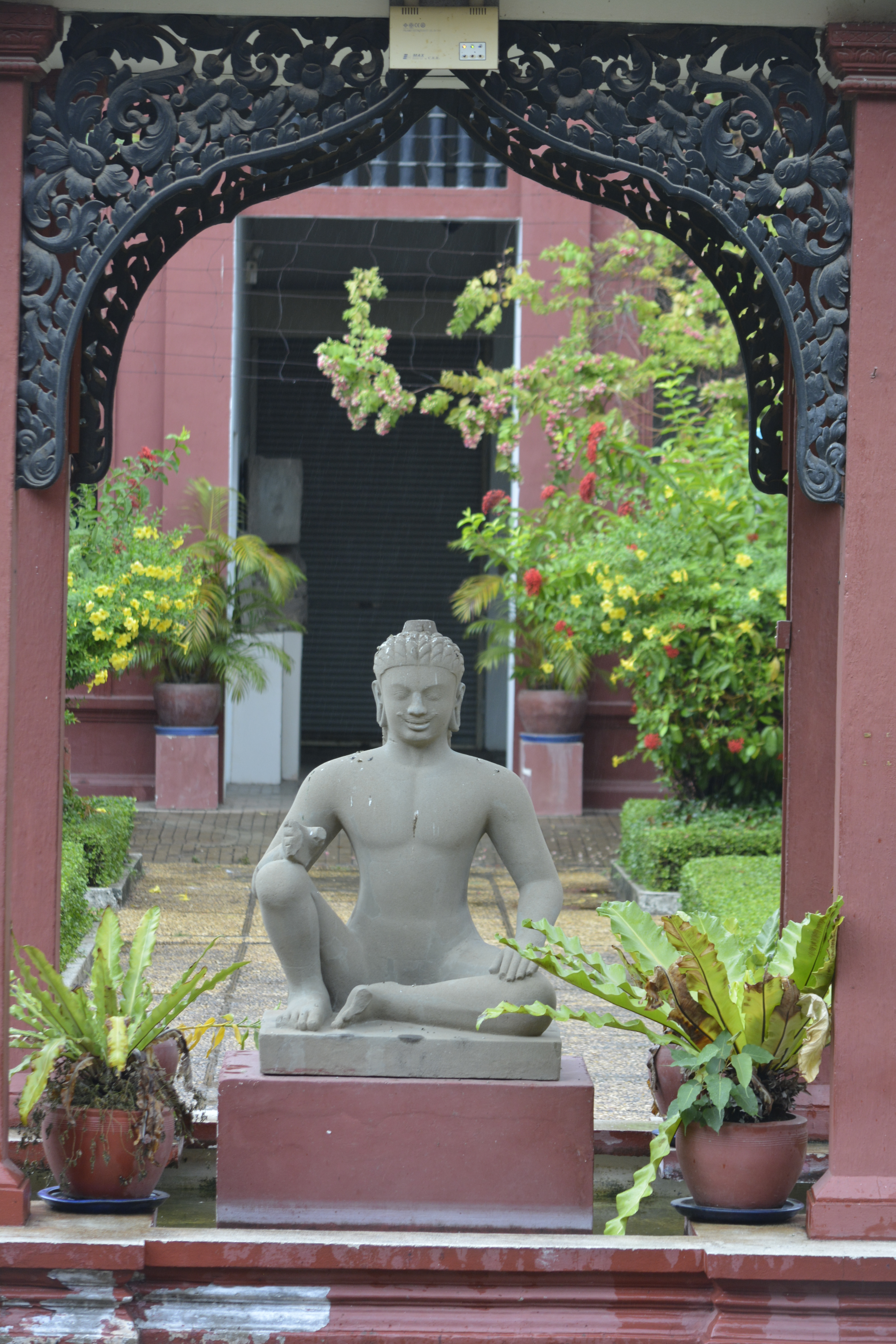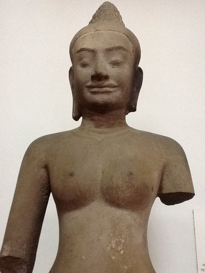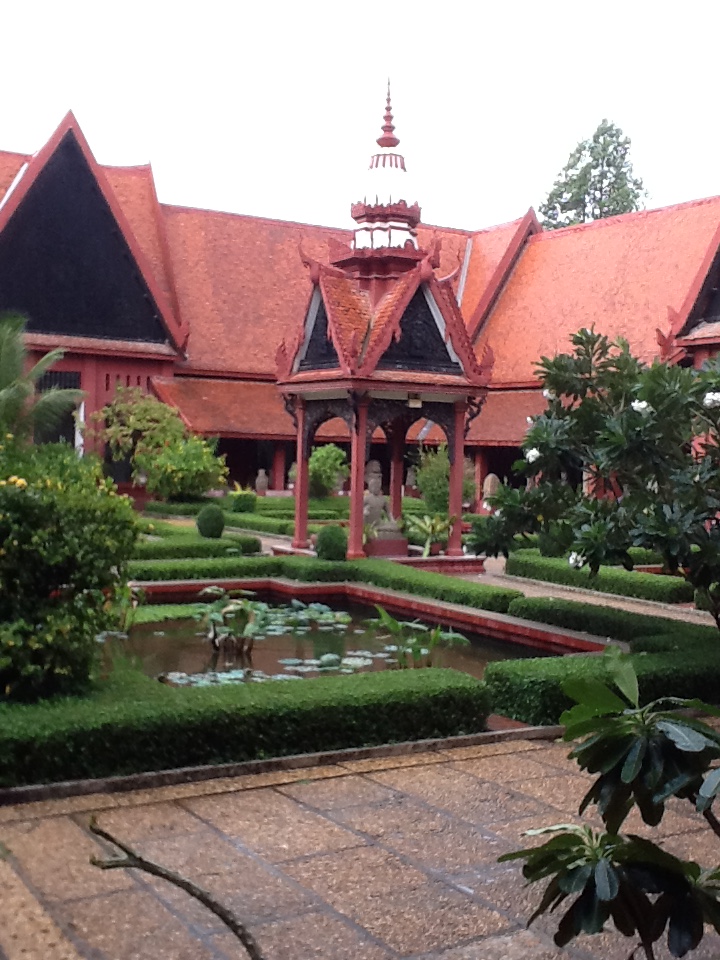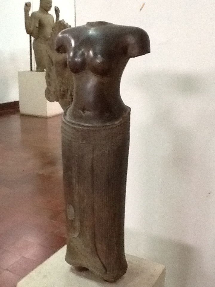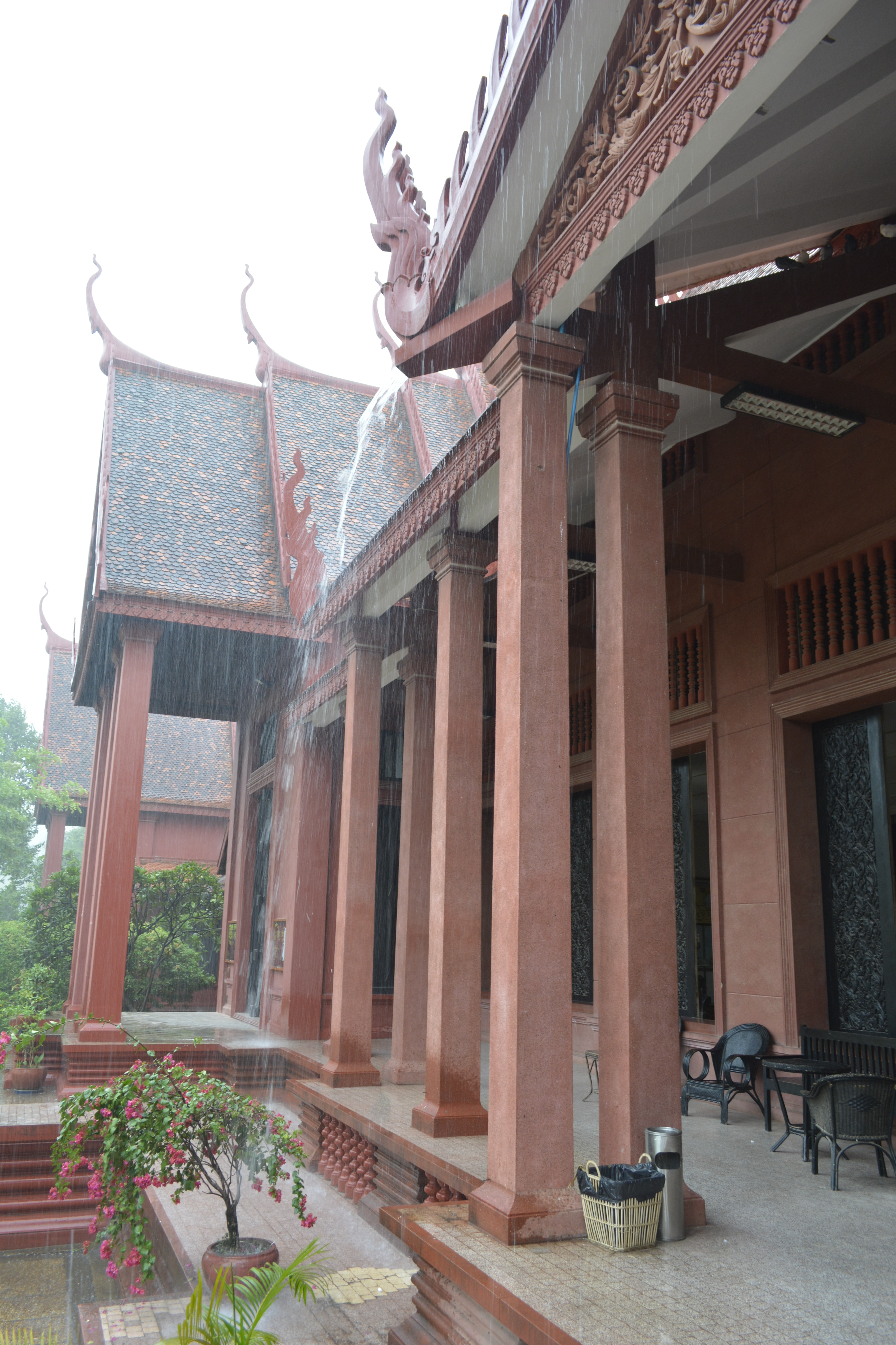 The museum itself is still wonderful with excellent pieces of ancient Khmer art, mostly in the form of sculpture. It just begins to rain as I arrived and it comes down in buckets– cascading off the steep, slanted roofs in rivers splashing on the ground below. It is an experience in meditation sitting next to the courtyard listening to the rain fall in concert with the man-made fountains trickling away.